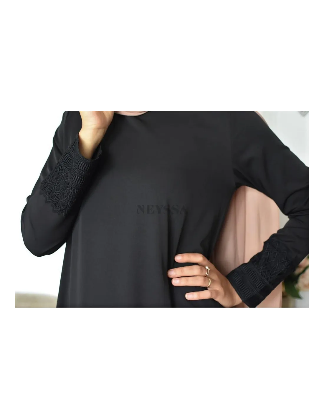 Grand évasement 2 poches fonctionnelles et finitions dentelles aux manches qui font tout le charme de cette pièce indispensable.