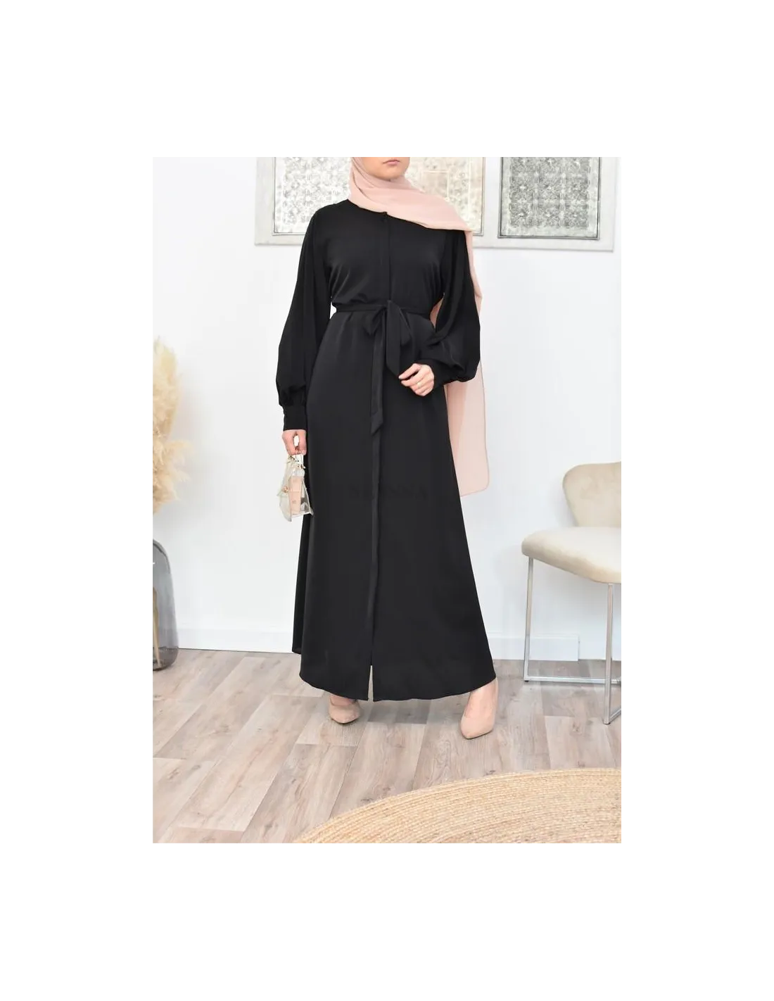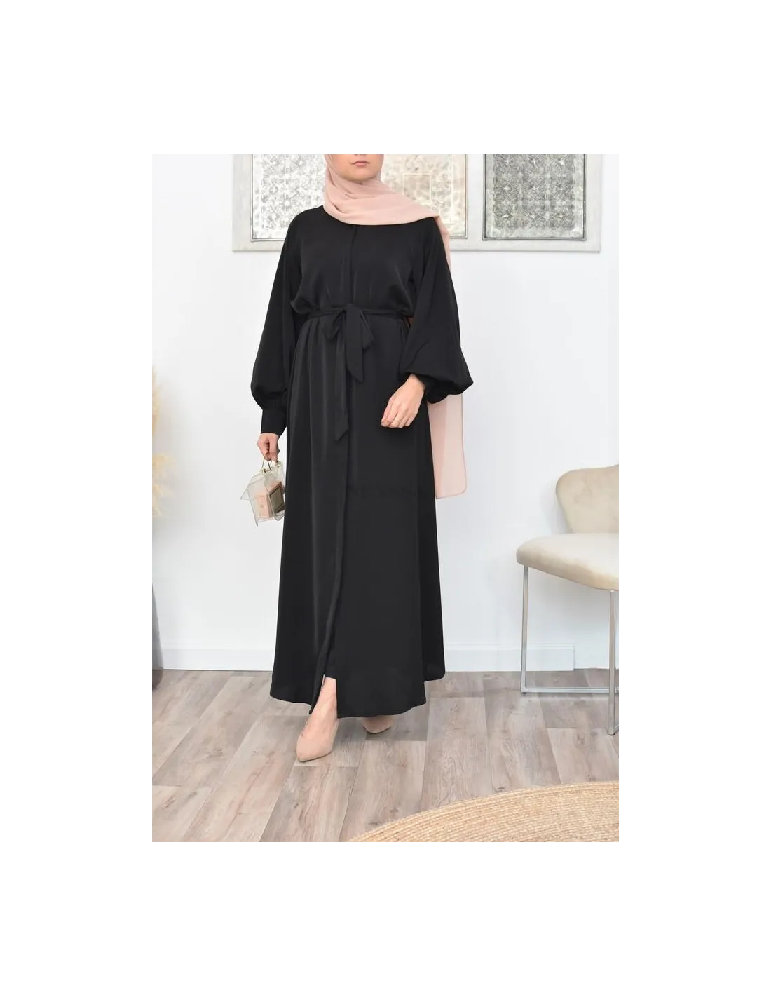 Son col rond et ses manches ballons élastiquées permettent de porter la abaya de diverses manières ouverte ou fermée selon les envies.