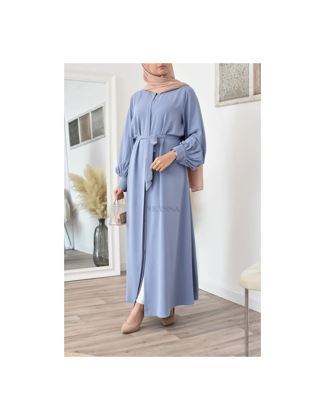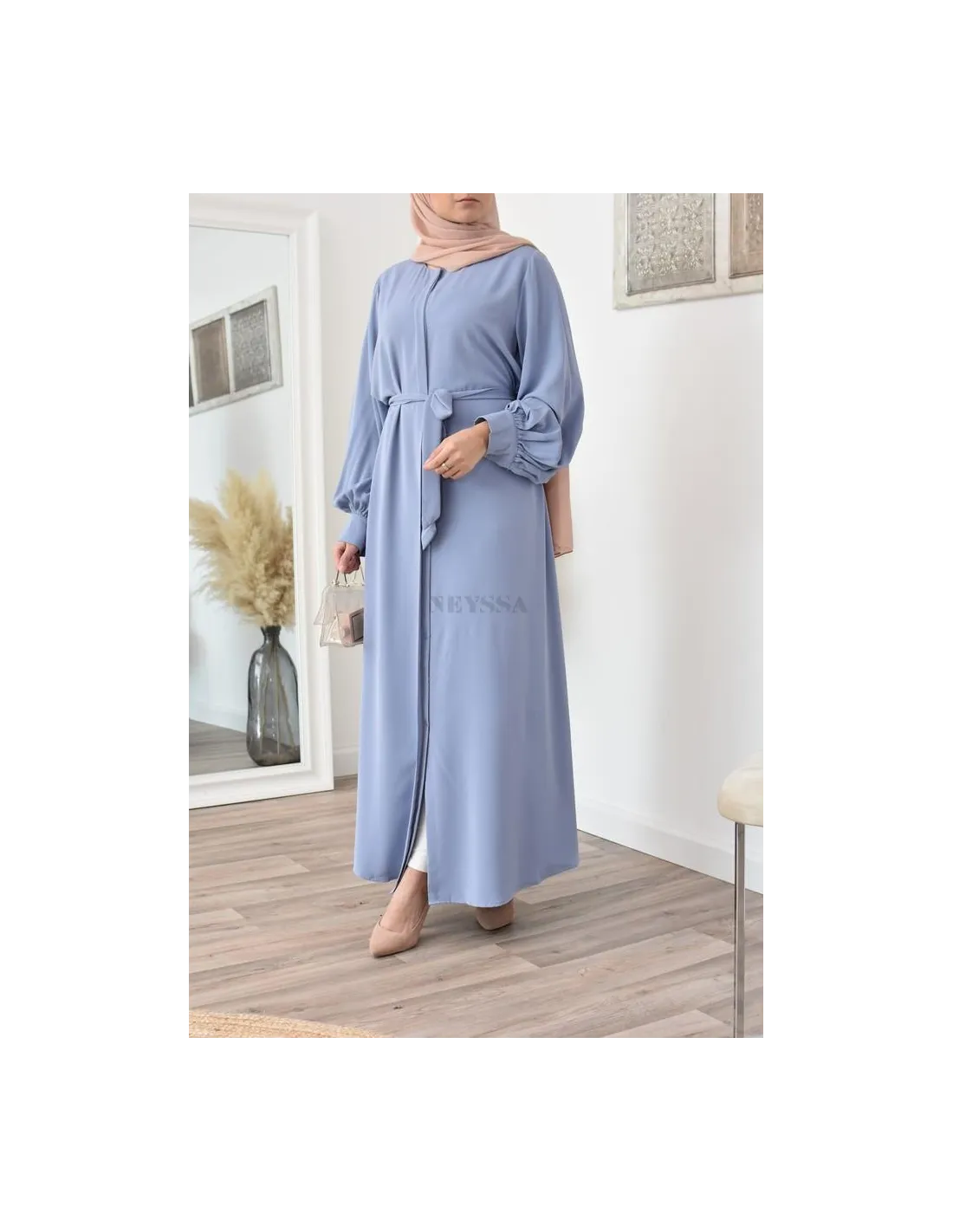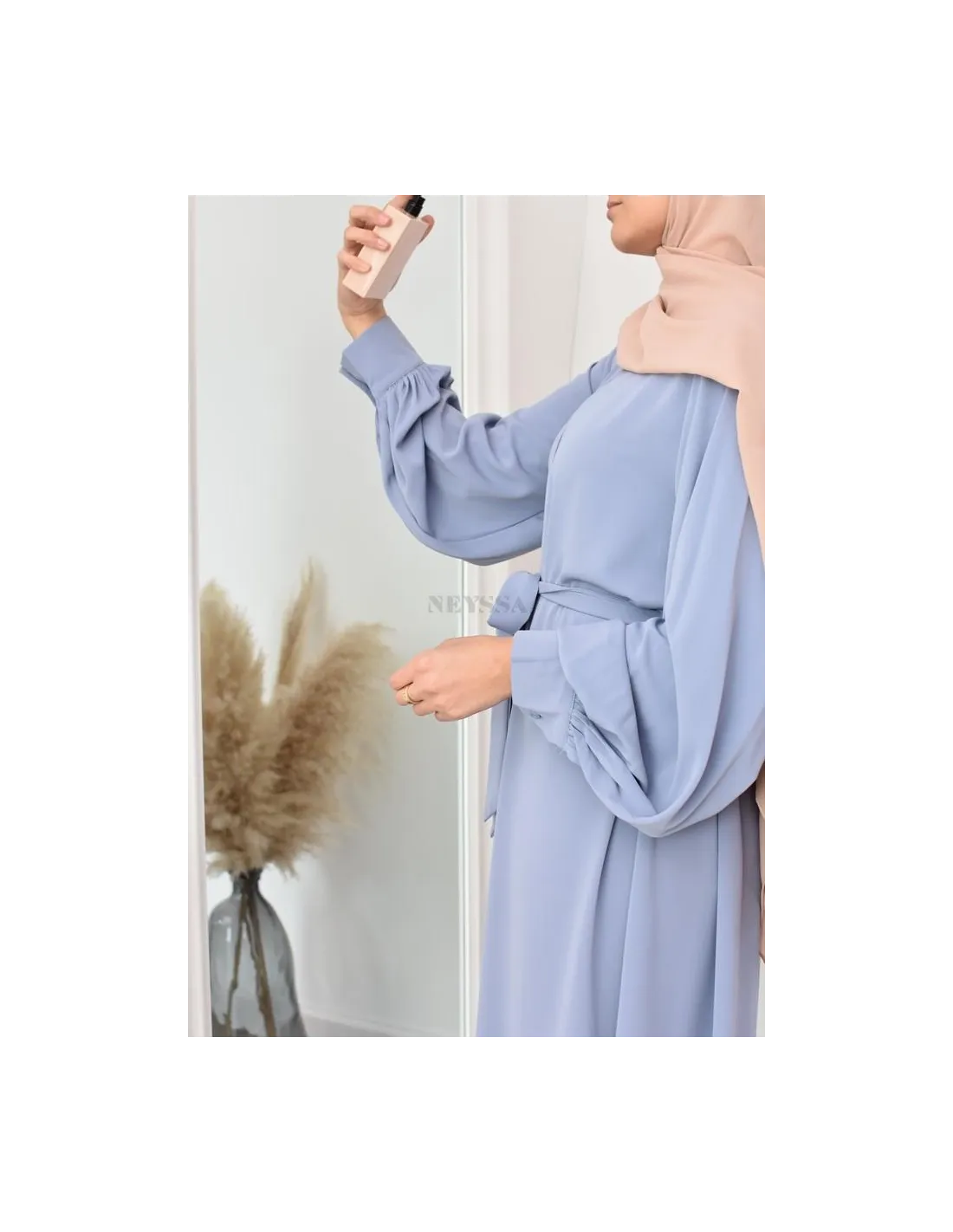 Son col rond et ses manches ballons élastiquées permettent de porter la abaya de diverses manières ouverte ou fermée selon les envies.