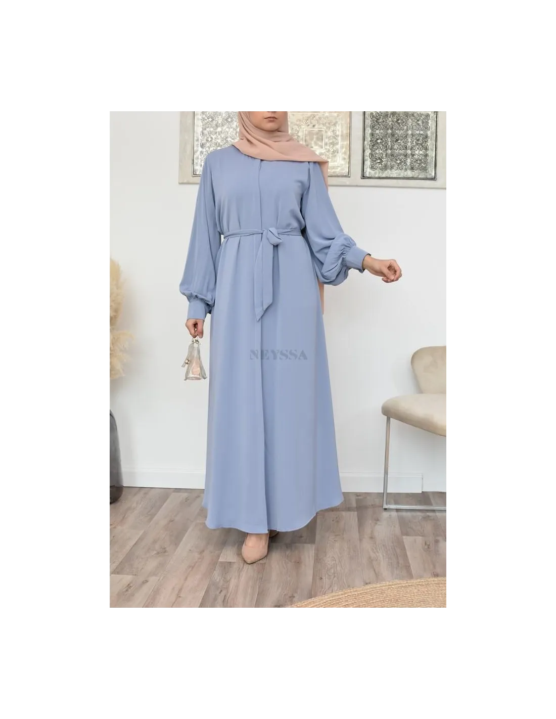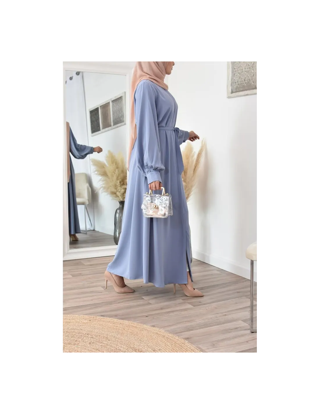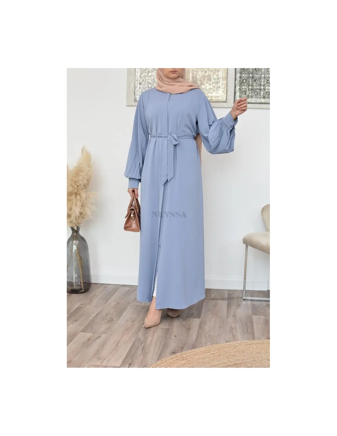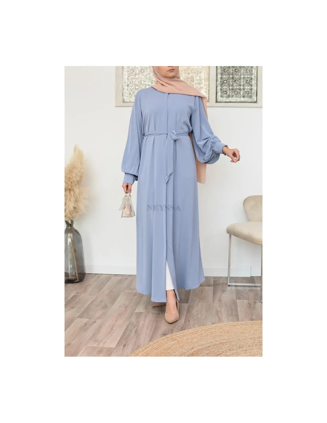 Son col rond et ses manches ballons élastiquées permettent de porter la abaya de diverses manières ouverte ou fermée selon les envies.