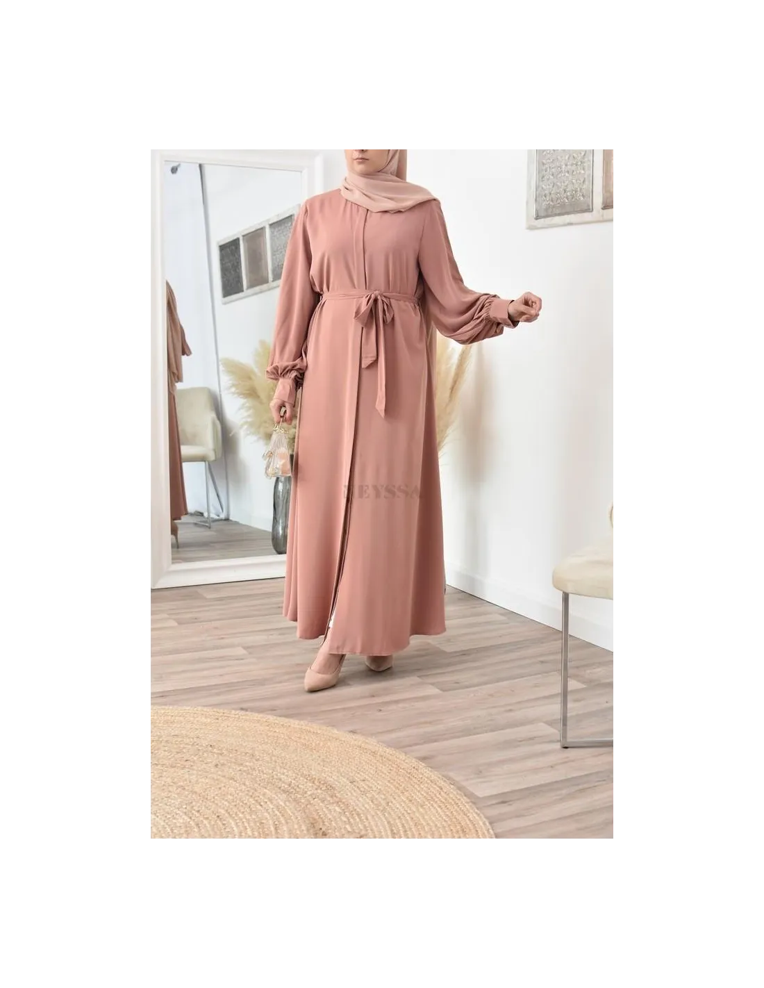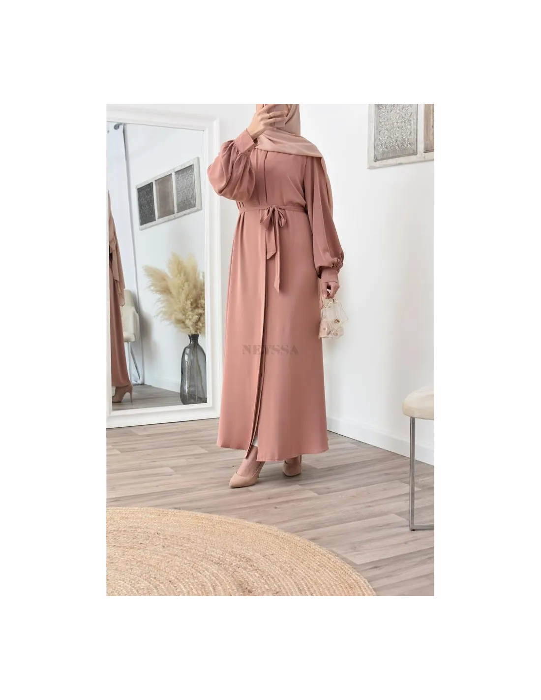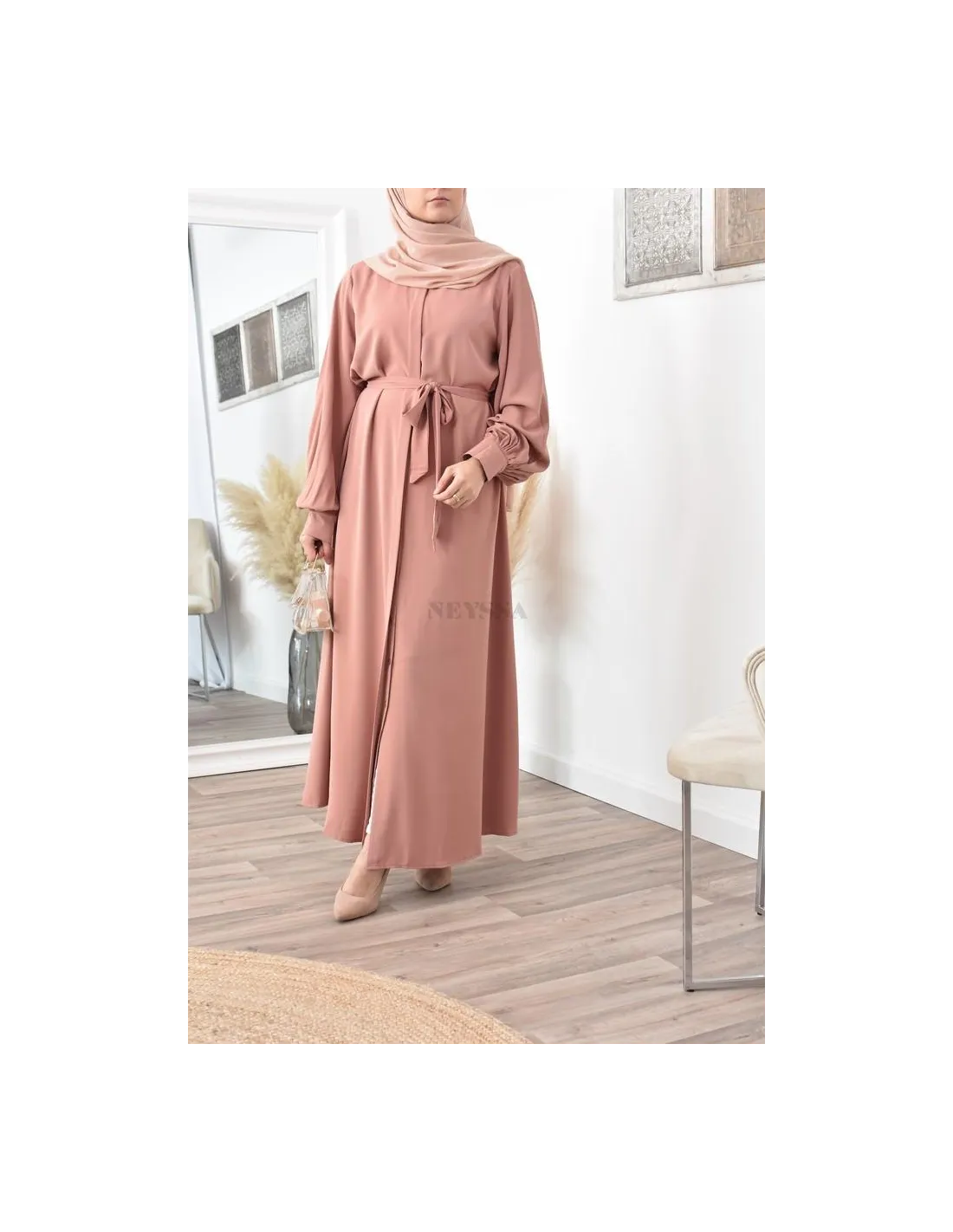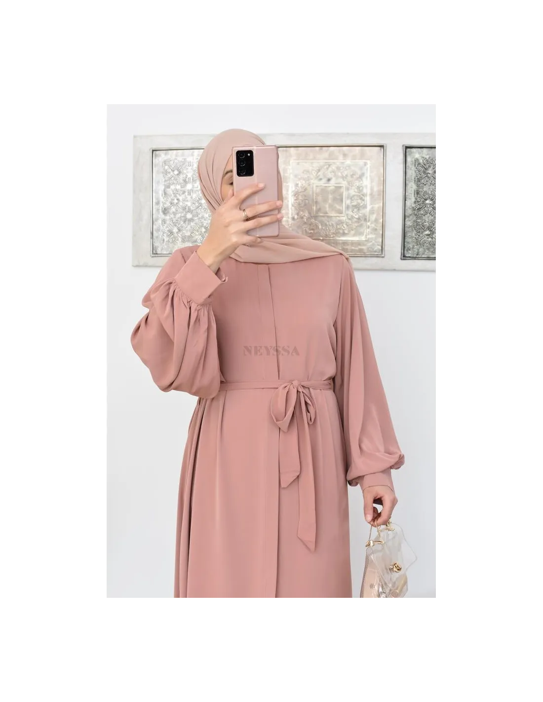 Son col rond et ses manches ballons élastiquées permettent de porter la abaya de diverses manières ouverte ou fermée selon les envies.