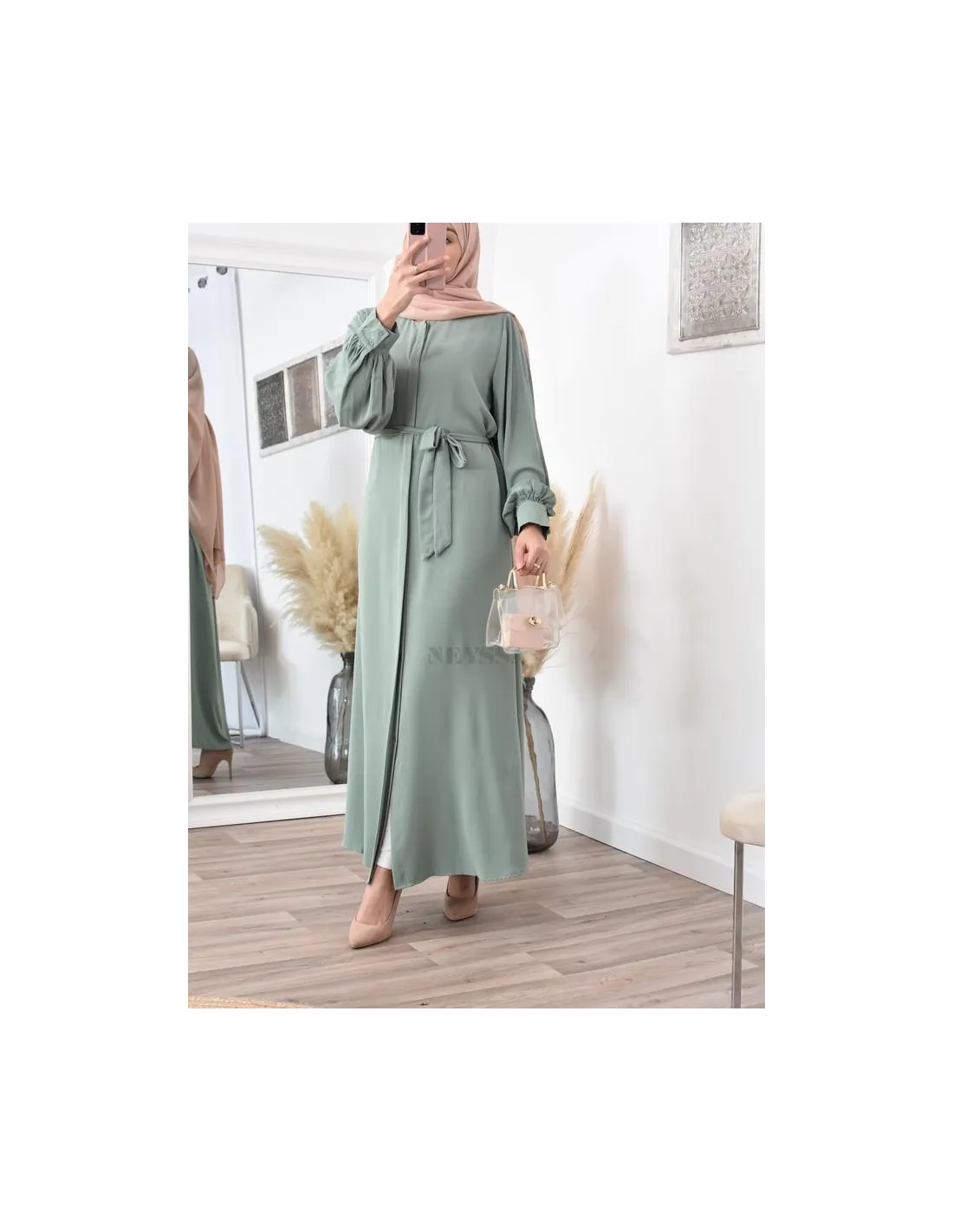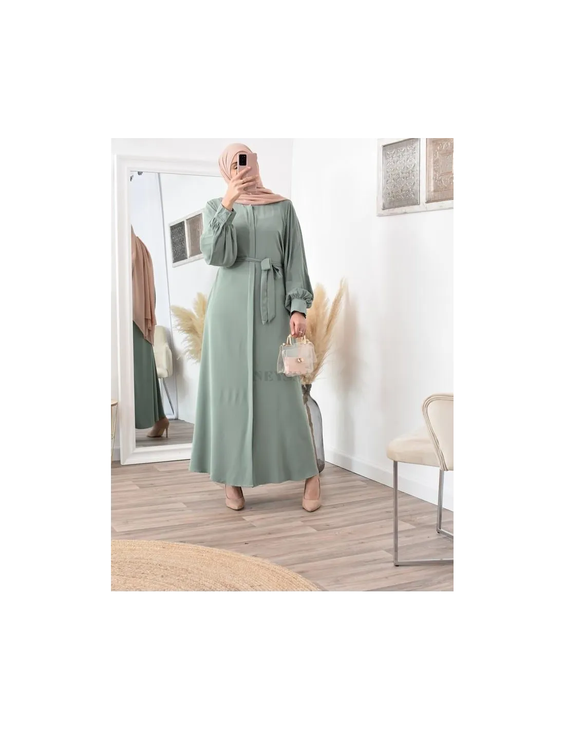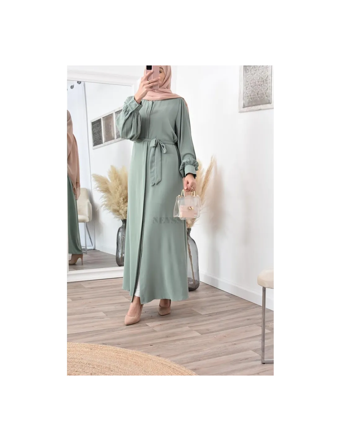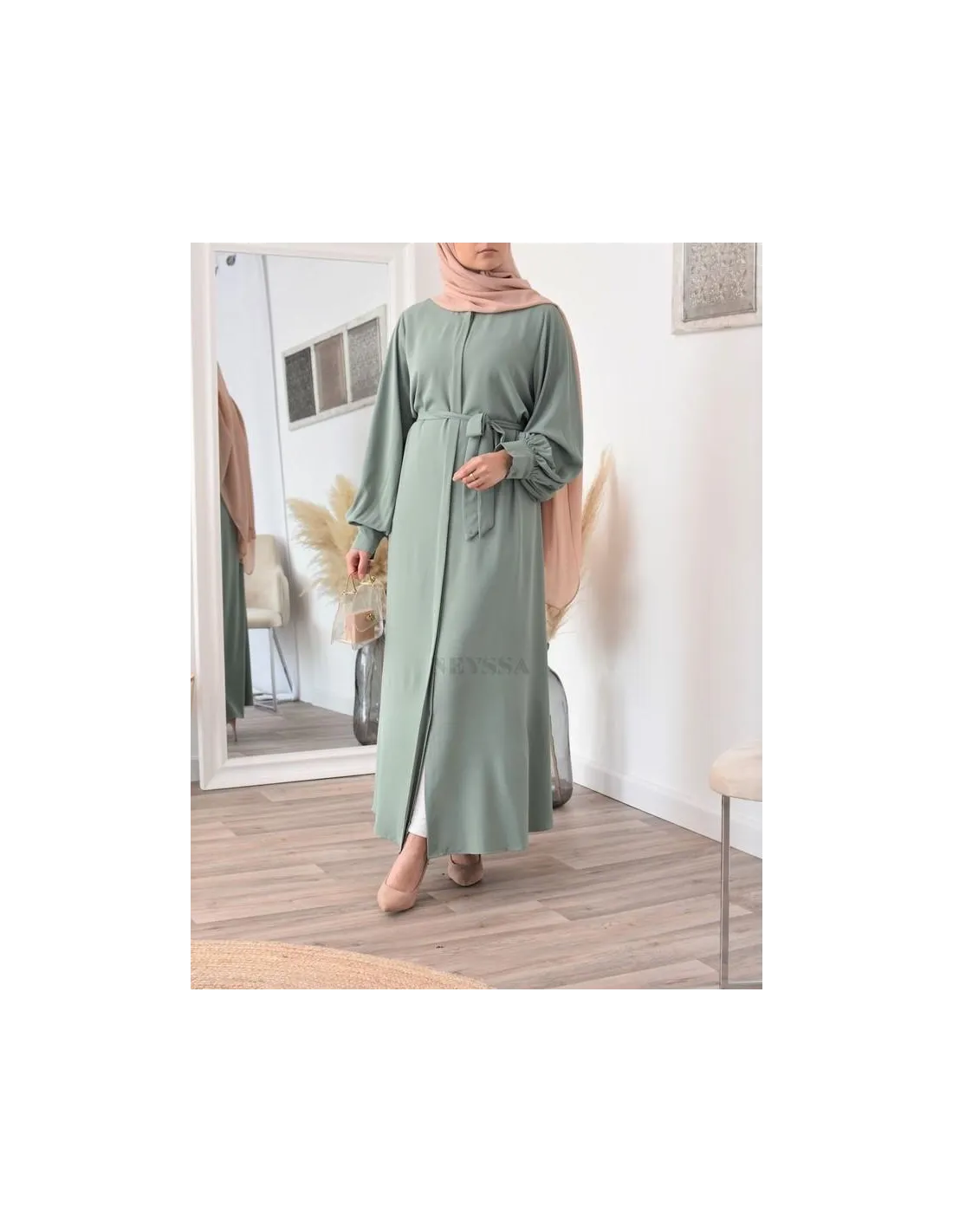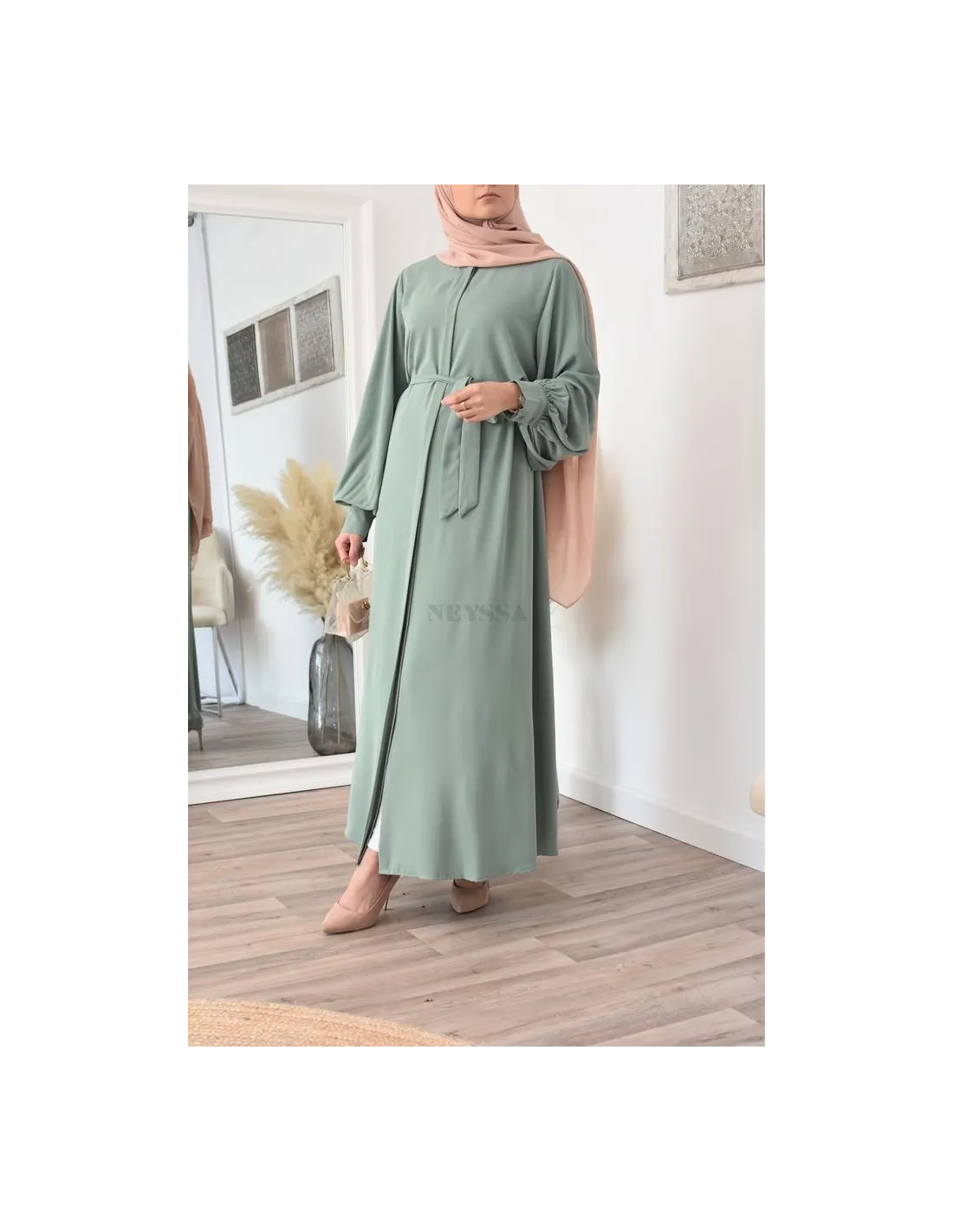Son col rond et ses manches ballons élastiquées permettent de porter la abaya de diverses manières ouverte ou fermée selon les envies.