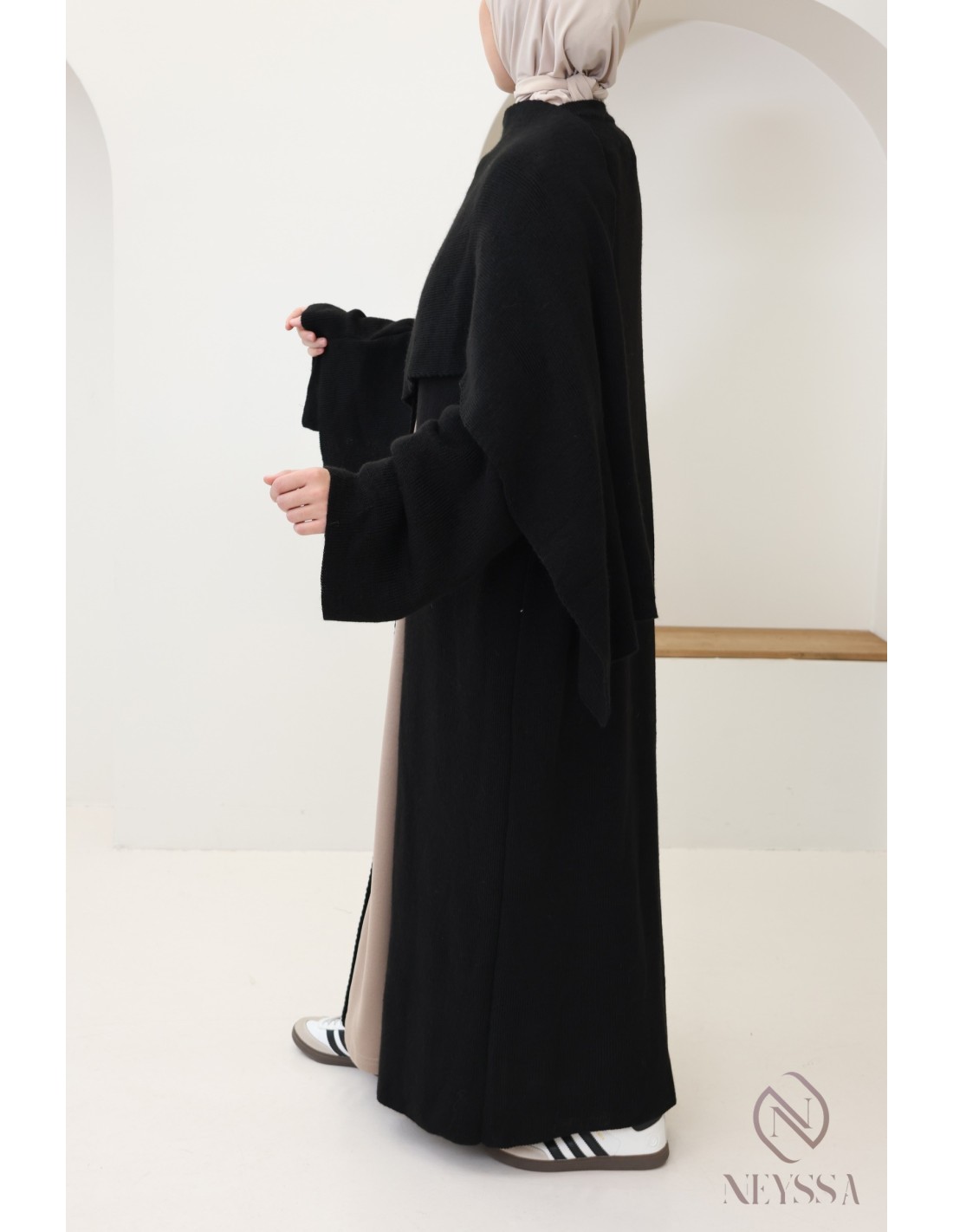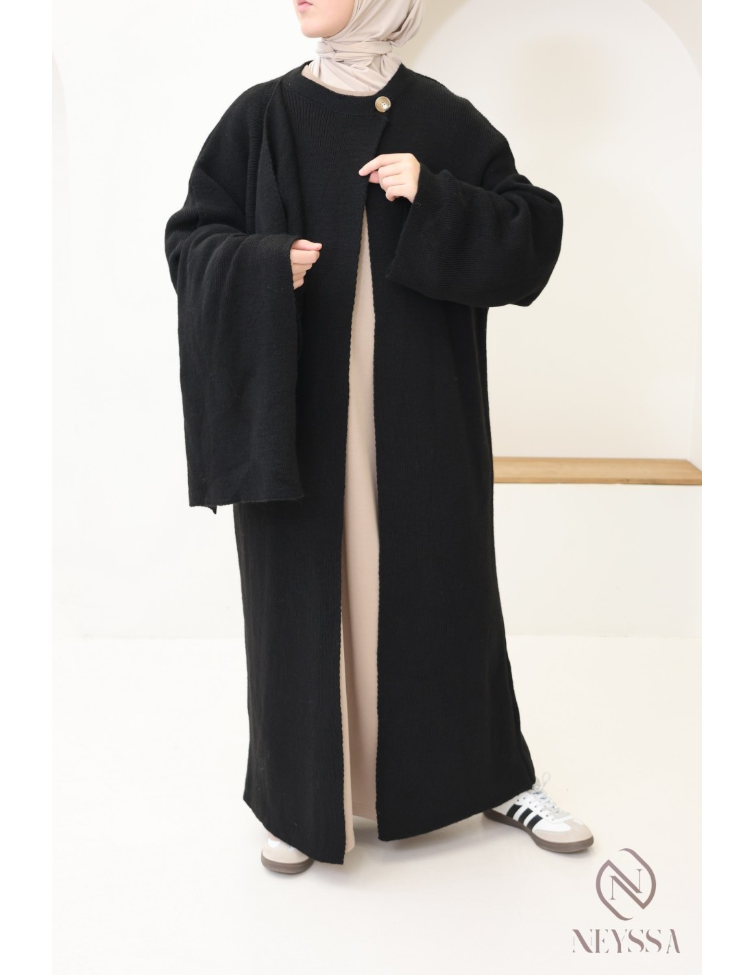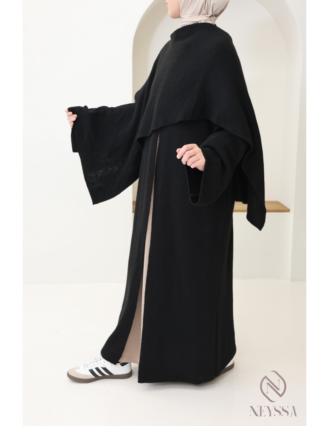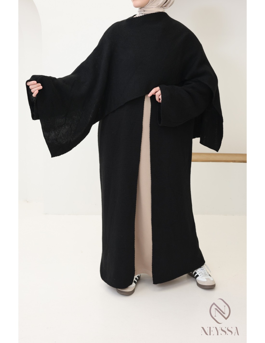Voici ce superbe gilet long en maille, à la fois simple et moderne. C'est la pièce essentielle pour rester élégante et confortable tout au long de la saison froide. Ce gilet cape intégrée est conçu pour répondre à vos besoins de chaleur, de style et de modestie, et est idéale pour les femmes voilées.