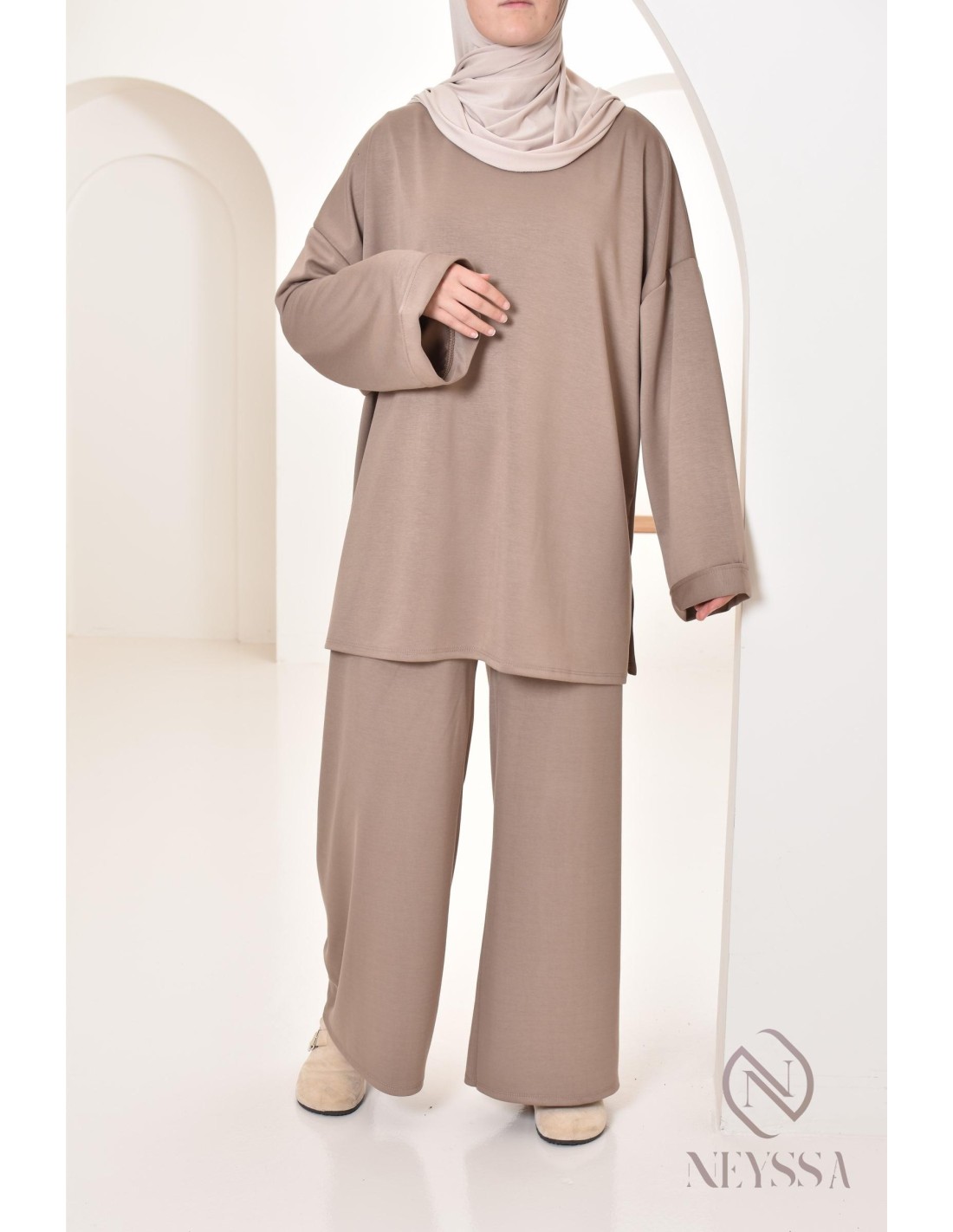 • Coupe : La longueur mi-longue et la coupe ample permettent de flatter toutes les morphologies. Cet ensemble crée une silhouette équilibrée, tout en respectant les exigences d'une tenue modeste.
