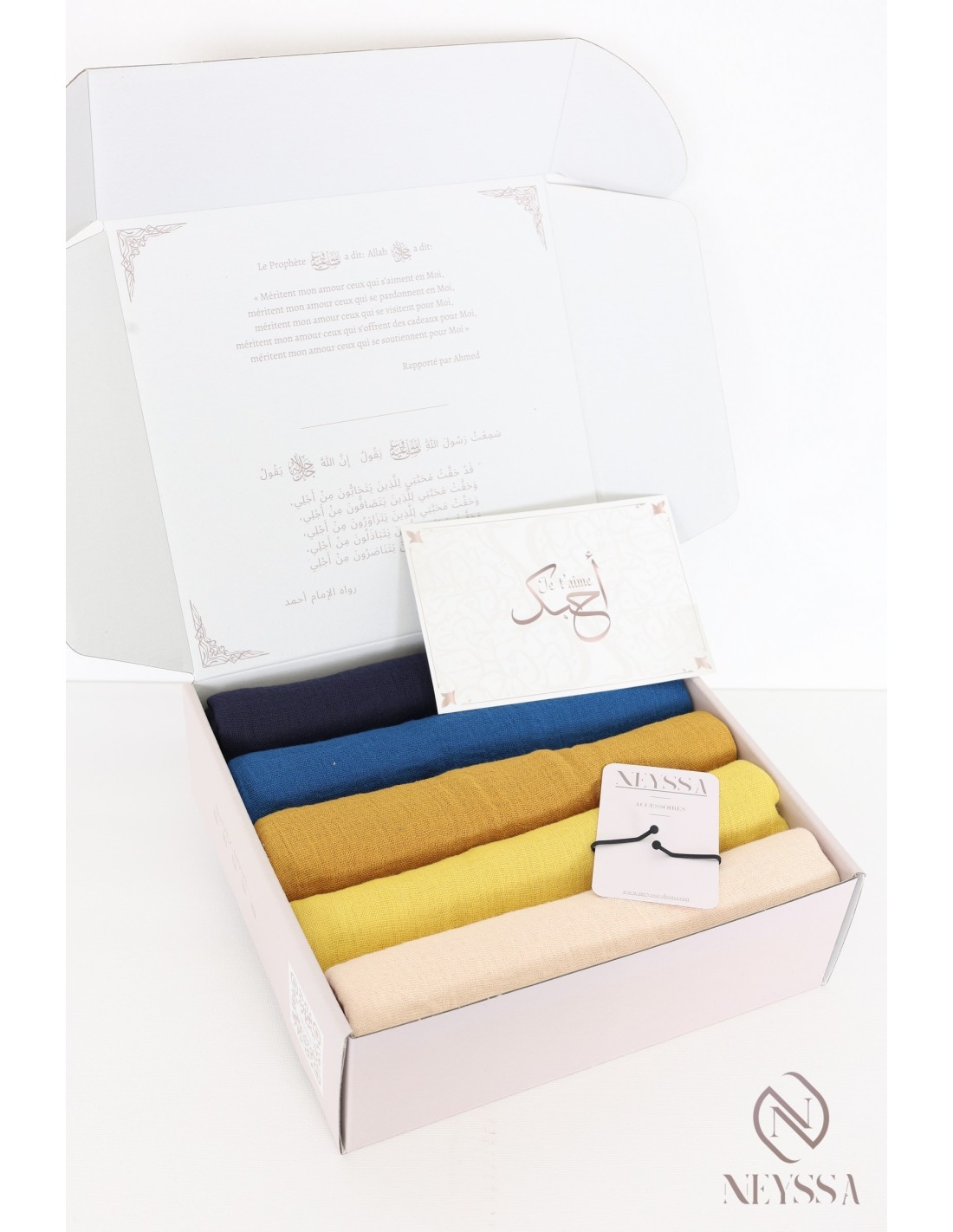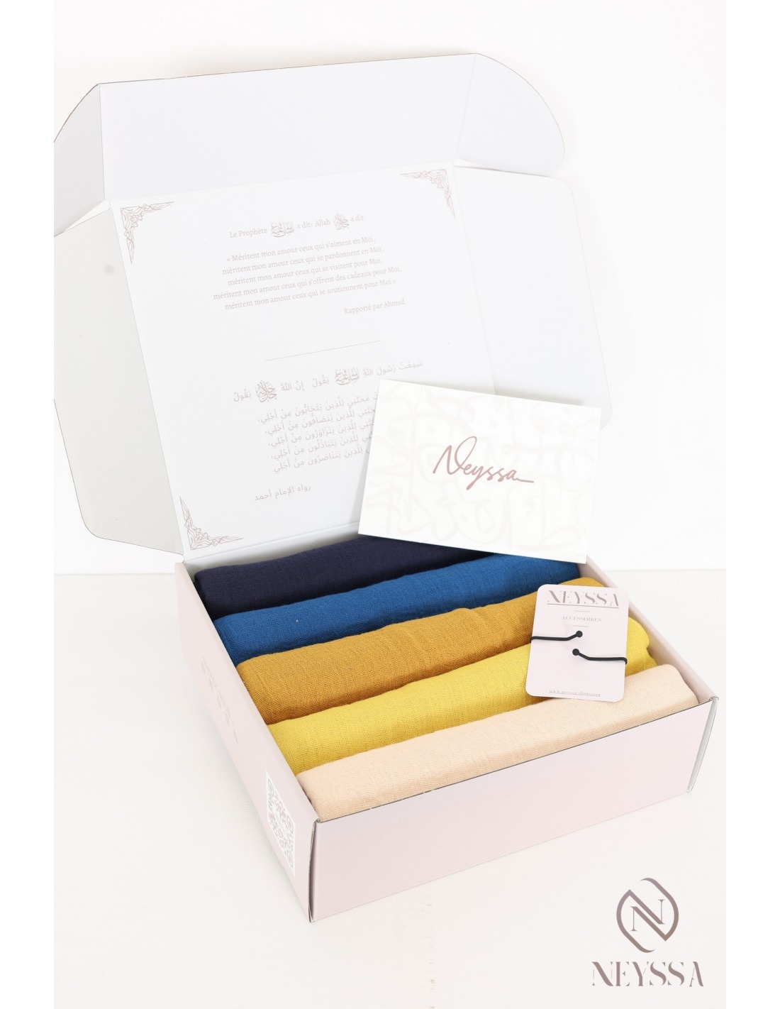 Cette box hijab griffée Neyssa se compose de 5 hijabs soigneusement assortis pour un joli rendu effet surprise garanti!