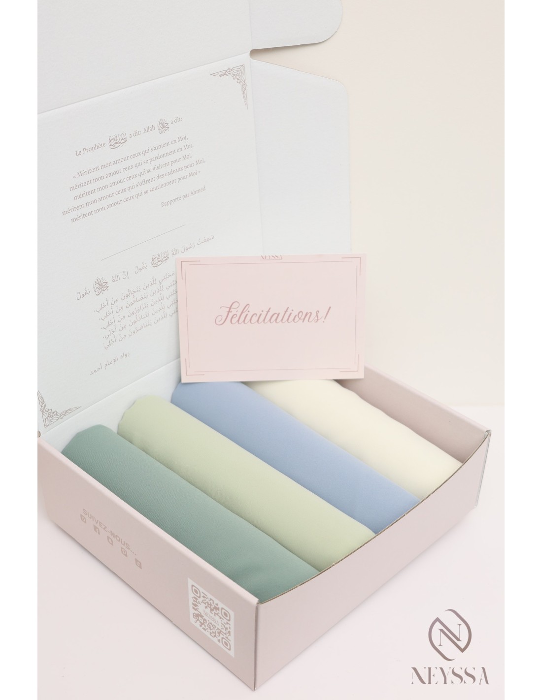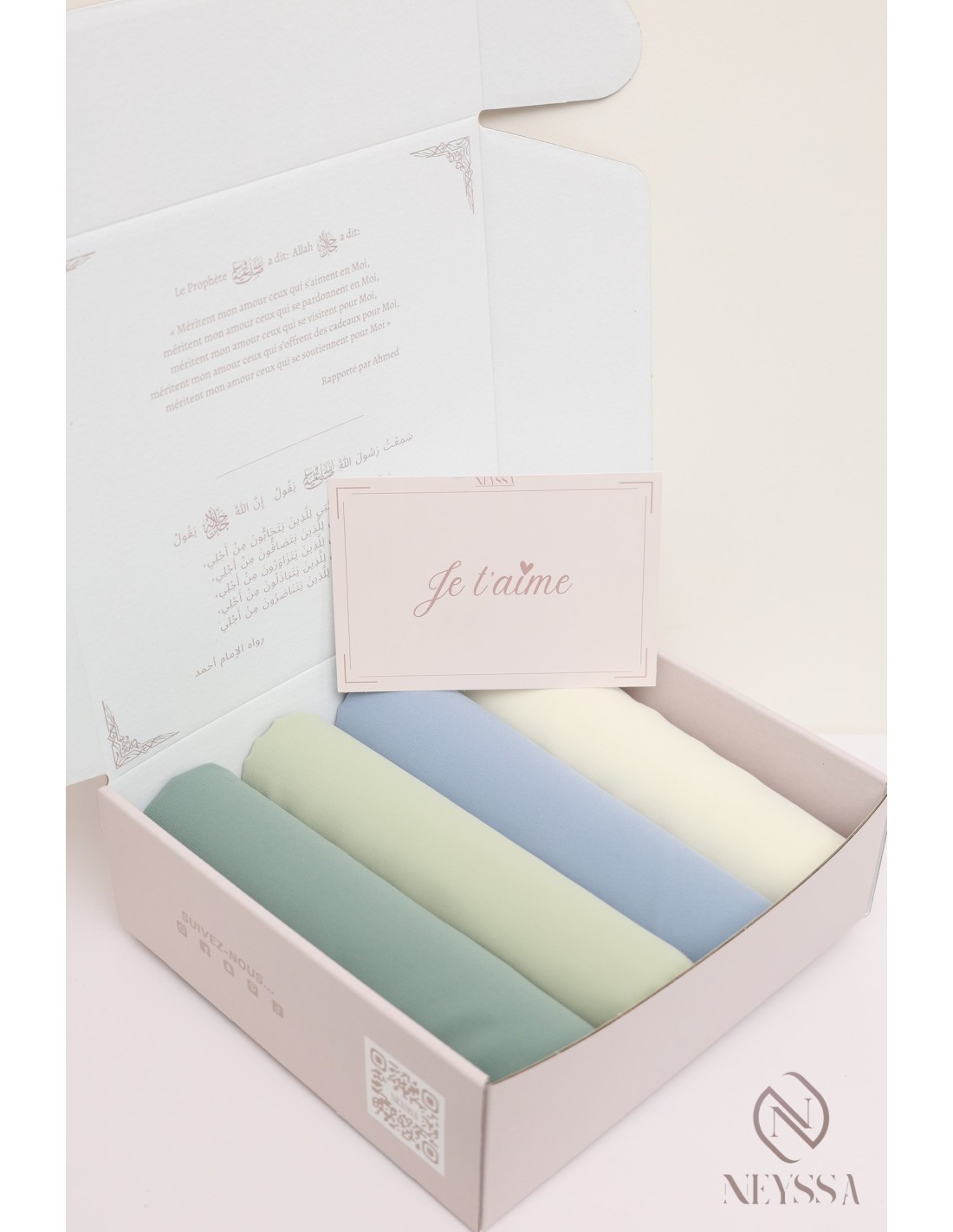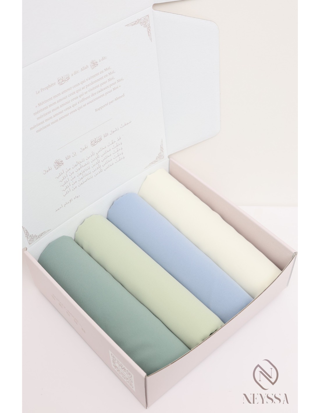 - Hijab coffret Soie de Médine, Vert Empire, Sauge, Bleu Orage, Vanilla
