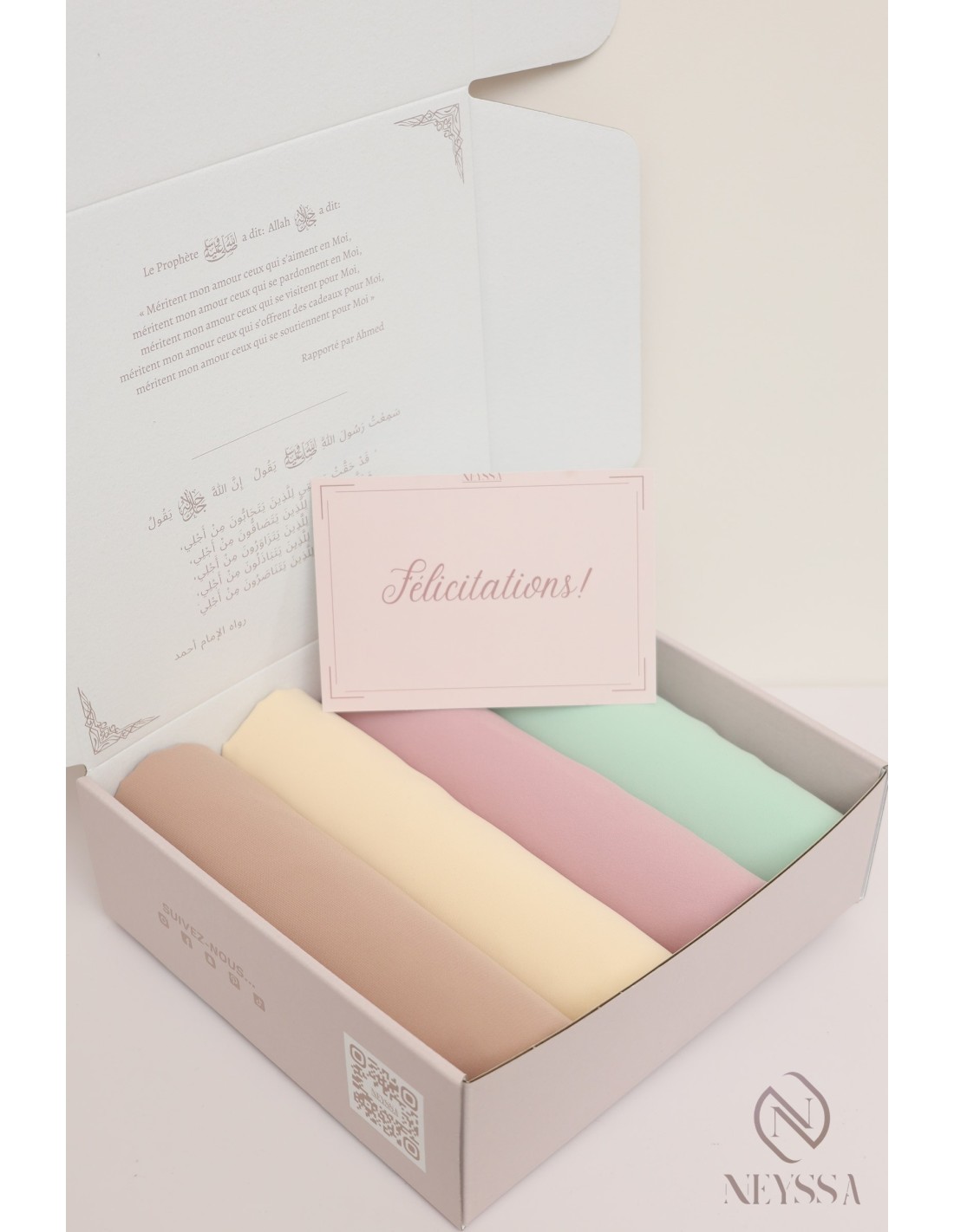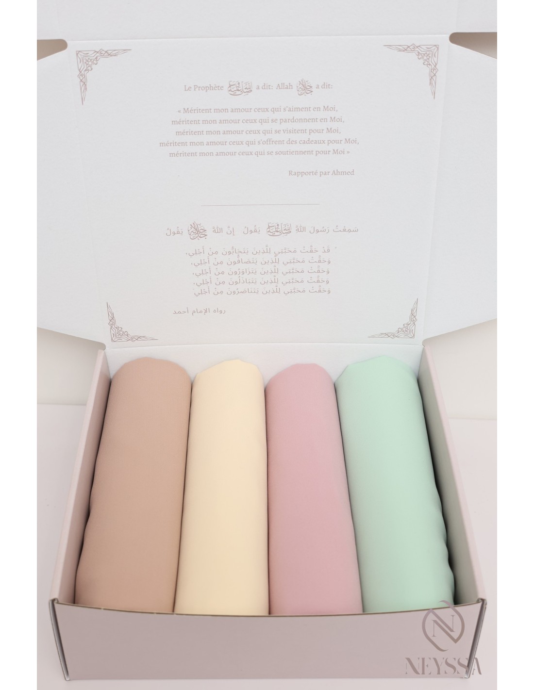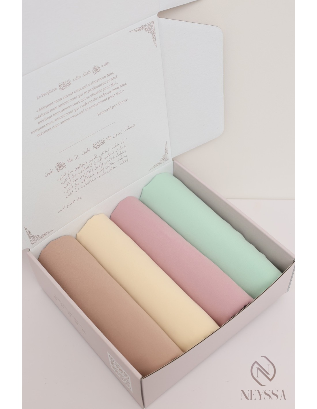 Coffret prêt à offrir : Présenté dans une boîte griffée Neyssa, ce coffret élégant est prêt à être offert. Chaque hijab est délicatement emballé dans du papier de soie, ajoutant une touche de raffinement à votre cadeau.
