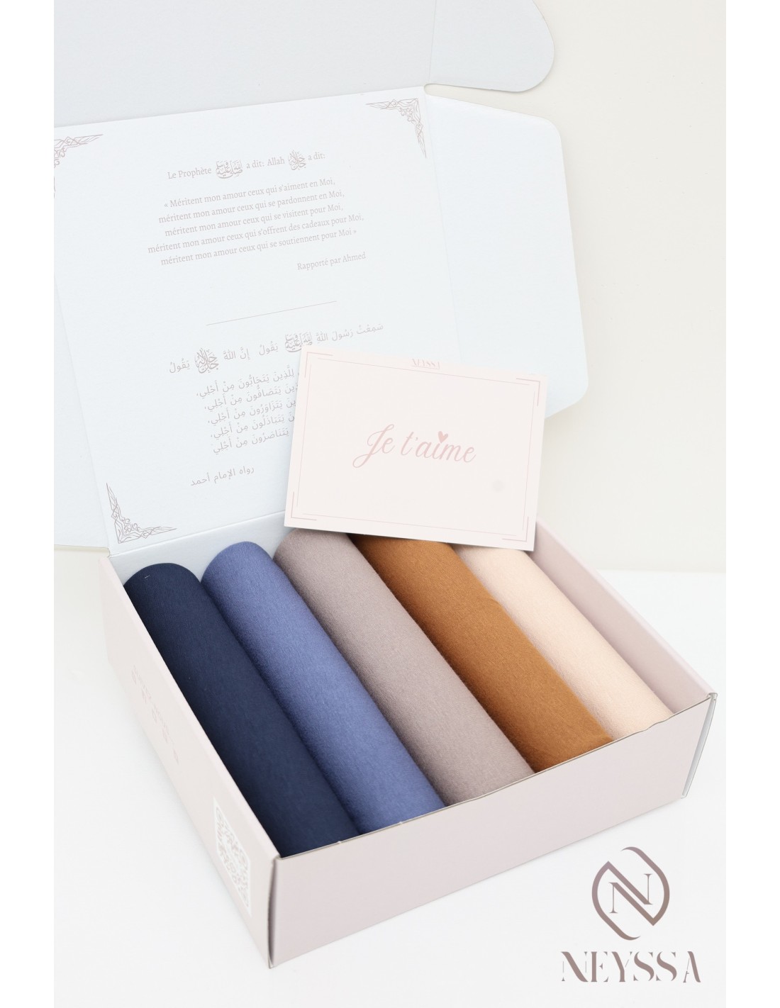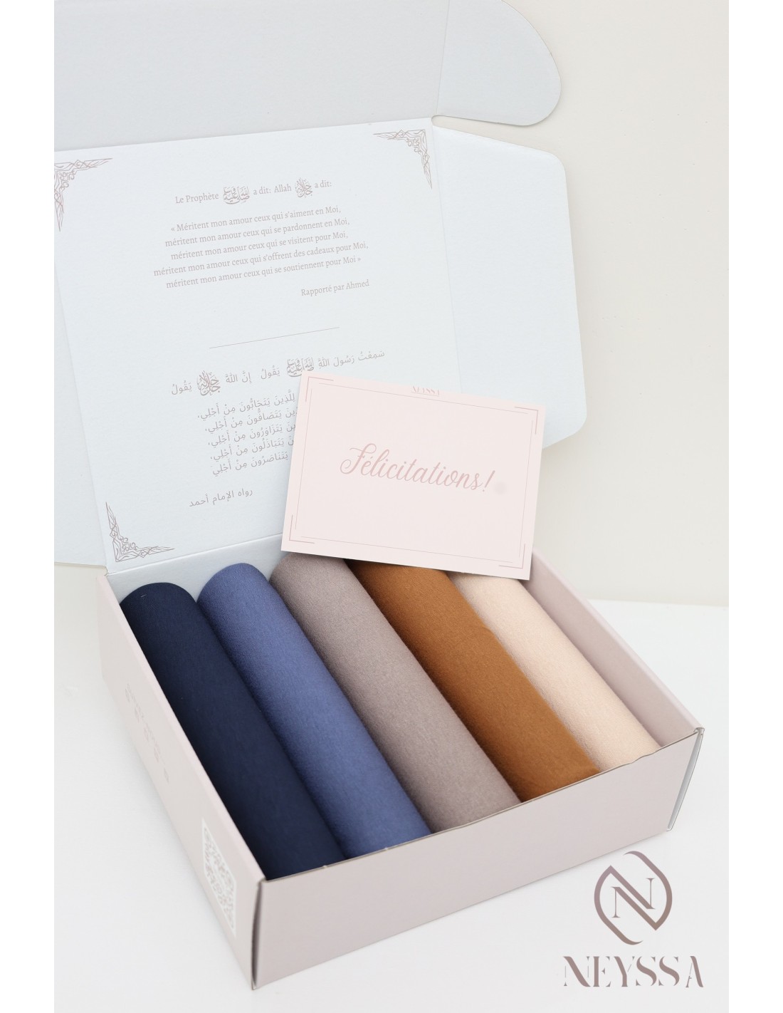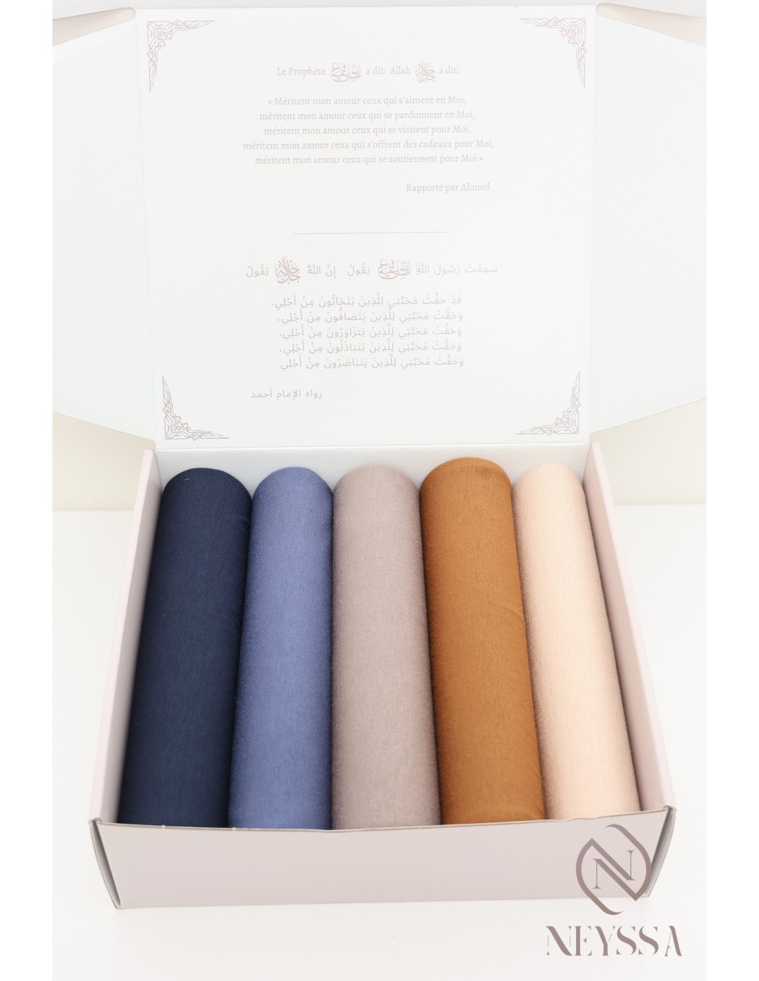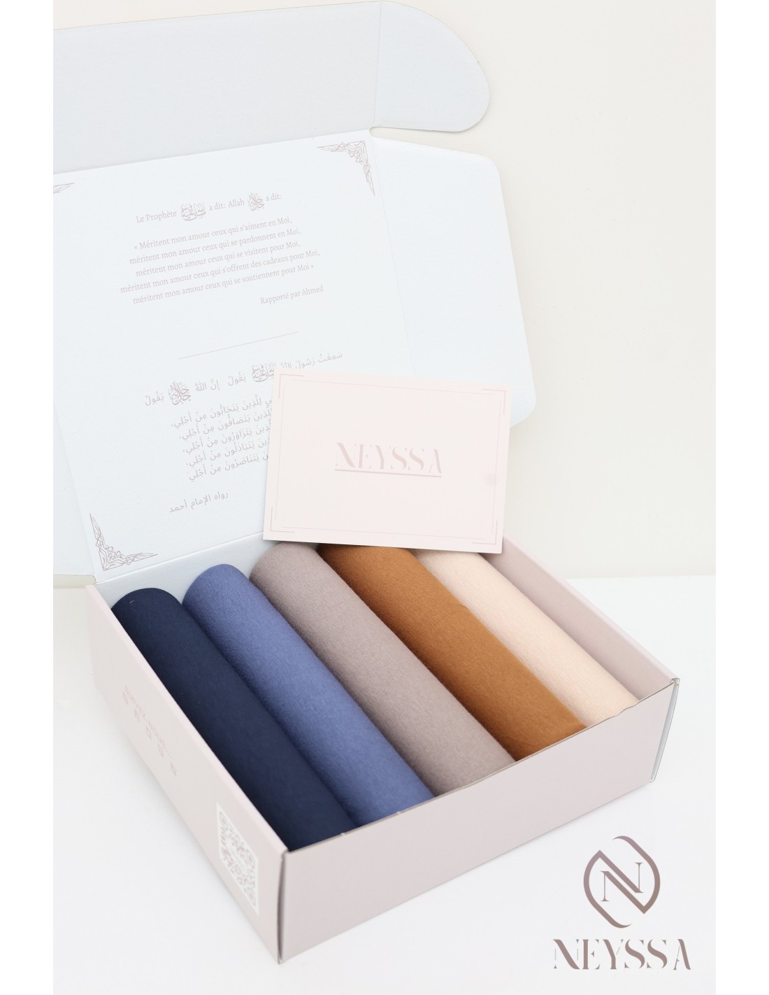 Vous la recevez dans une jolie boîte réutilisable avec le logo Neyssa, constitué de 5 hijabs enveloppés dans du papier de soie.