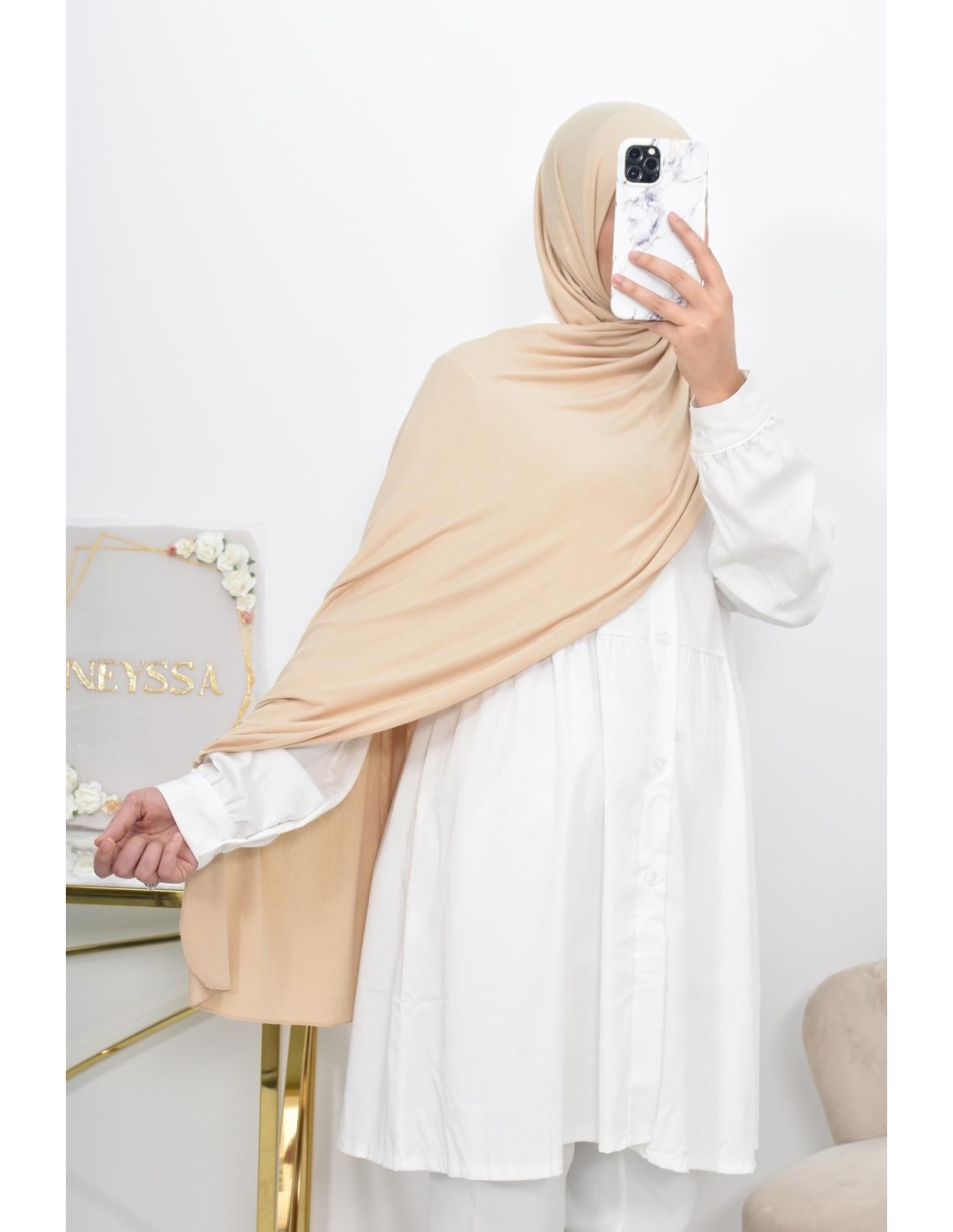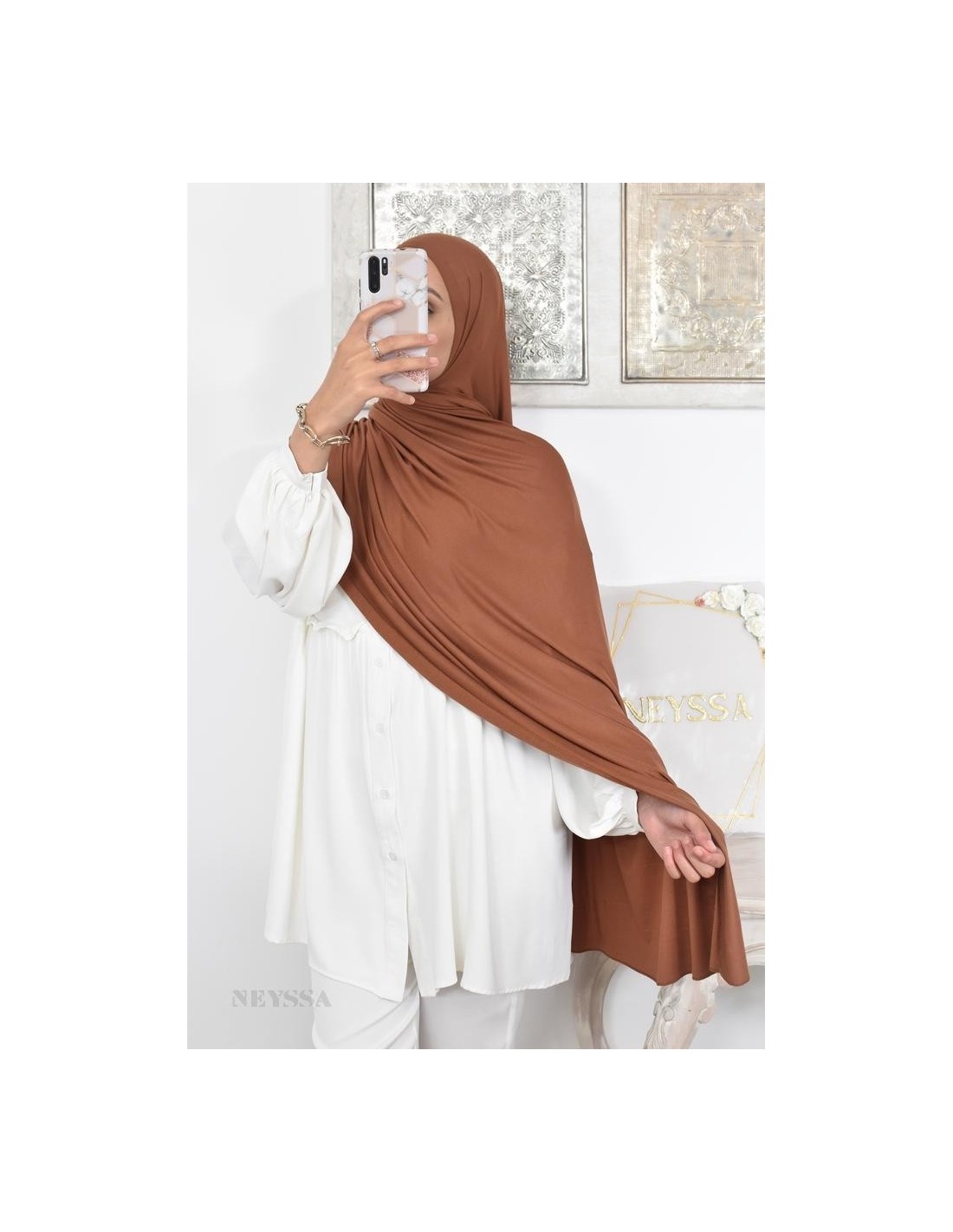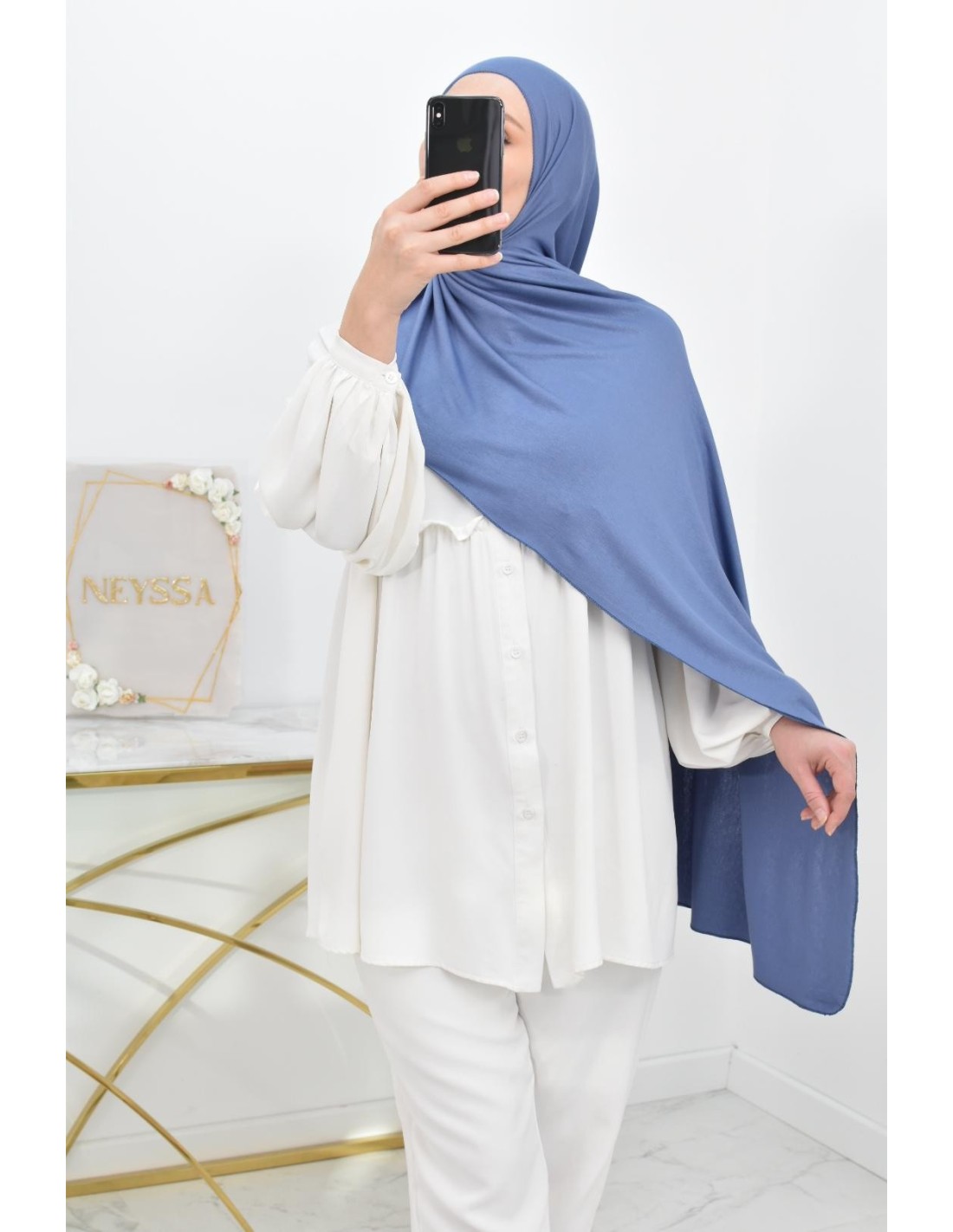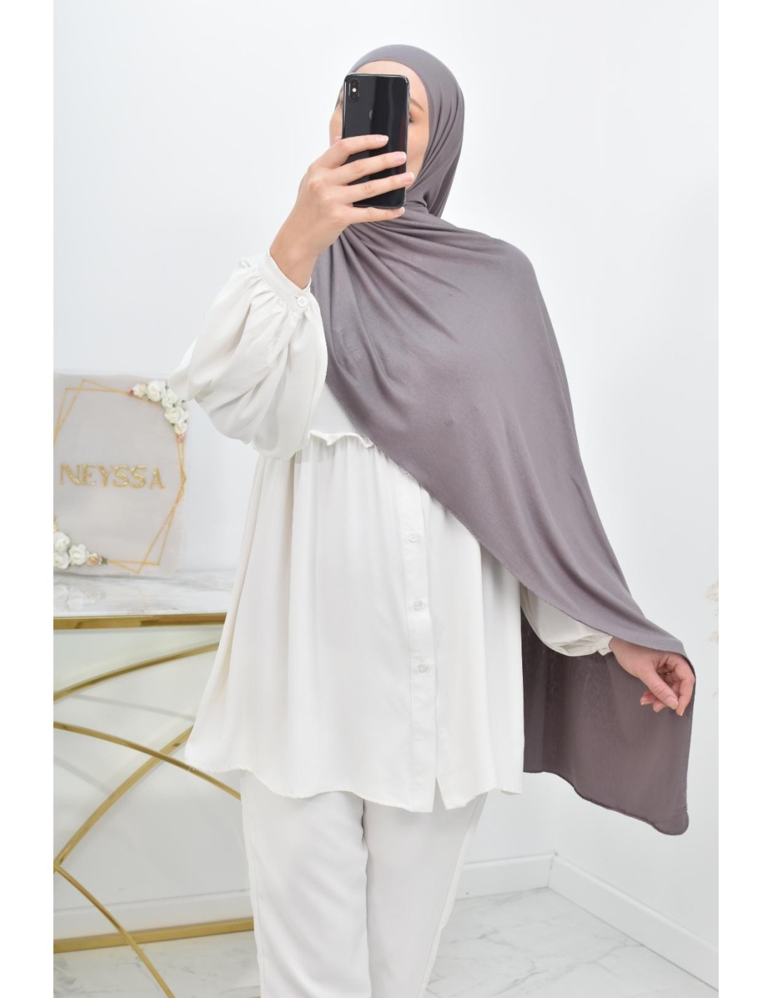 Vous la recevez dans une jolie boîte réutilisable avec le logo Neyssa, constitué de 5 hijabs enveloppés dans du papier de soie.
