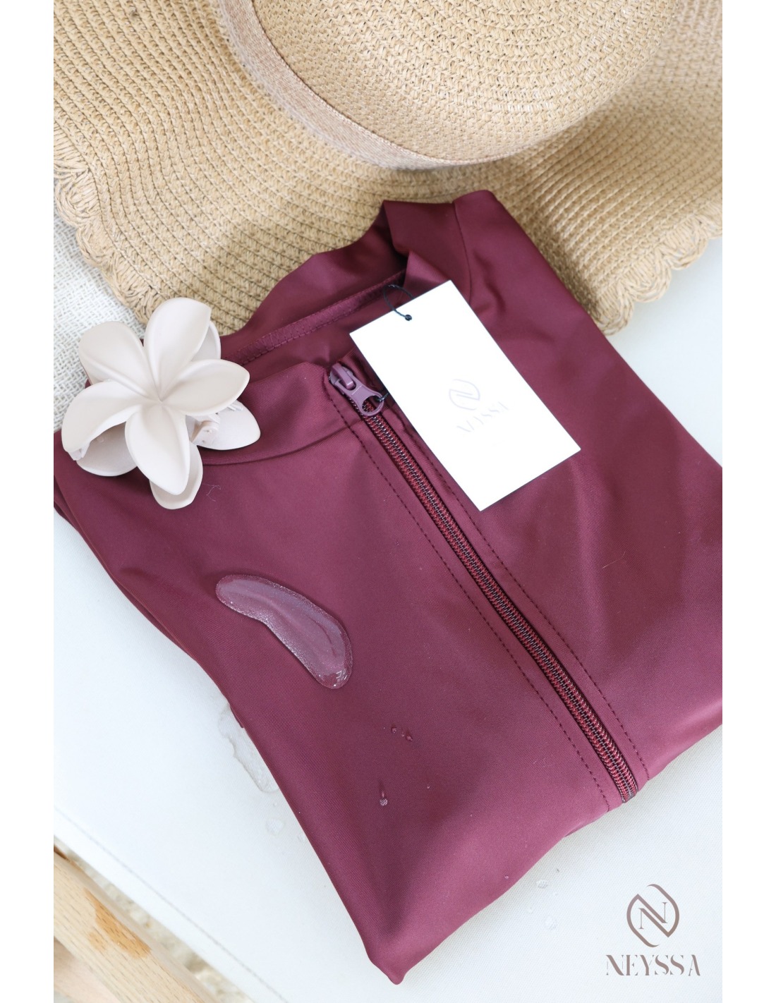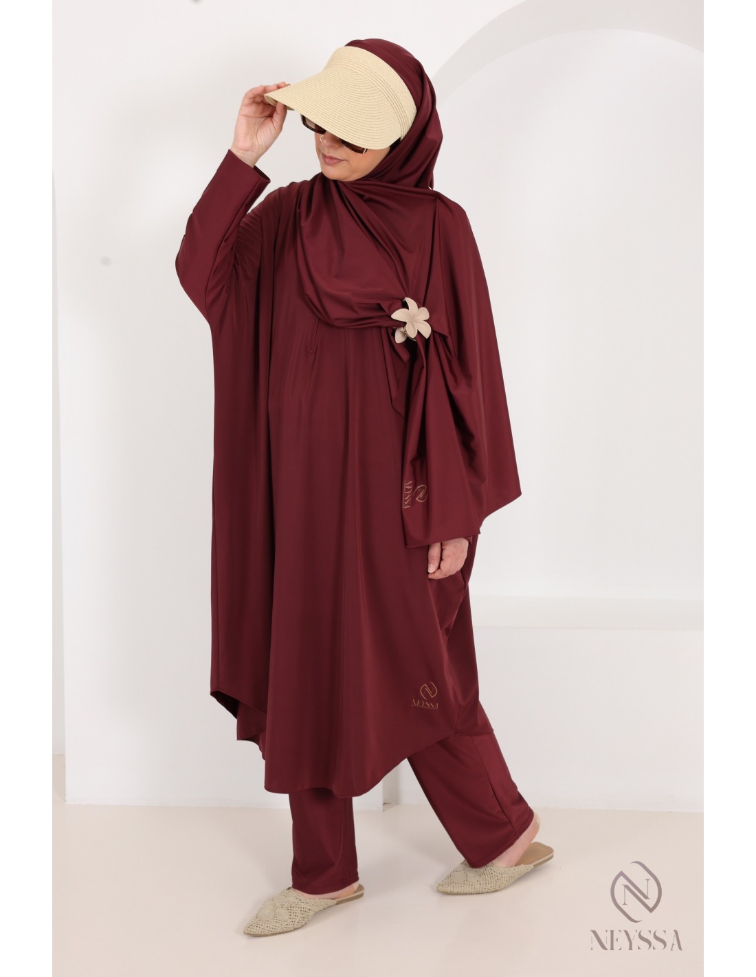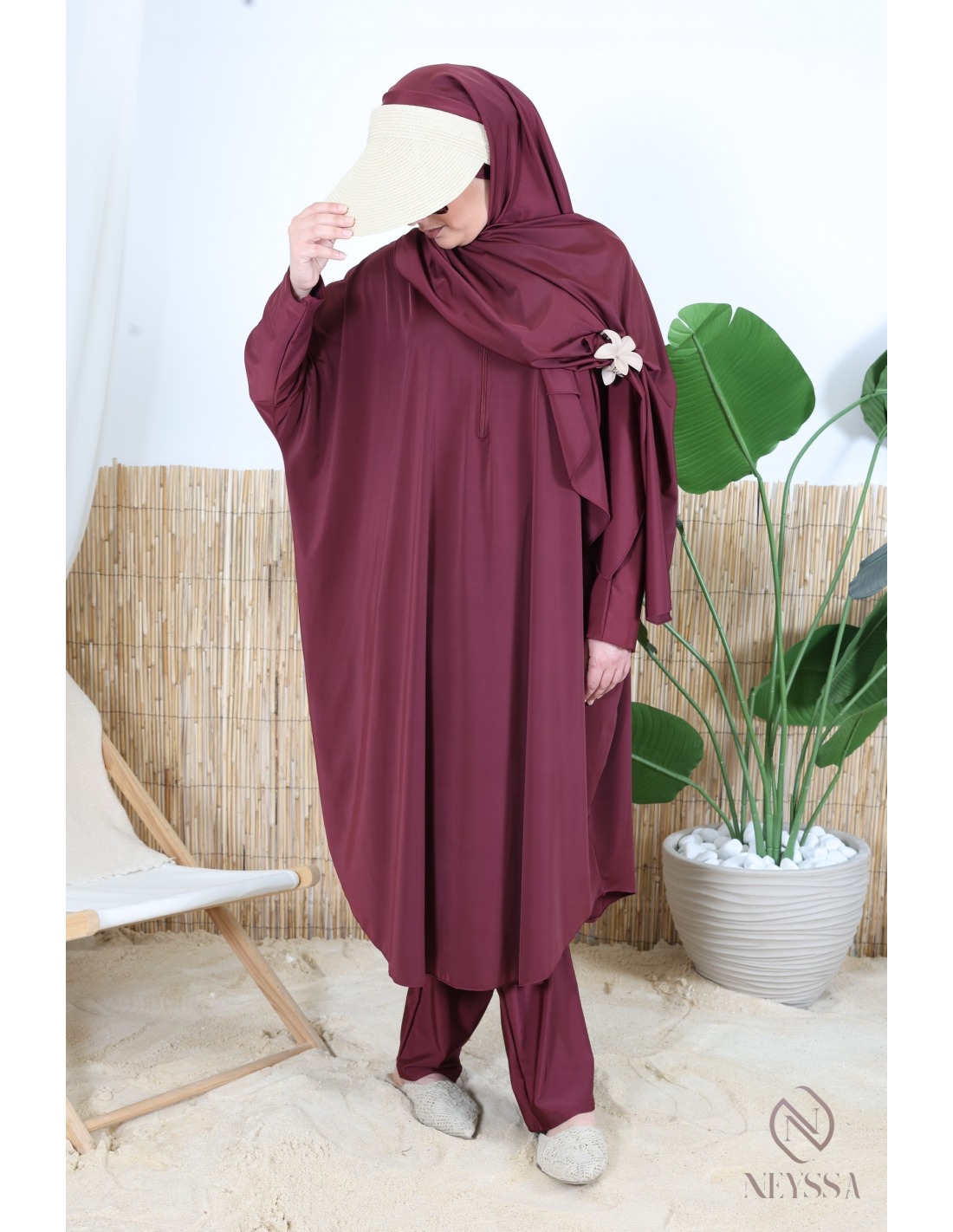 • Confection Neyssa : Ce burkini de bain haut de gamme a été confectionné dans nos ateliers avec un tissu de qualité.