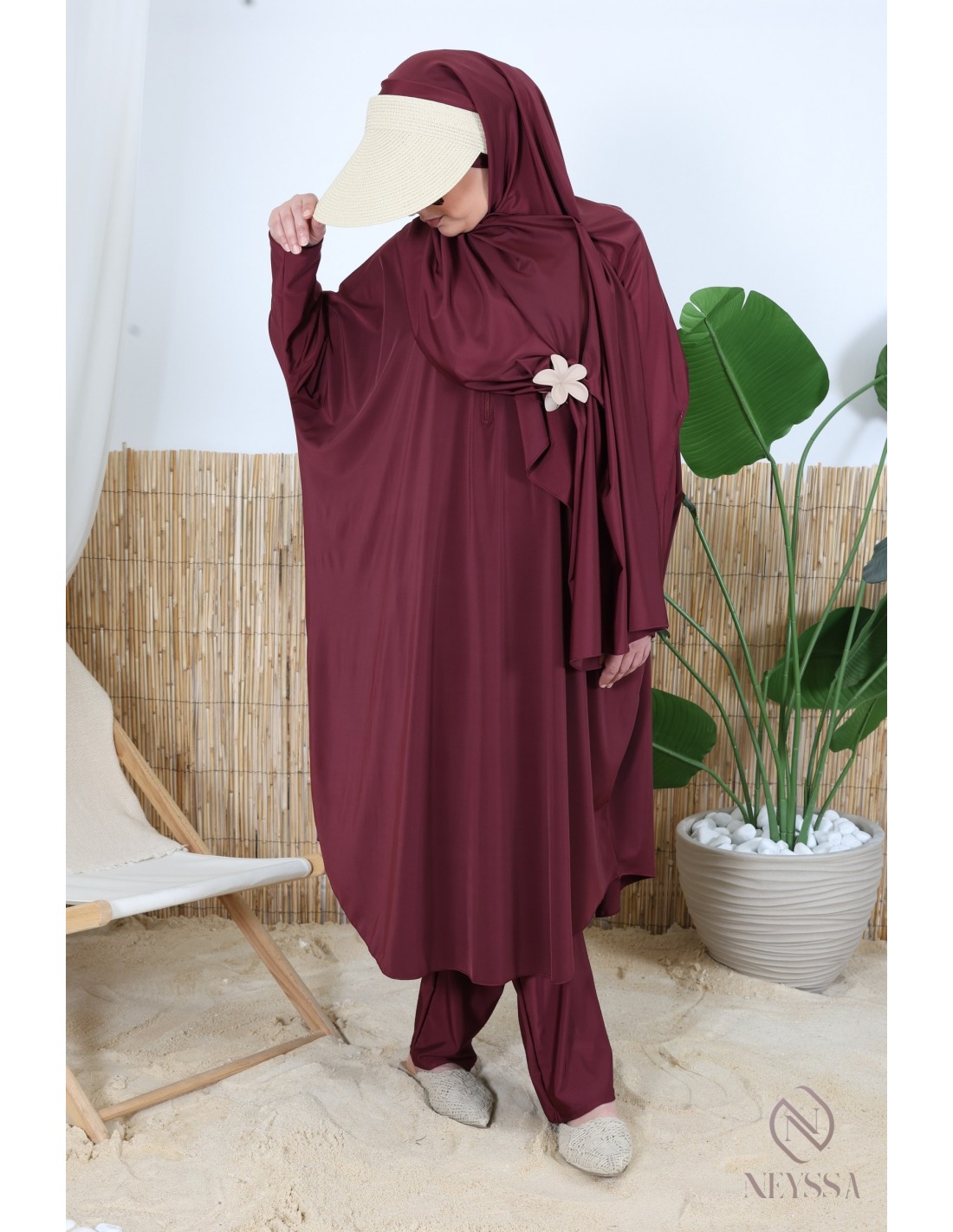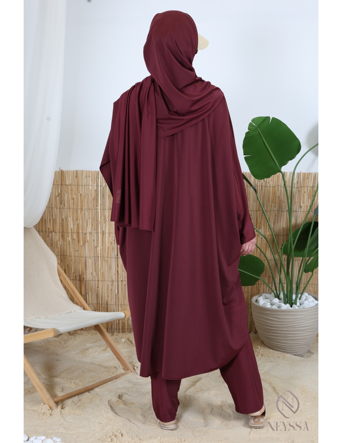 Burkini long coupe papillon 3 pièces avec hijab à nouer bordeaux