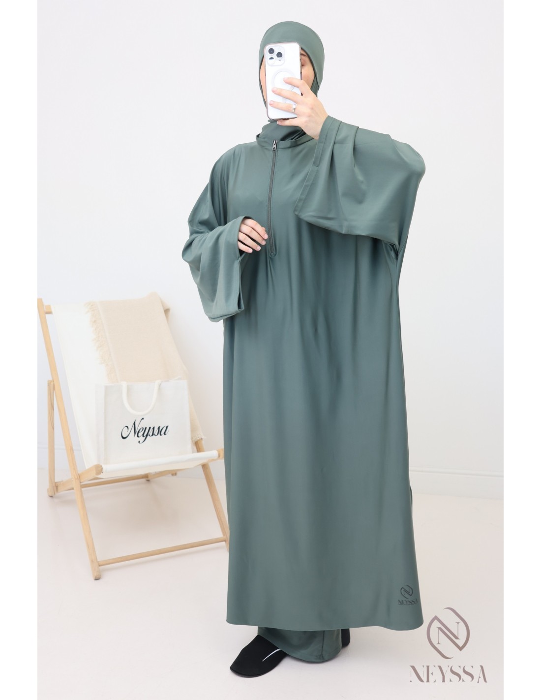 - Confection Neyssa : Ce burkini de bain haut de gamme a été confectionné dans nos ateliers avec un tissu de qualité.