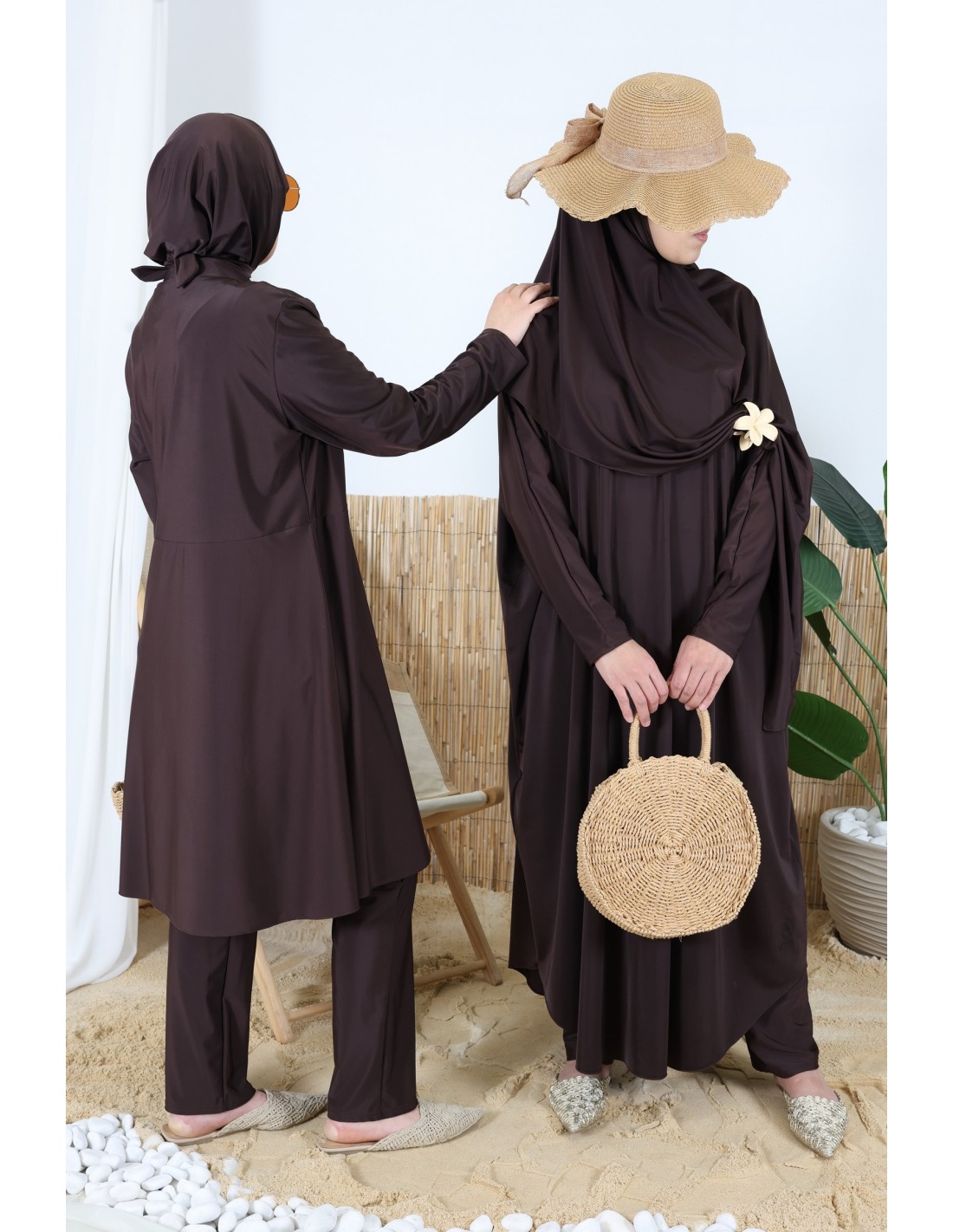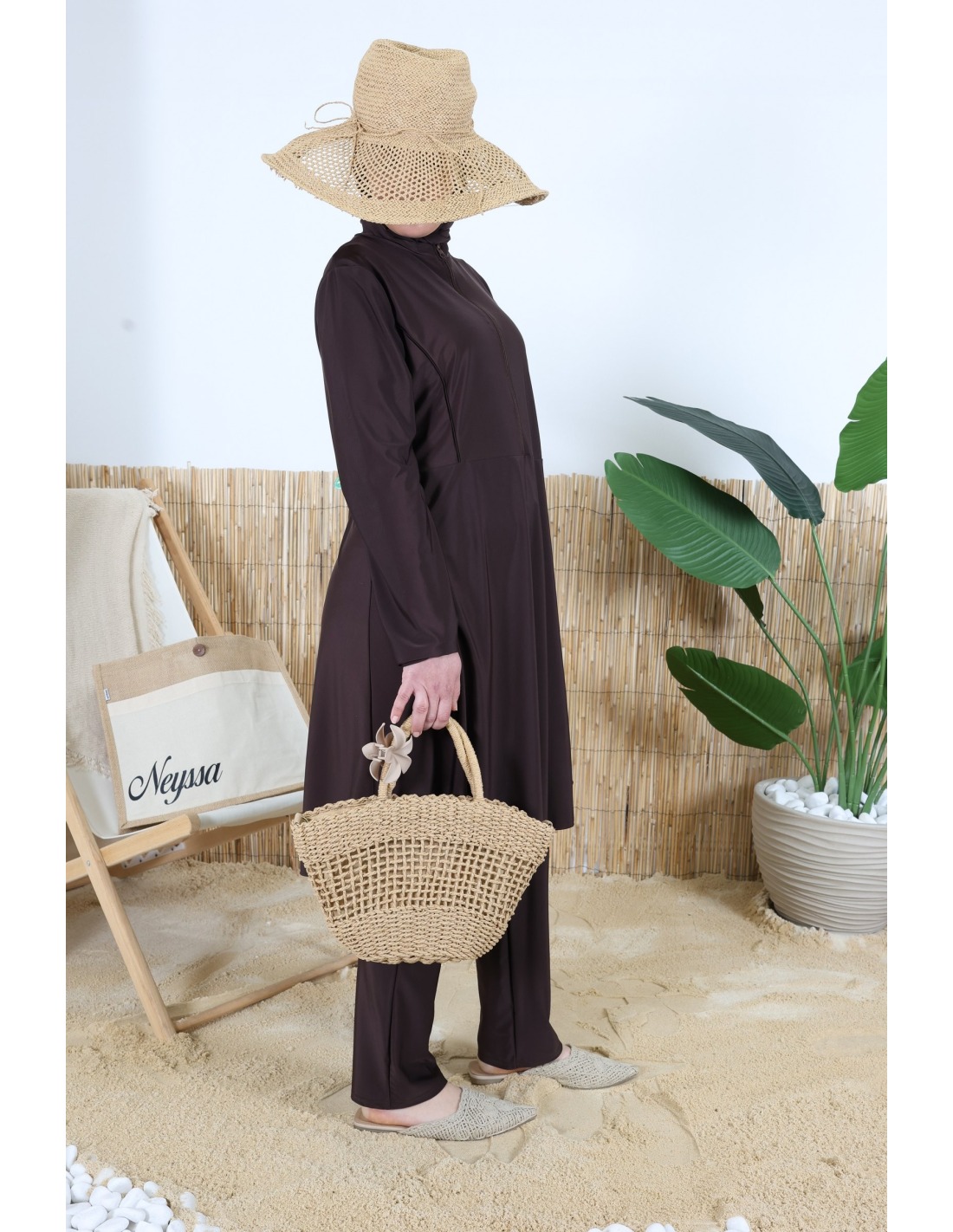 Burkini Chocolat 3 pièces tunique longue + pantalon + cagoule de bain