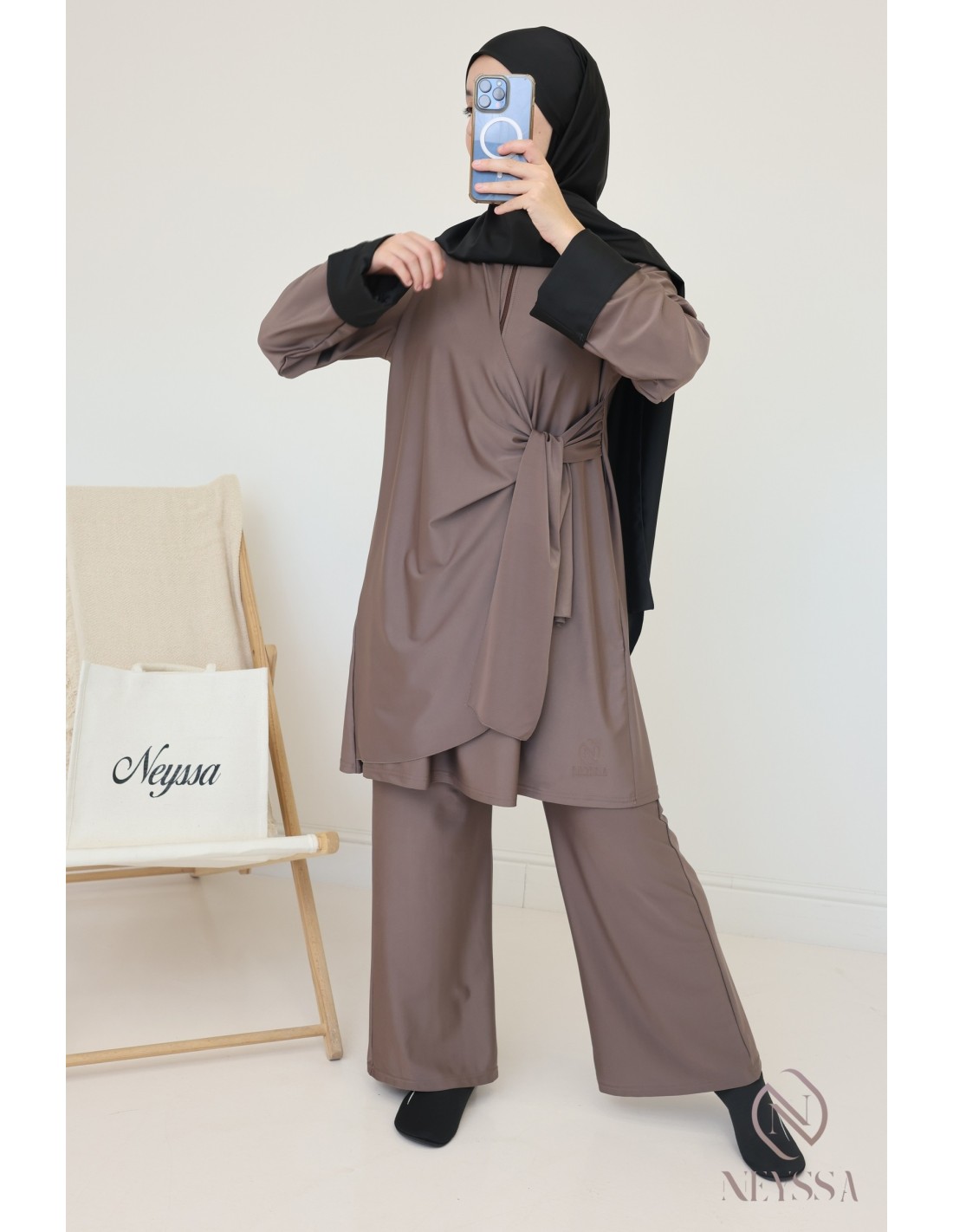 Burkini Taupe long avec tunique à nouer moderne femme voilée