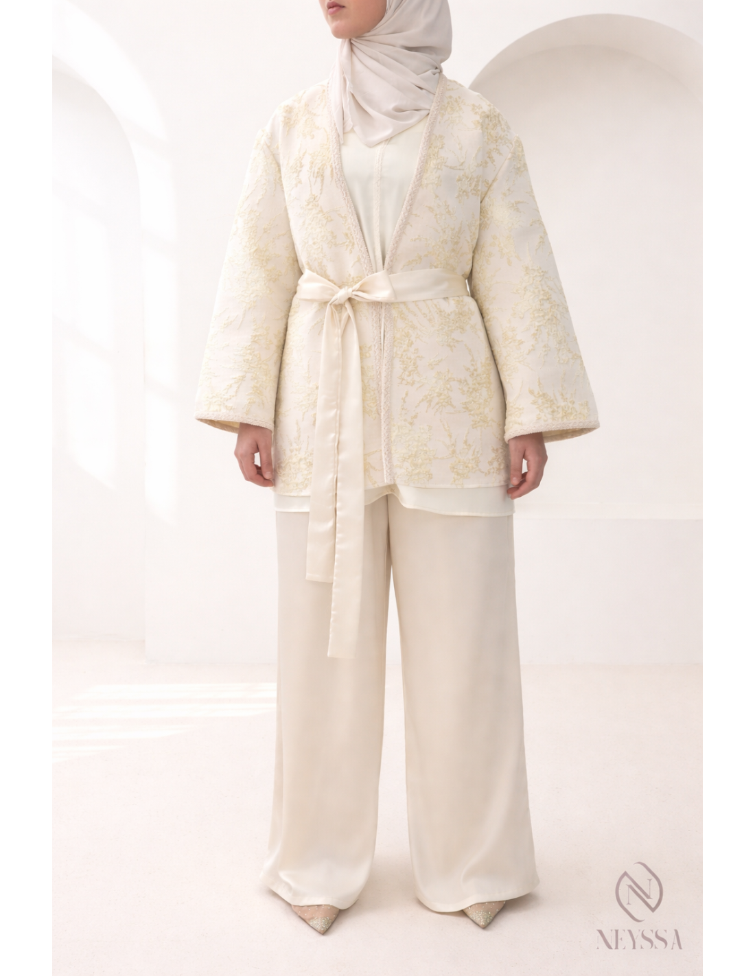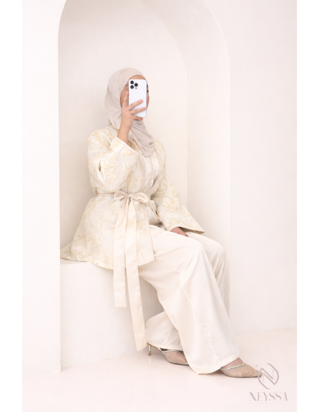 Ensemble kimono et palazzo brocard beige, tissu haut de gamme