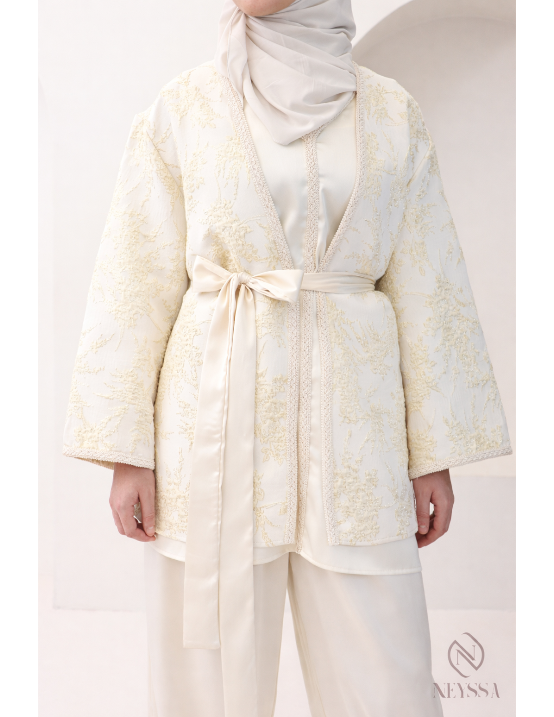 - Kimono brodé en brocart : élégant et raffiné, il est sublimé par de délicates broderies. Ses manches amples apportent une belle fluidité et une allure sophistiquée à l’ensemble.