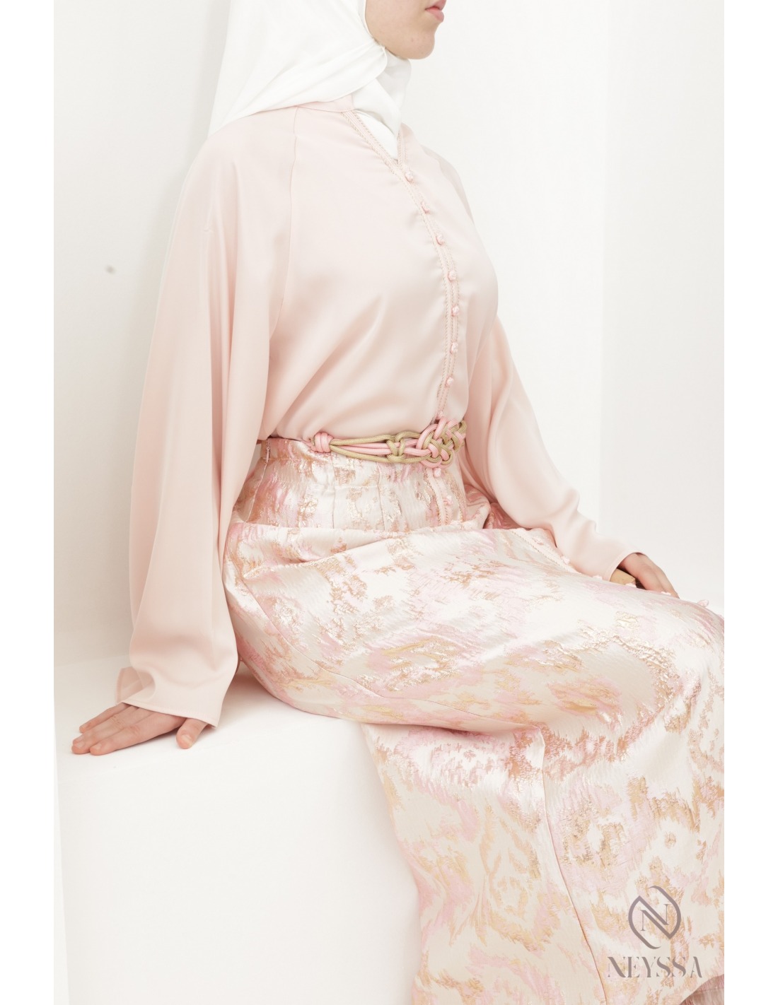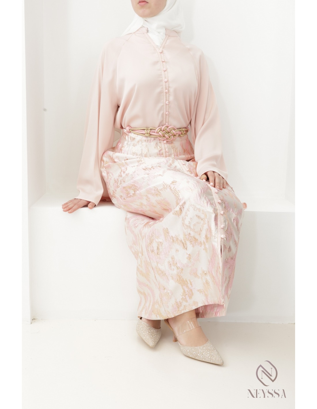 Ensemble 3 pièces rose poudré jupe brocart longue avec sa sfifa : idée Aïd
