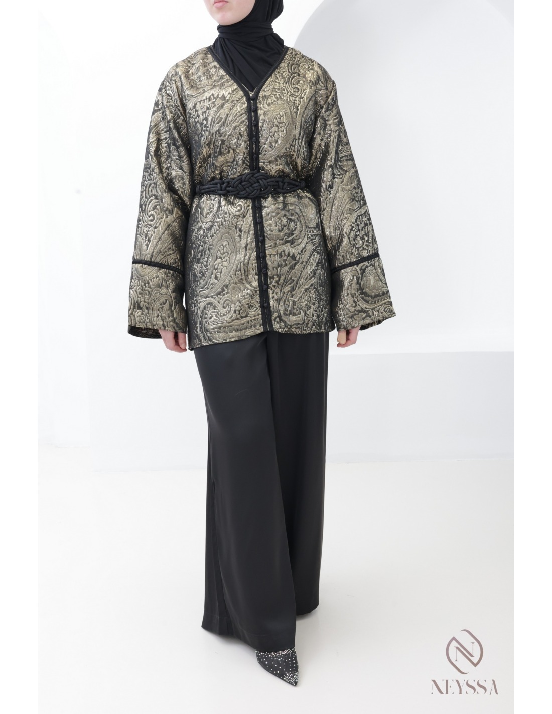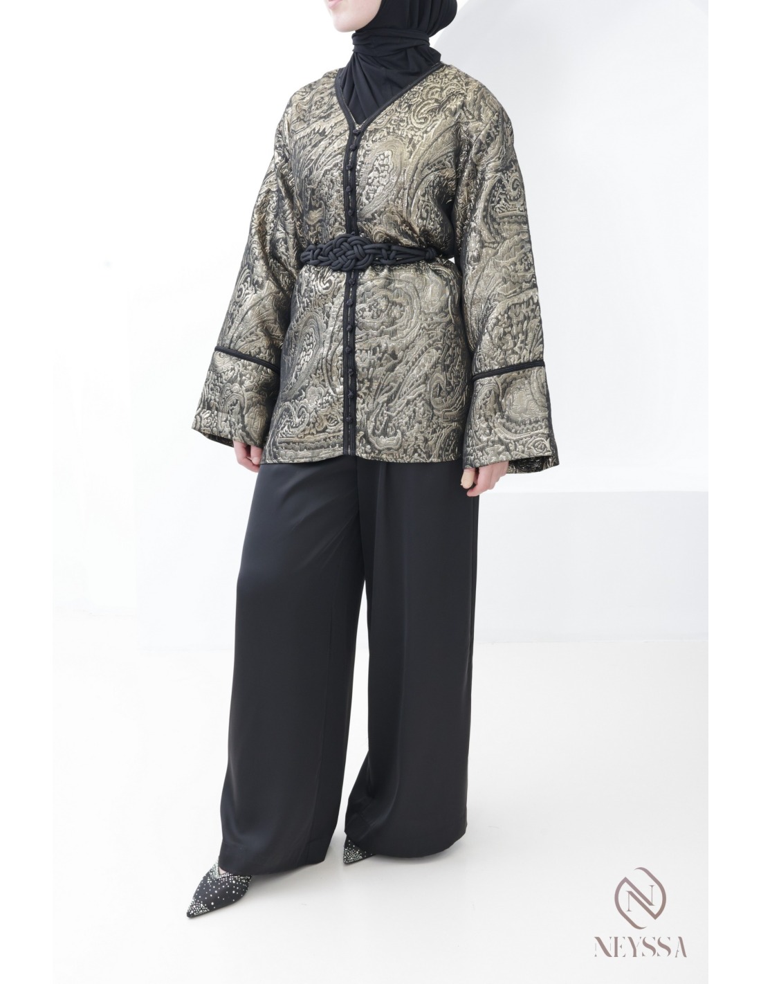 Ensemble 3 pièces brocart tunique + palazzo Noir femme hijabi : tenue aïd