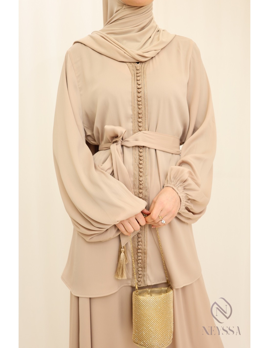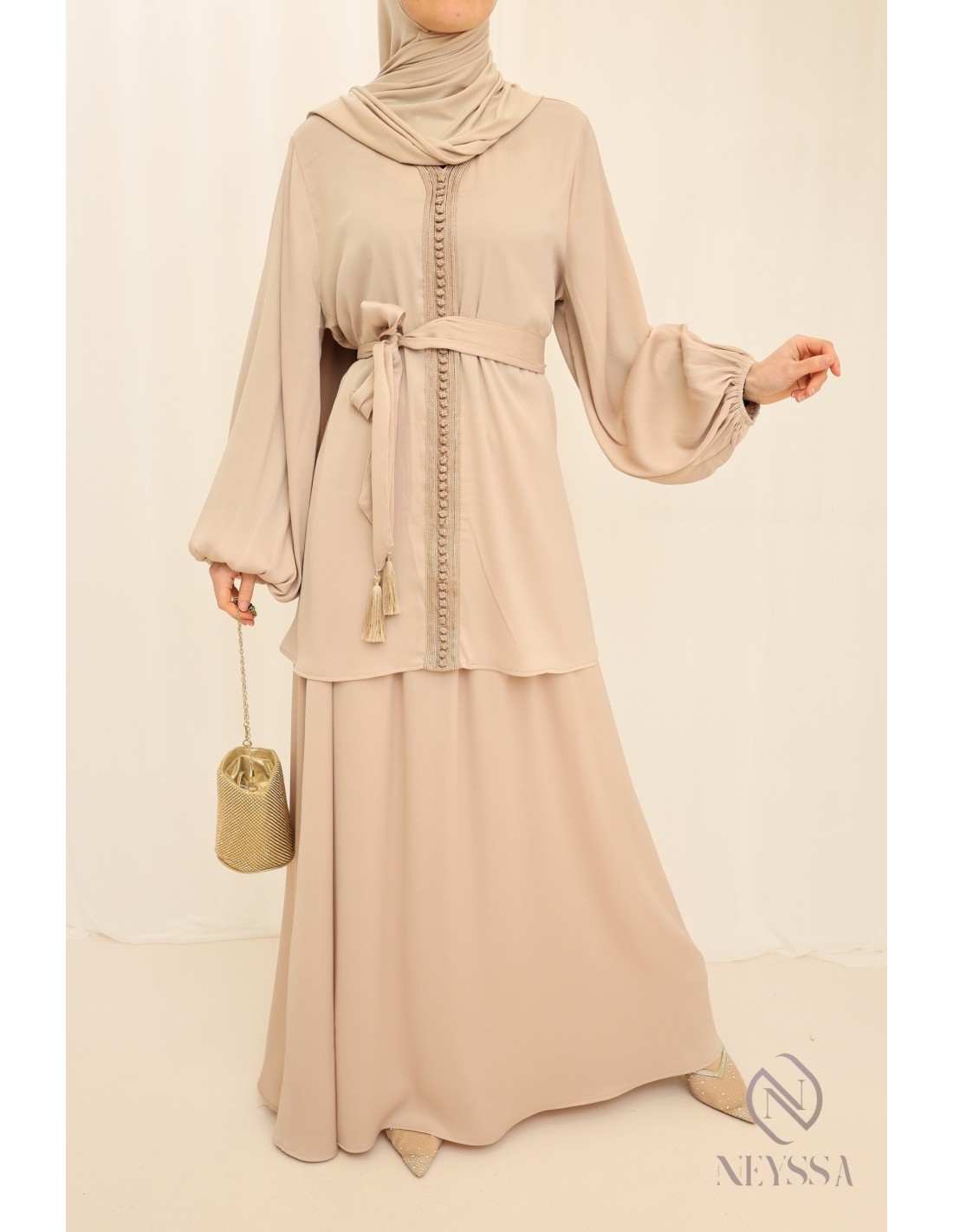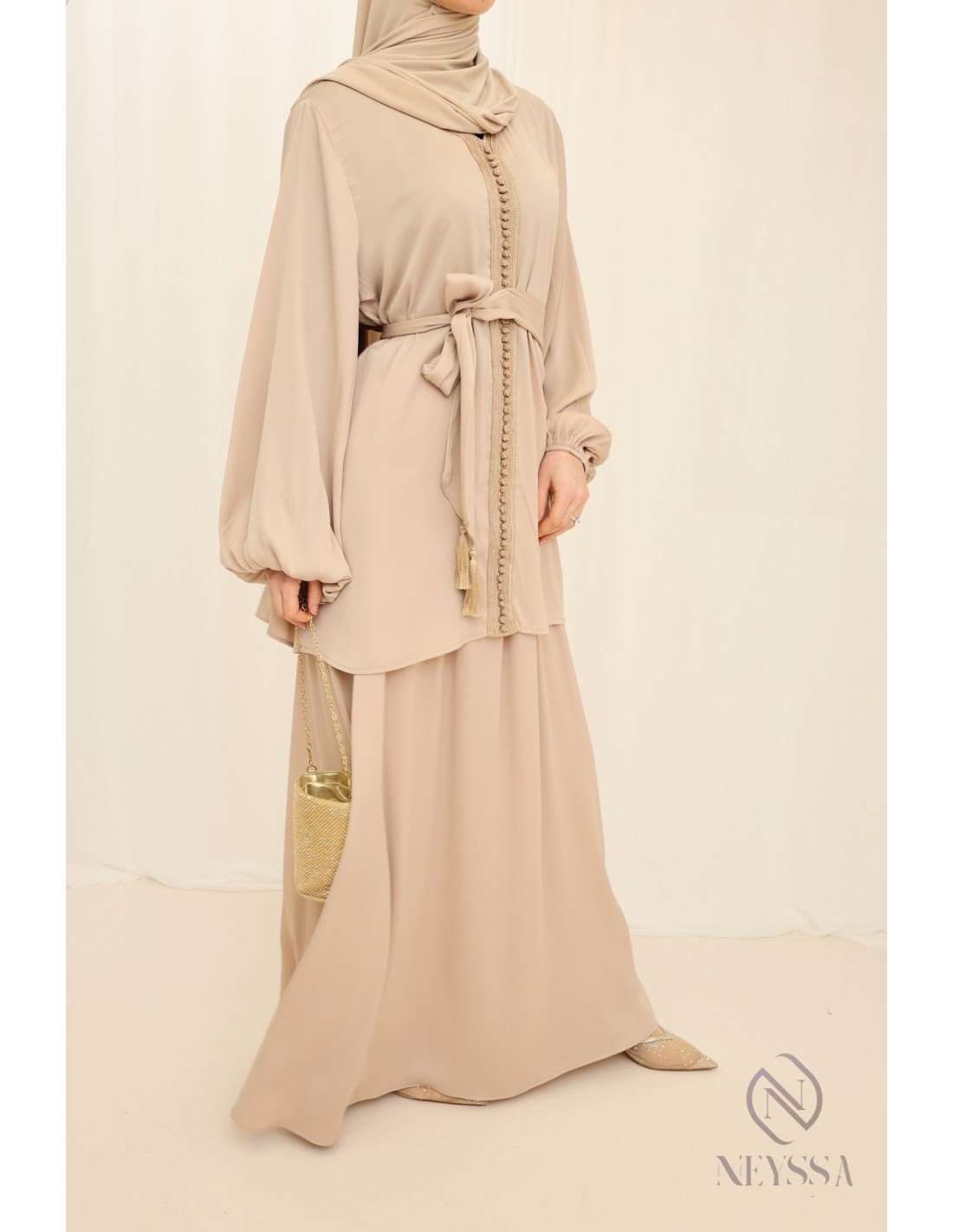 Vous recherchez une tenue à la fois simple et élégante pour l'Aïd ? Nous vous proposons cette pépite 2 pièces au style caftan beige femme voilée qui va sans aucun doute vous plaire !