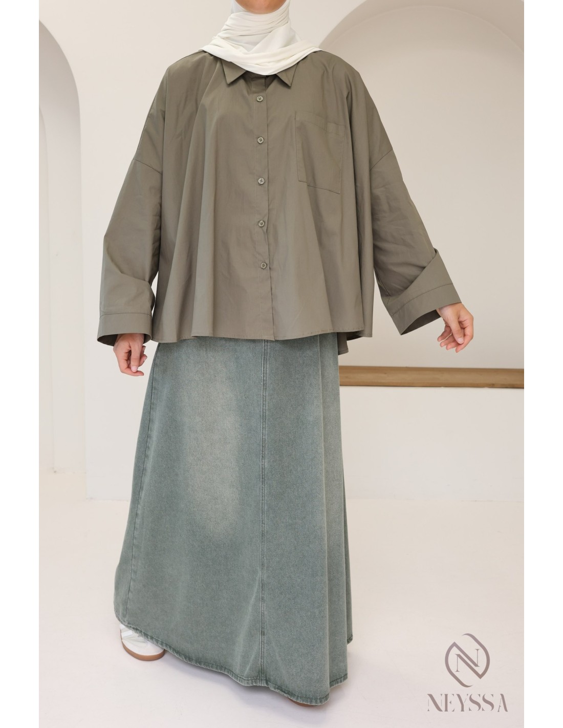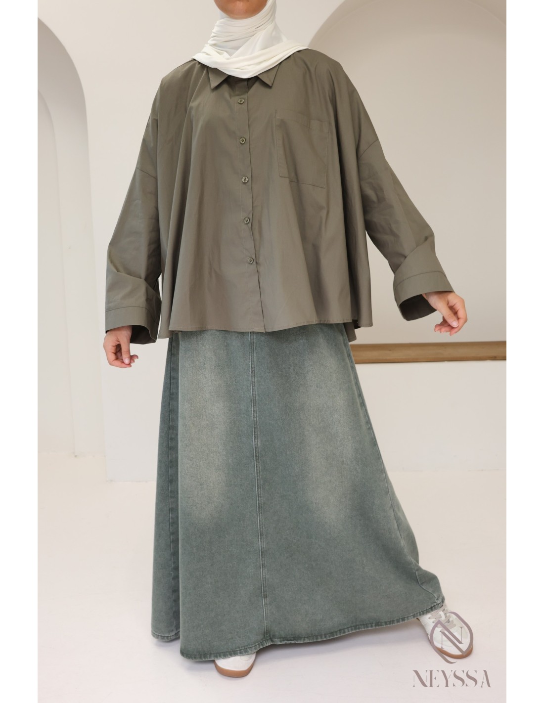 Votre dressing est rempli de jupes  d'été mais il vous manque de jolis hauts modestes pour compléter vos outfits ? Chez Neyssa, nous vous proposons des tenues pour femme hijabi dans lequel vous n'y trouverez que des pépites, dont cette magnifique chemise oversize.