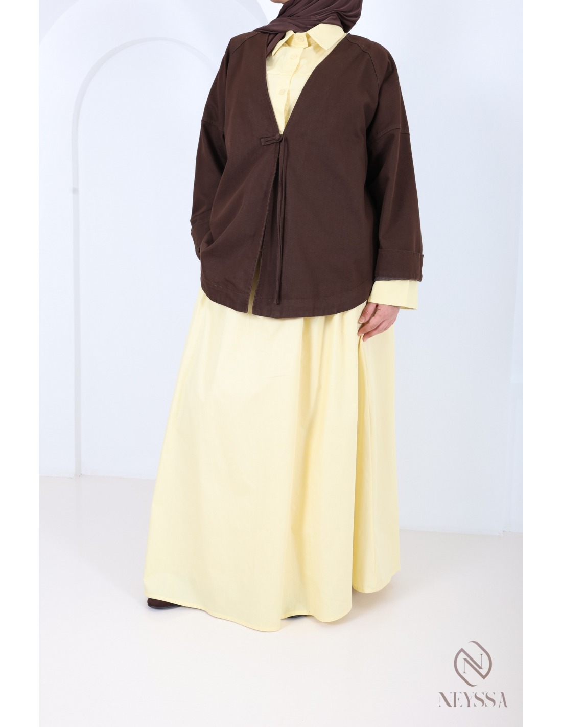 - Veste style kimono : Fermeture par bouton discret à l’avant.