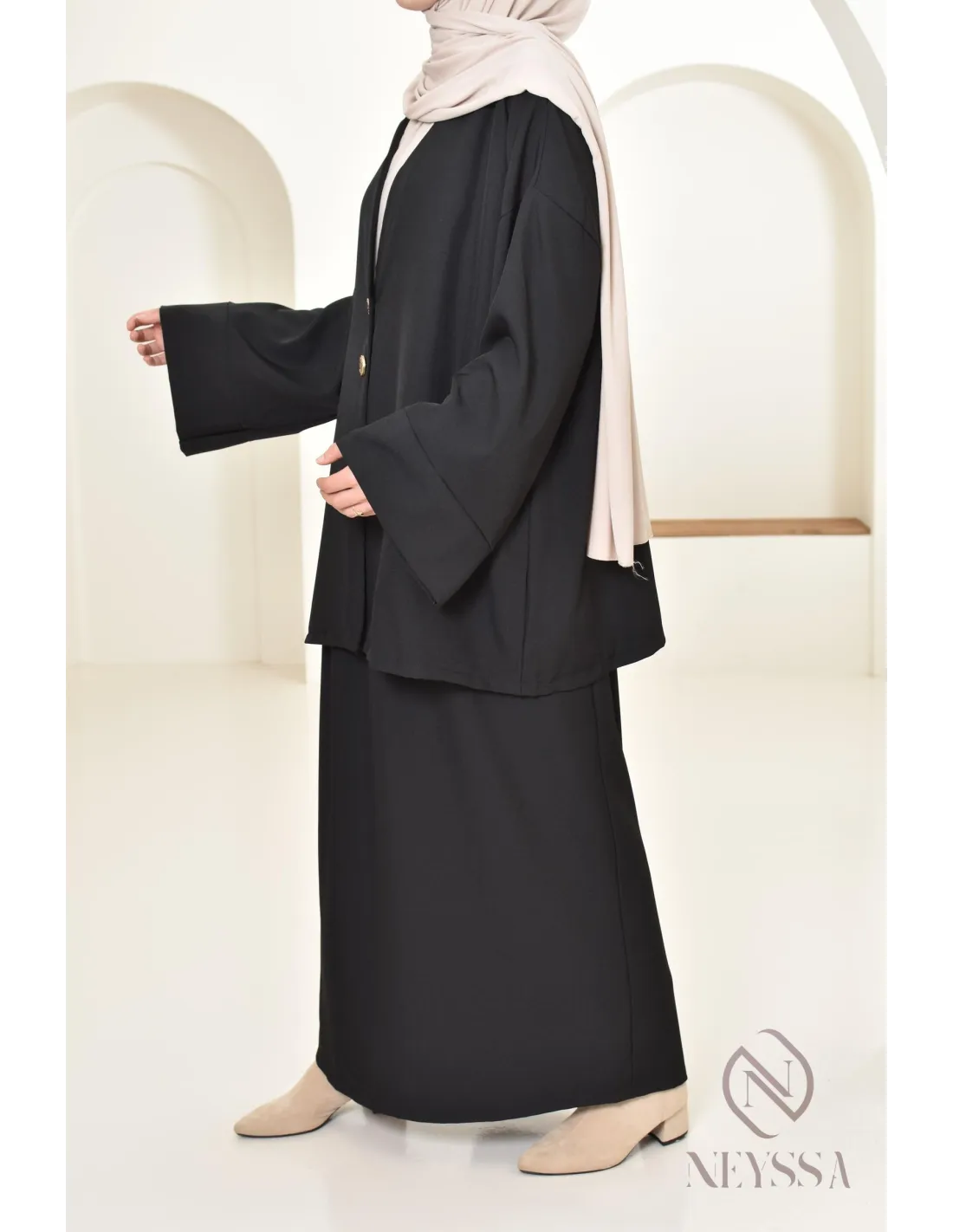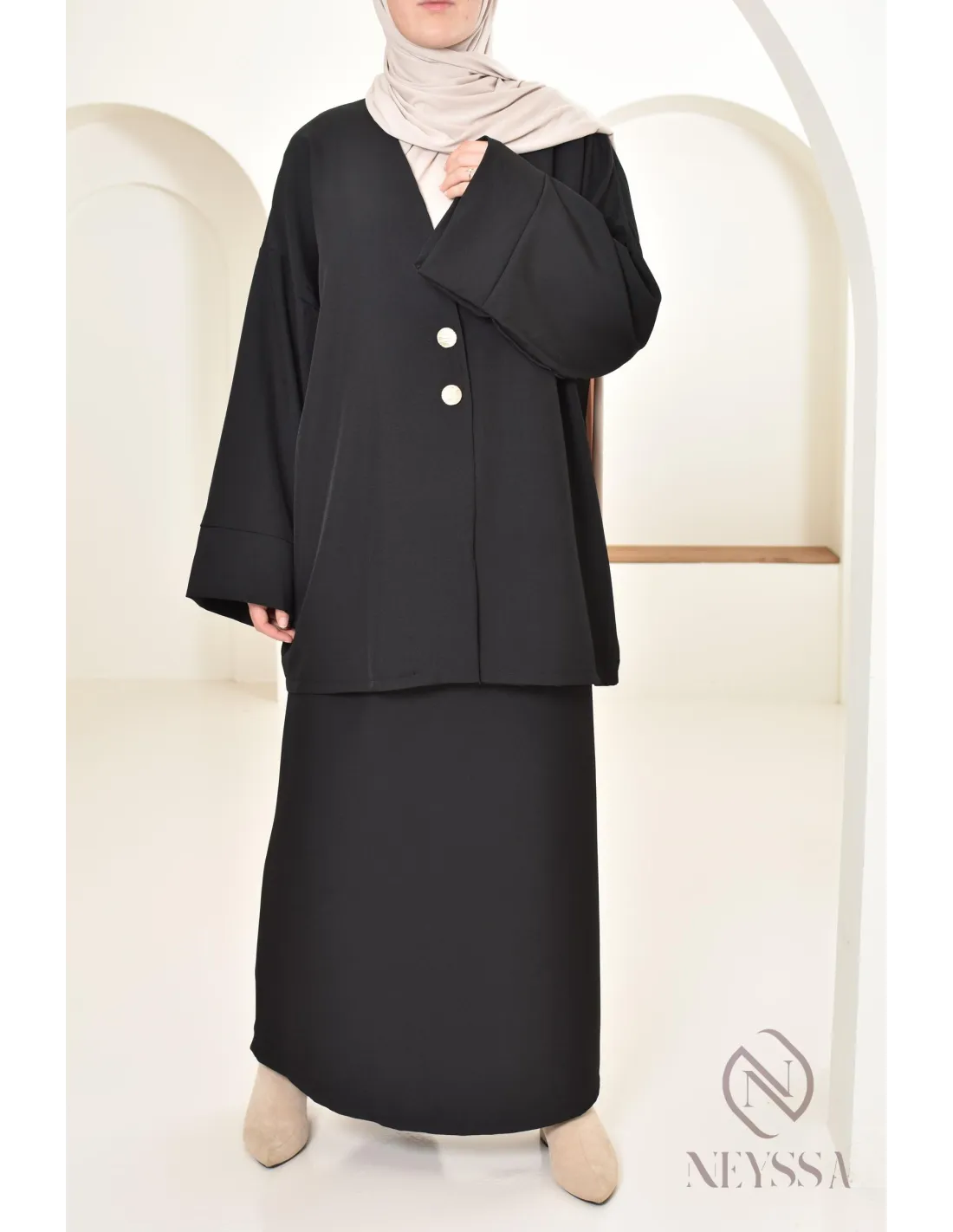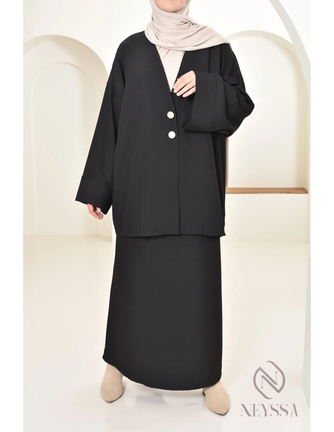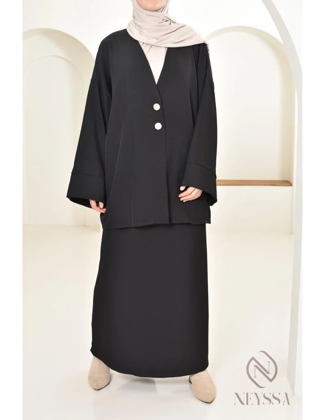Découvrez cet ensemble 2 pièces, composé d'une veste-tunique chic avec col en V et d'une jupe longue fluide. Conçu pour allier confort et sophistication, cet ensemble met en valeur la femme voilée en quête de modestie.