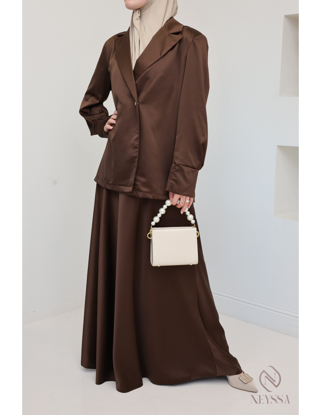 Ensemble jupe longue coupe évasée avec veste style blazer en satin