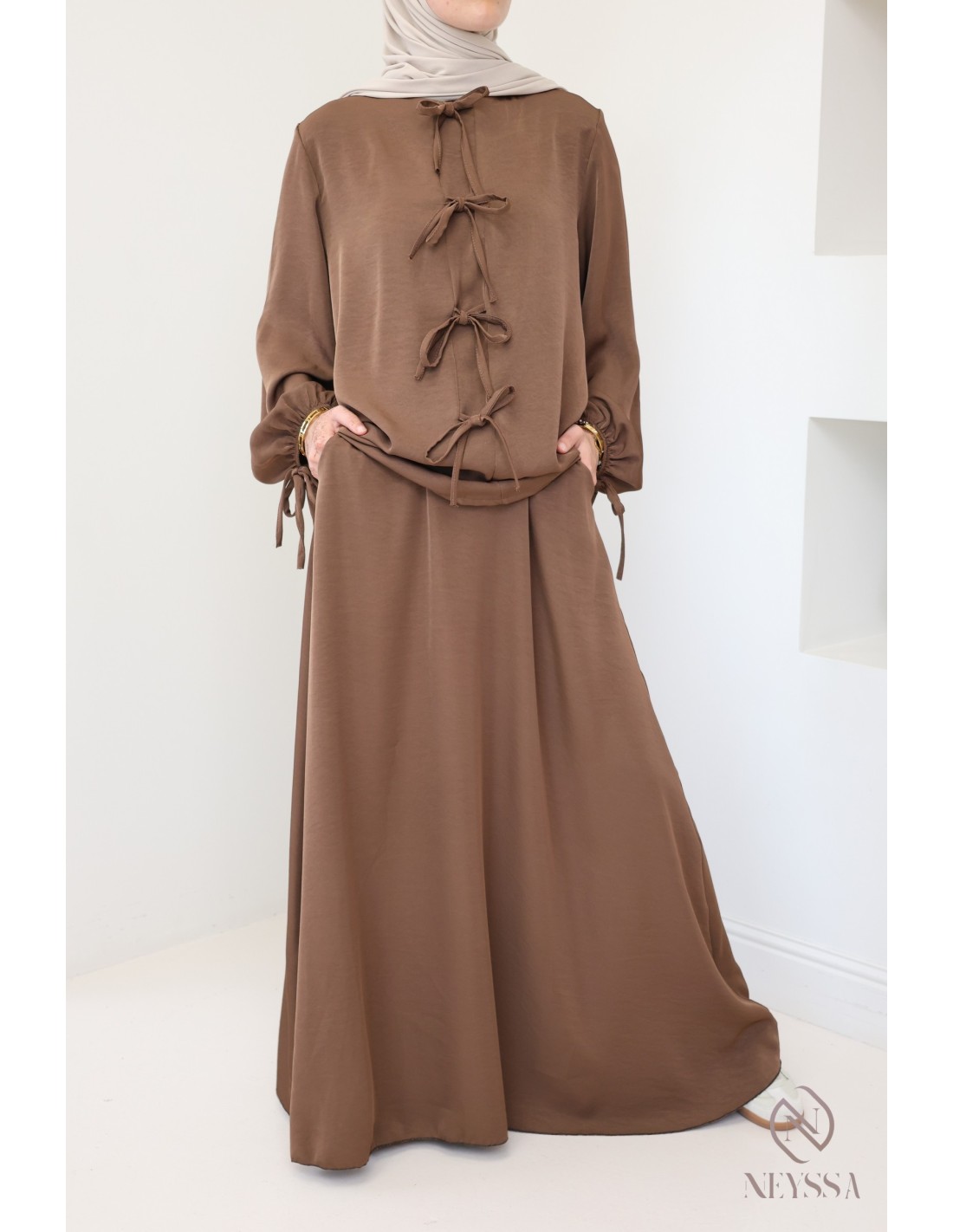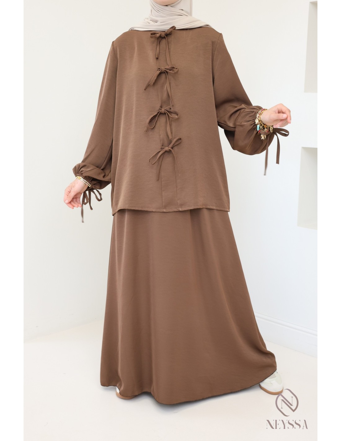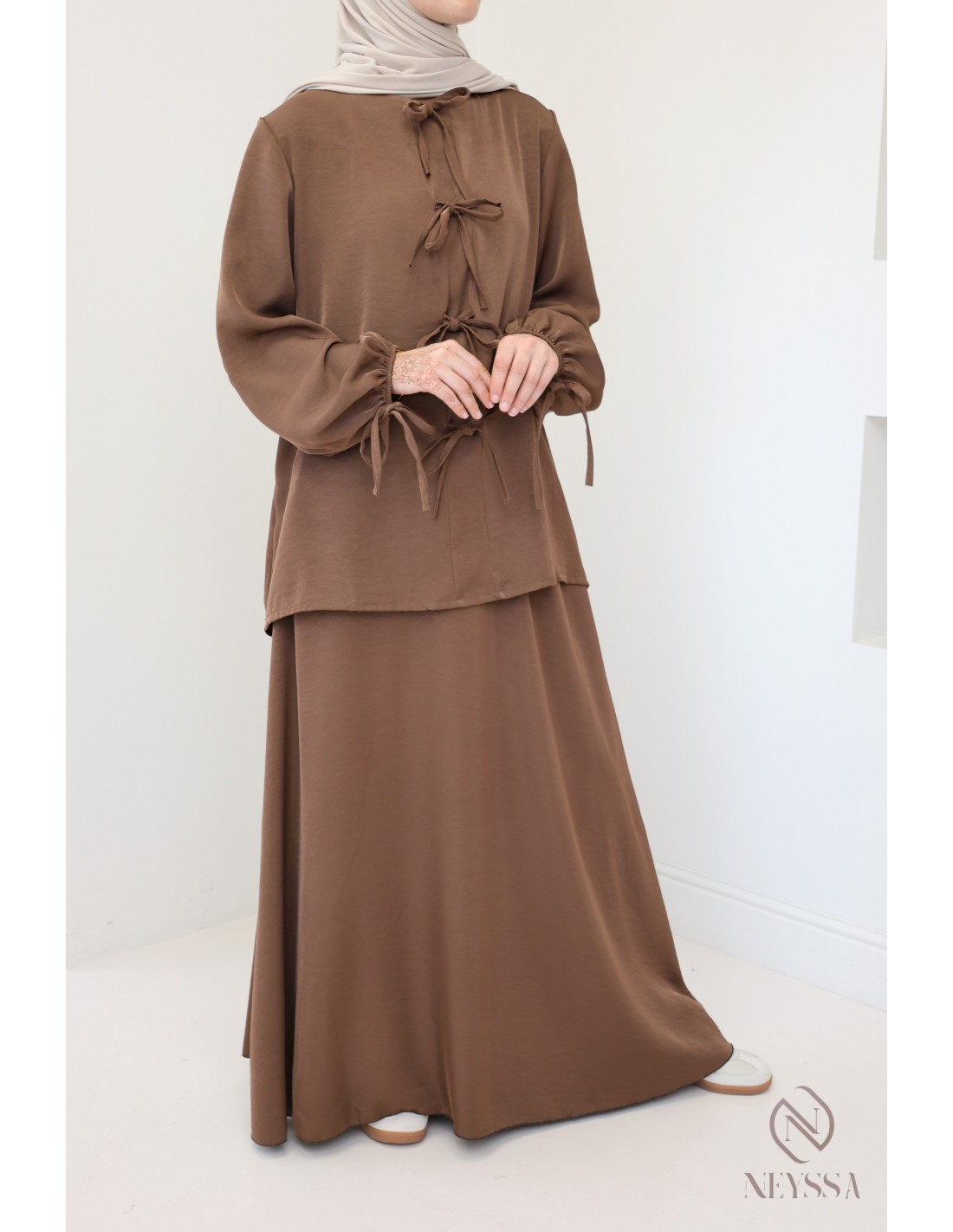 Ensemble 2 pièces jupe longue + tunique Marron tendance femme hijabi