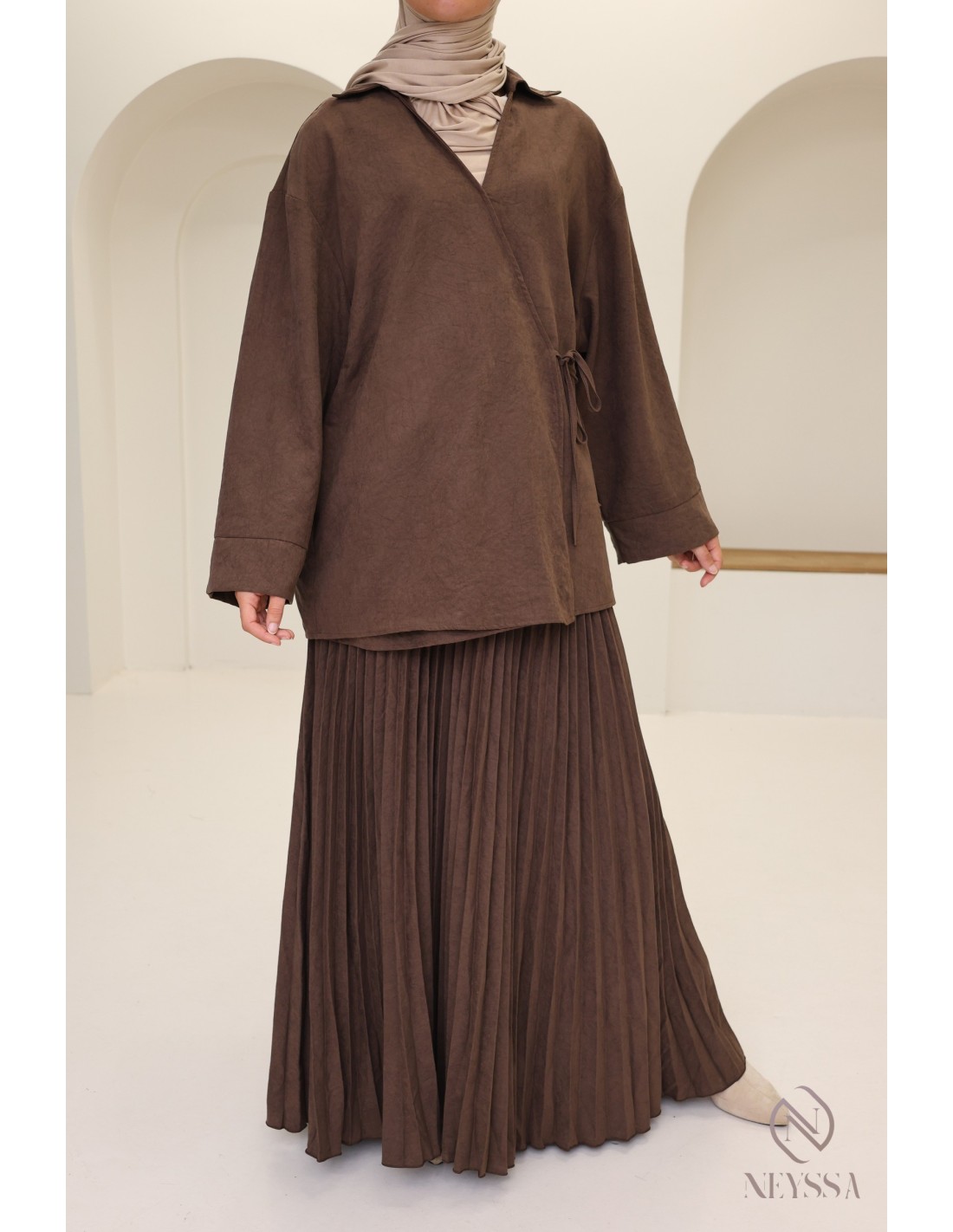 Vous allez craquer pour l'ensemble effet daim marron jupe plissée femme hijabi tendance :