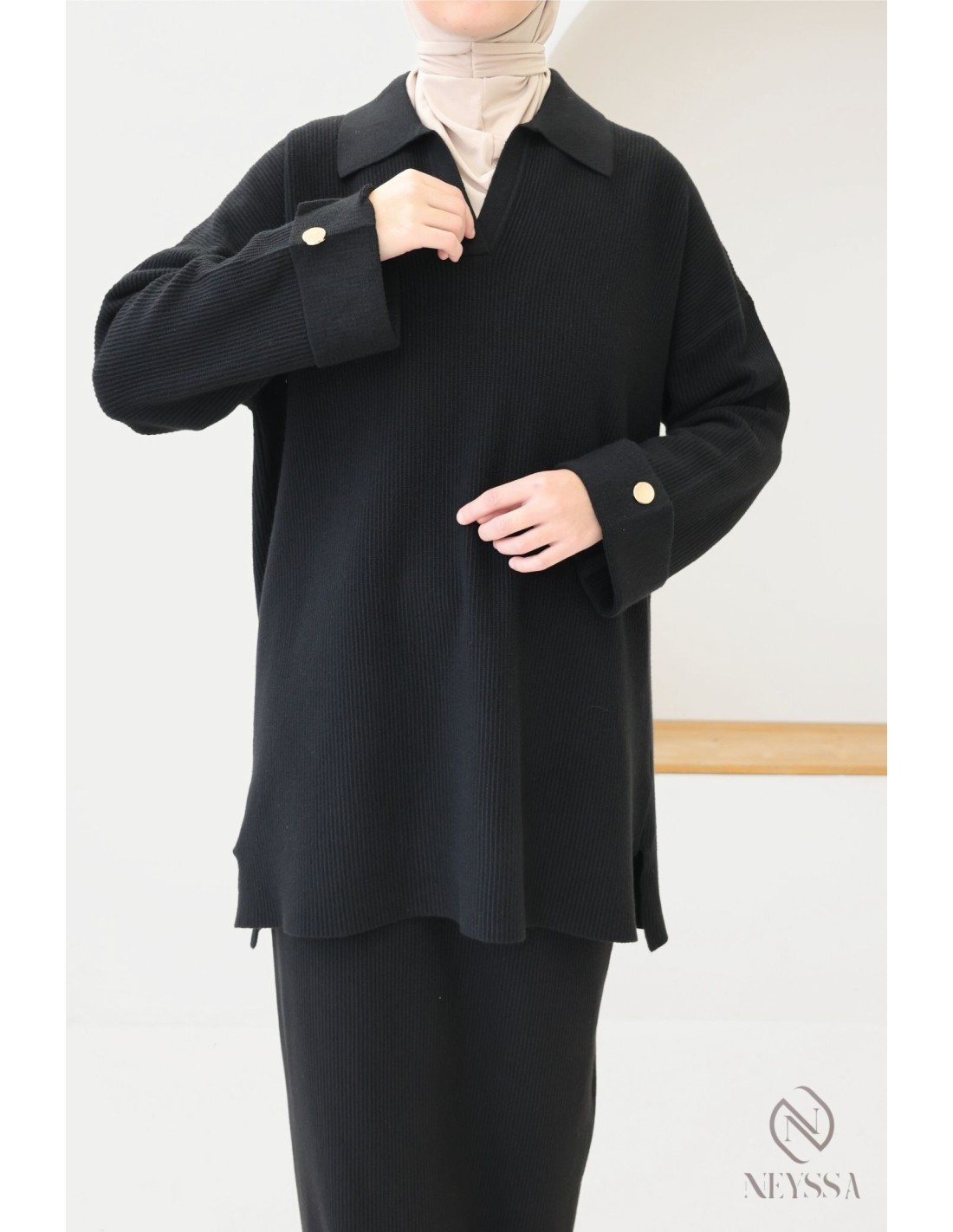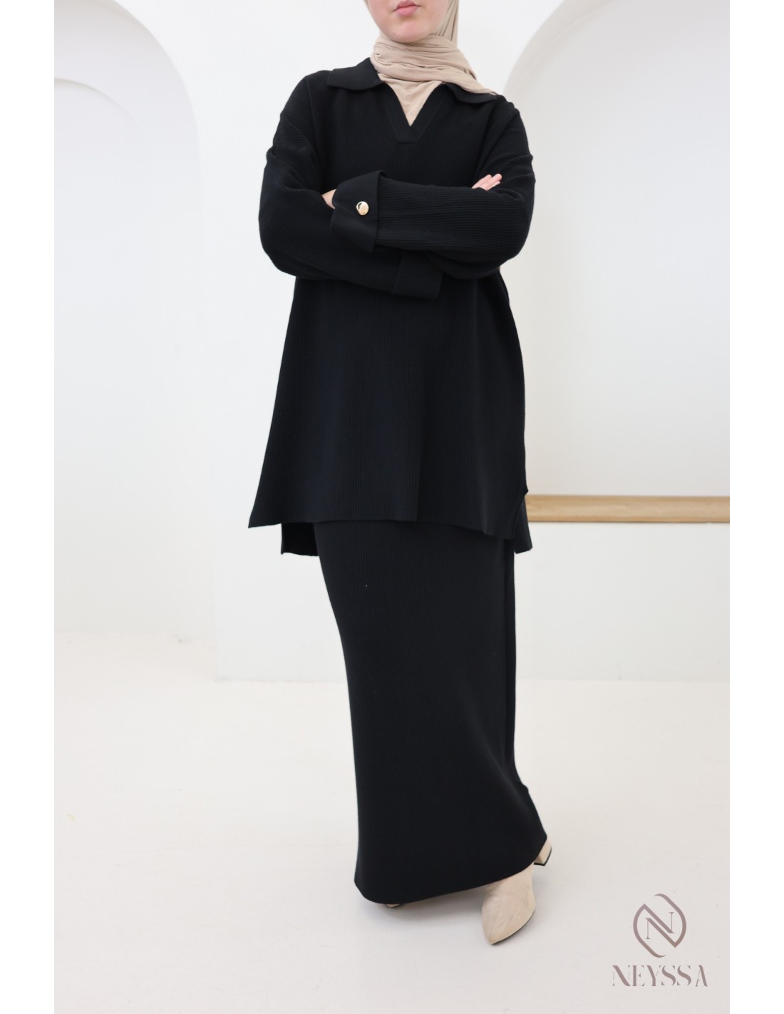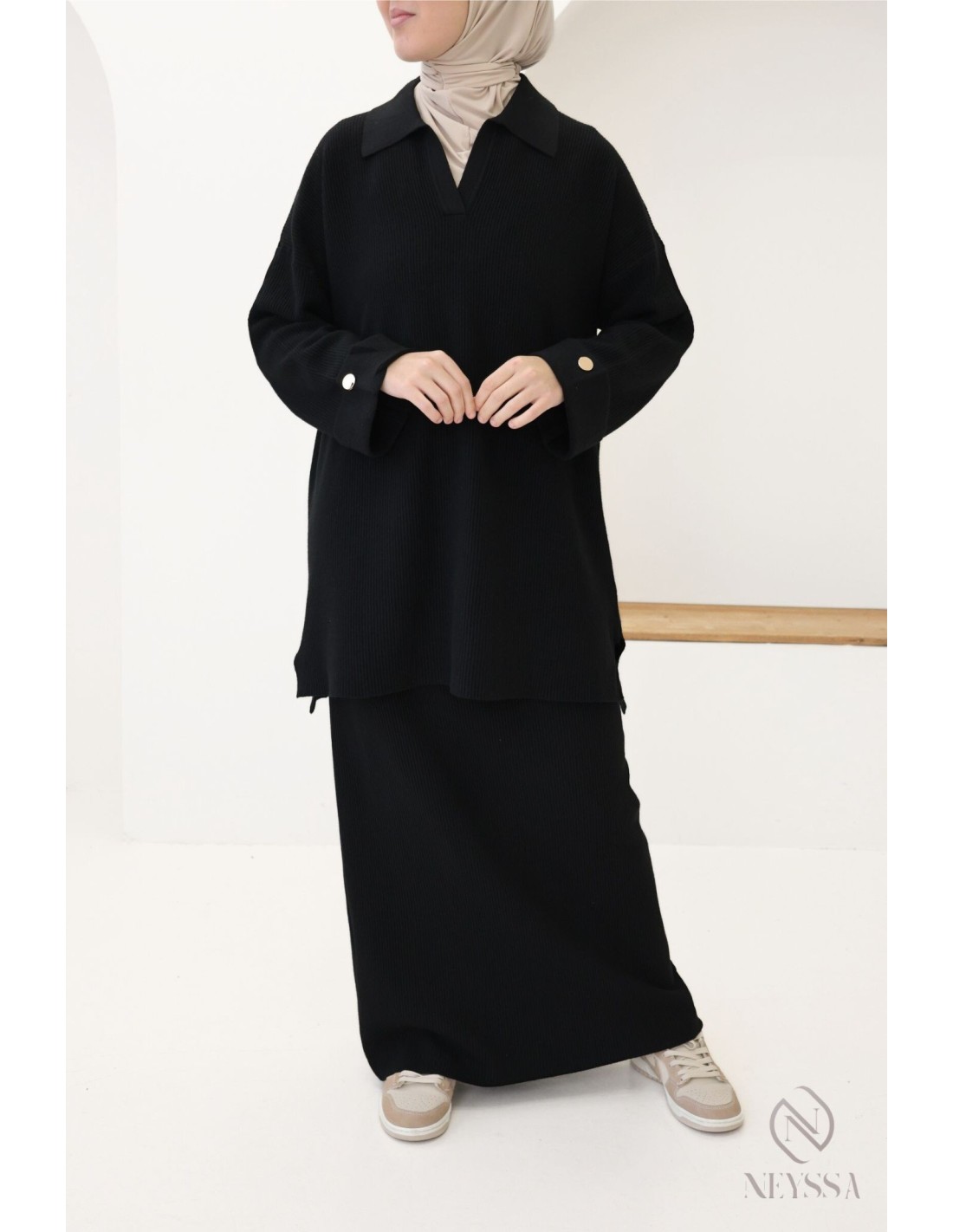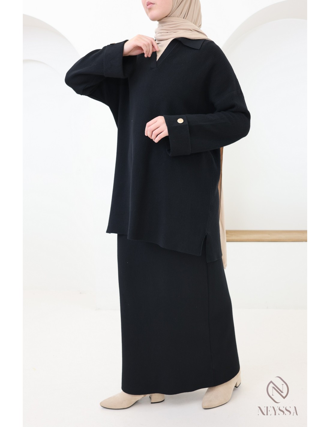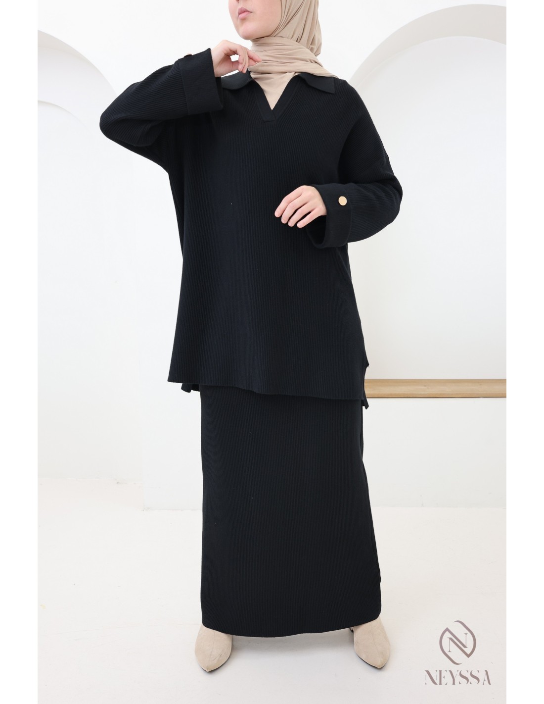 Ensemble noir femme hiver maille : haut style chemise + jupe