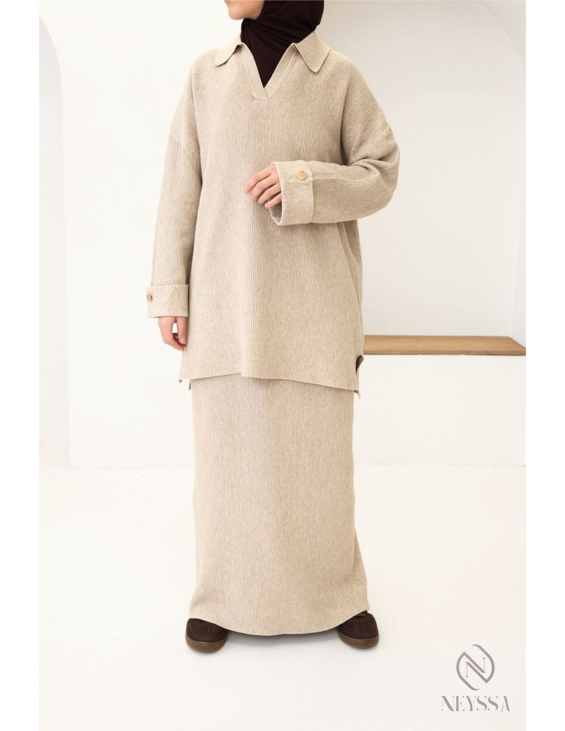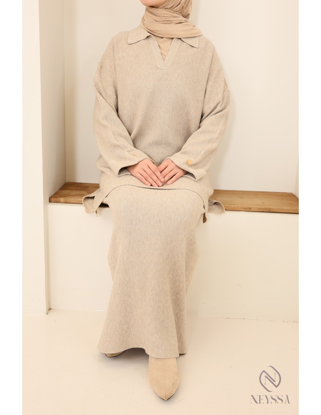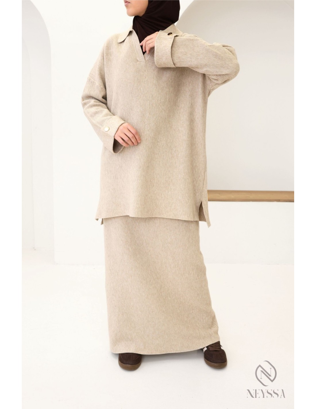 Ensemble 2 pièces beige femme hijabi : tissu maille tissé