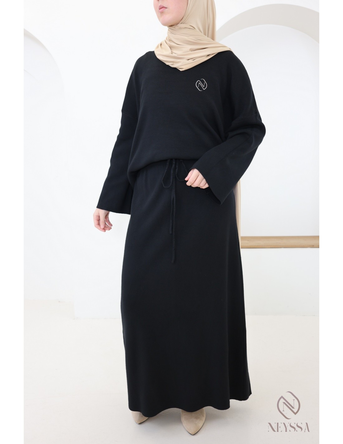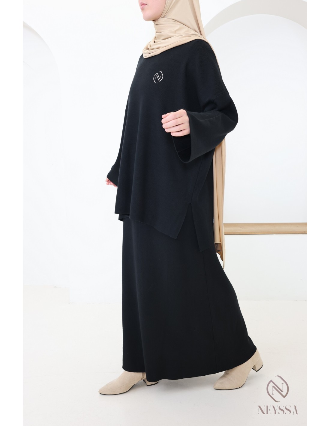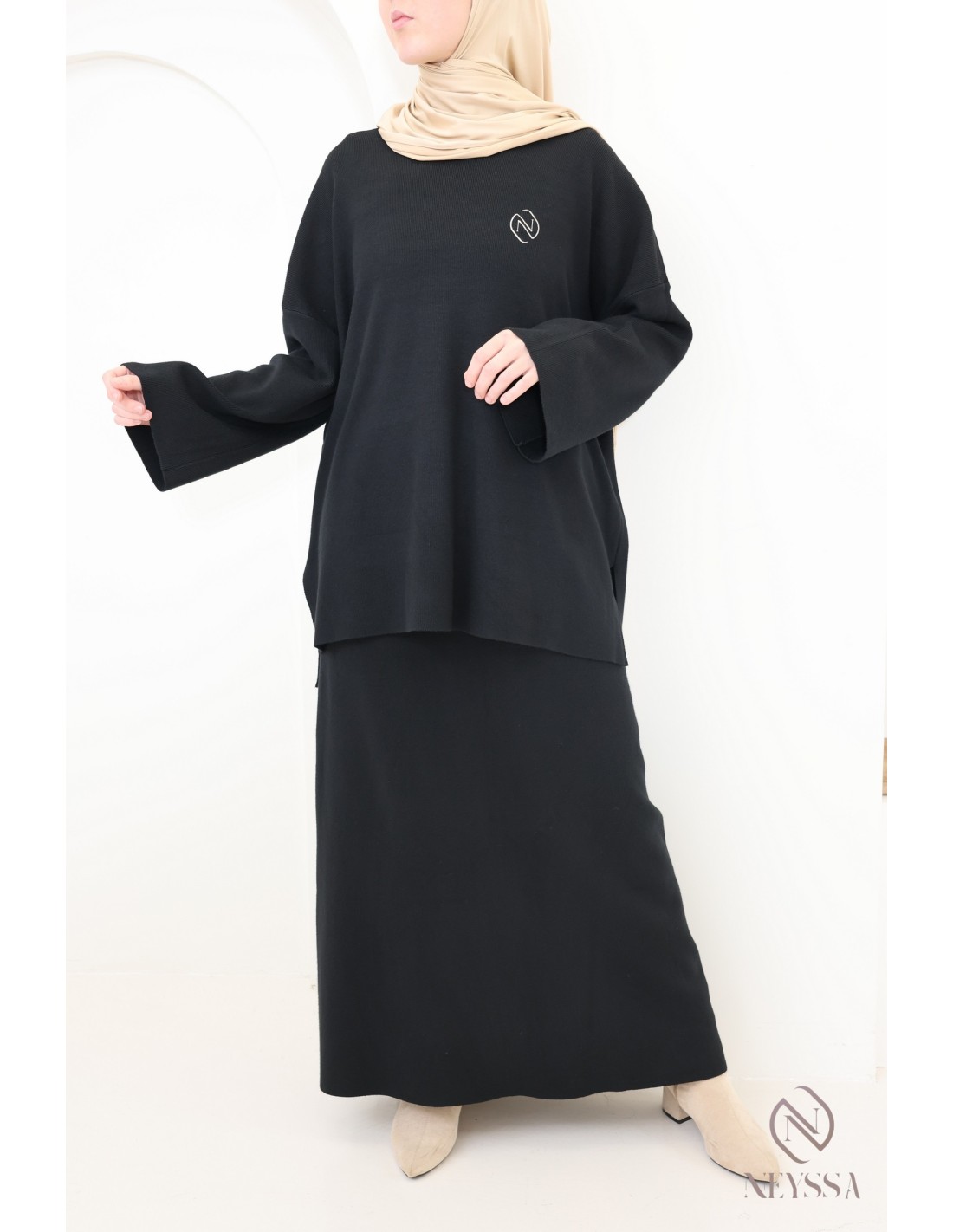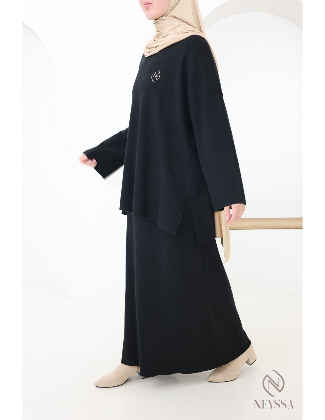 Voici l'ensemble maille jupe Création Neyssa qui a été conçu spécialement pour répondre aux besoins des hijabi. Il offre une élégance modeste en vous permettant d'opter pour le chic et le confort.