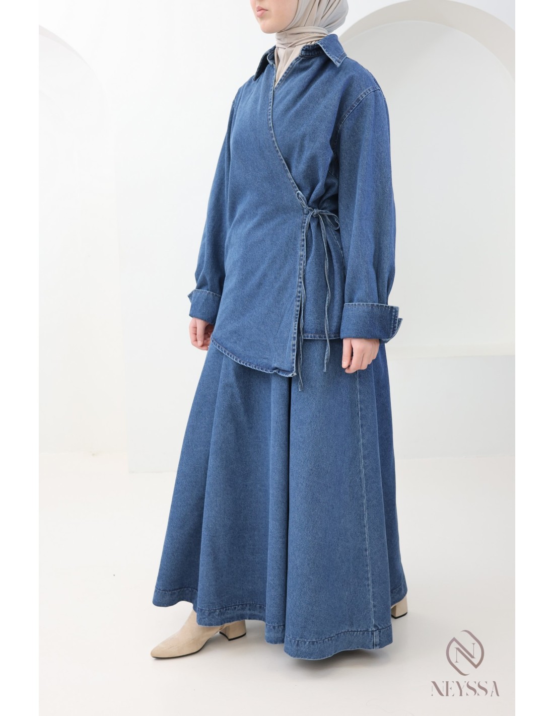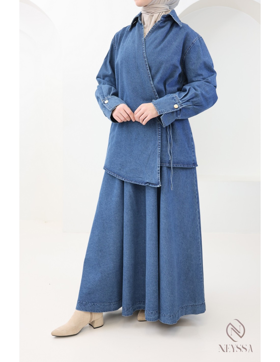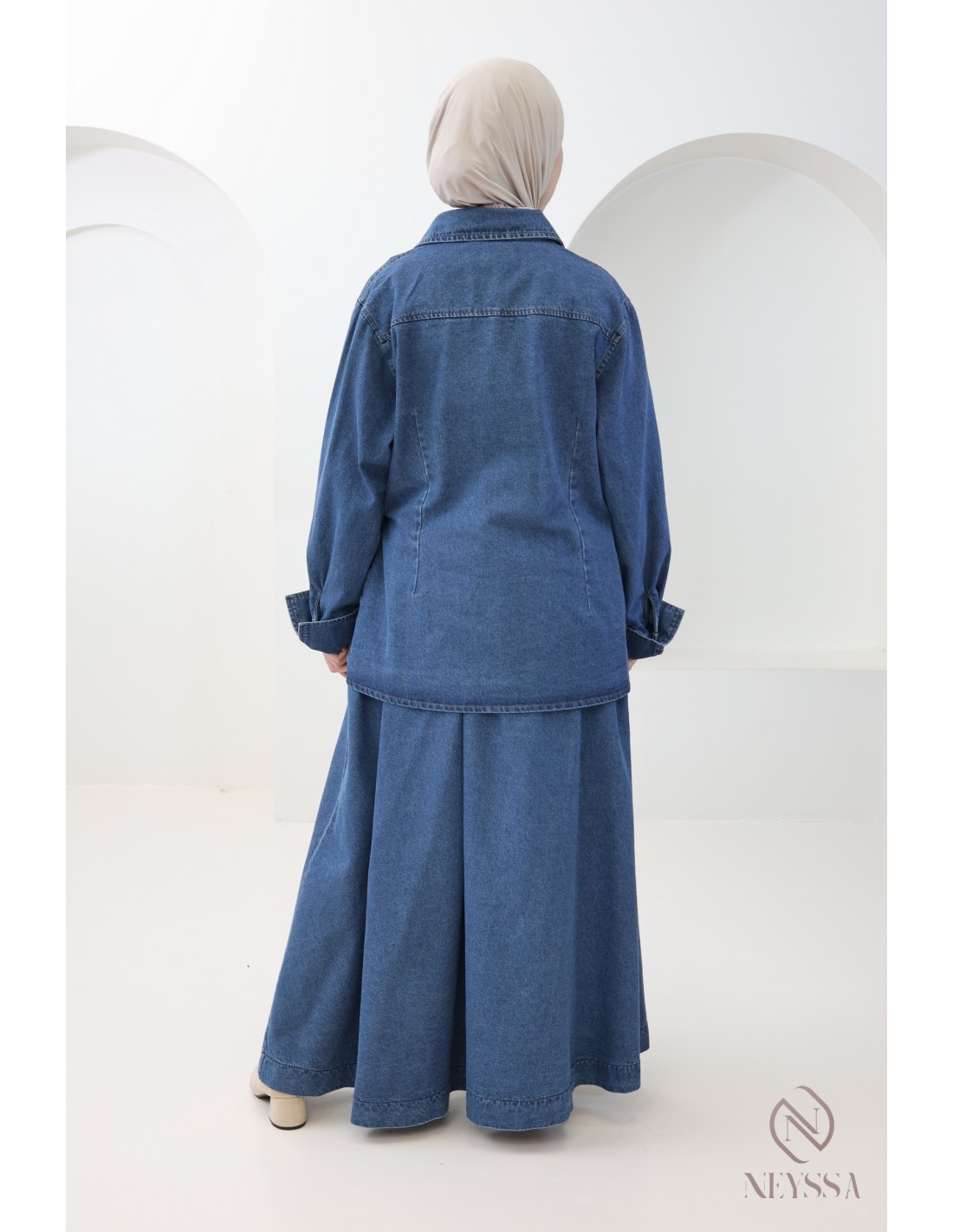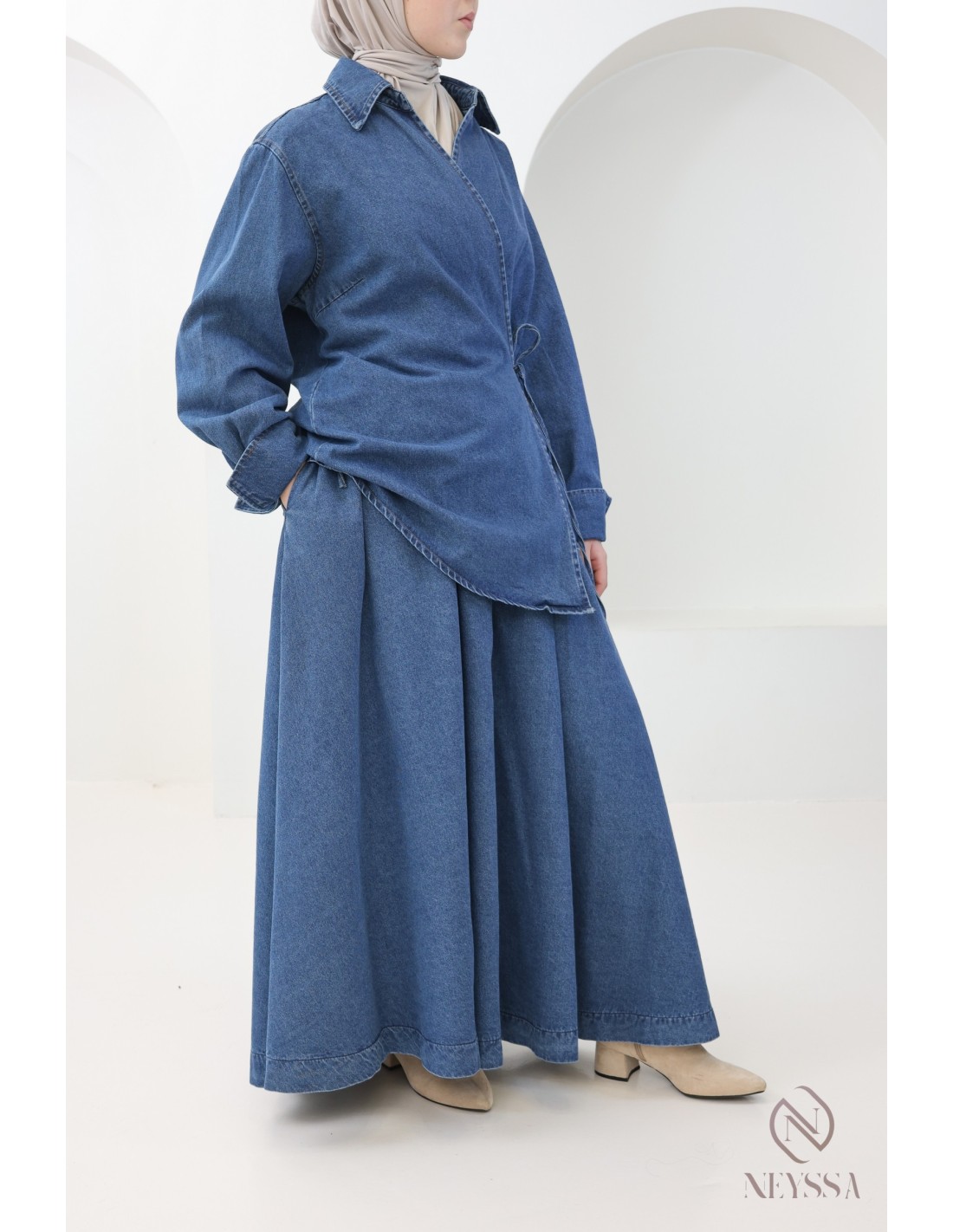 Voici cet ensemble jupe en jean pour femme pudique qui incarne l'élégance et le raffinement de la mode pudique.