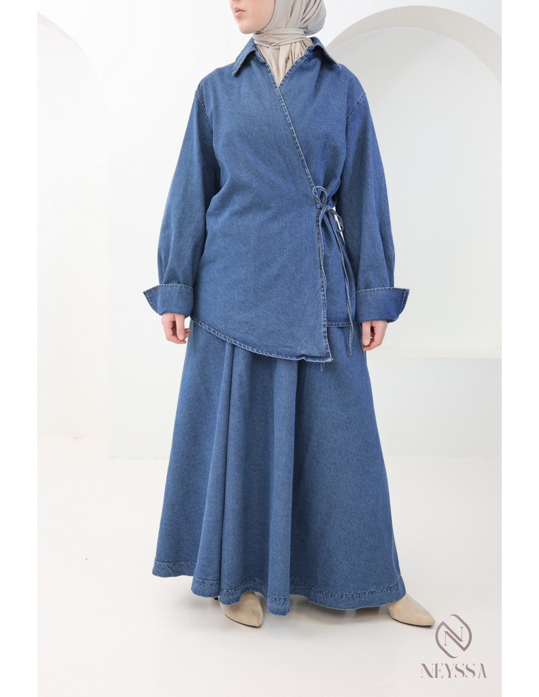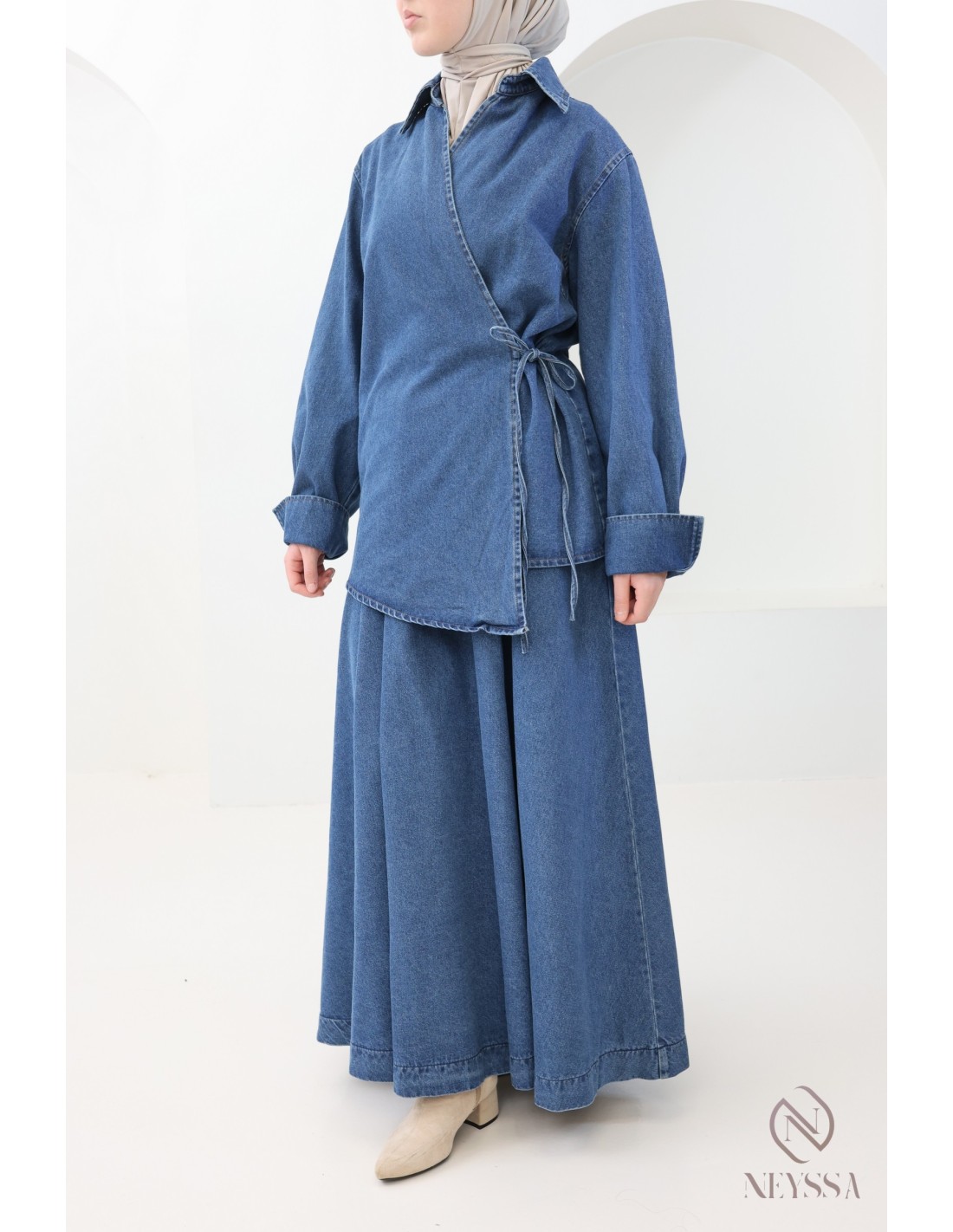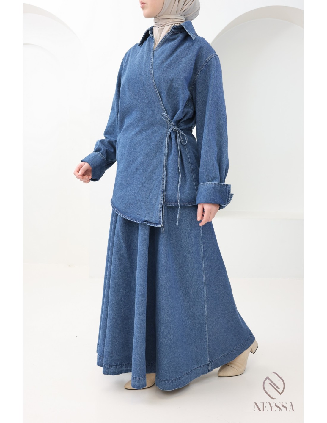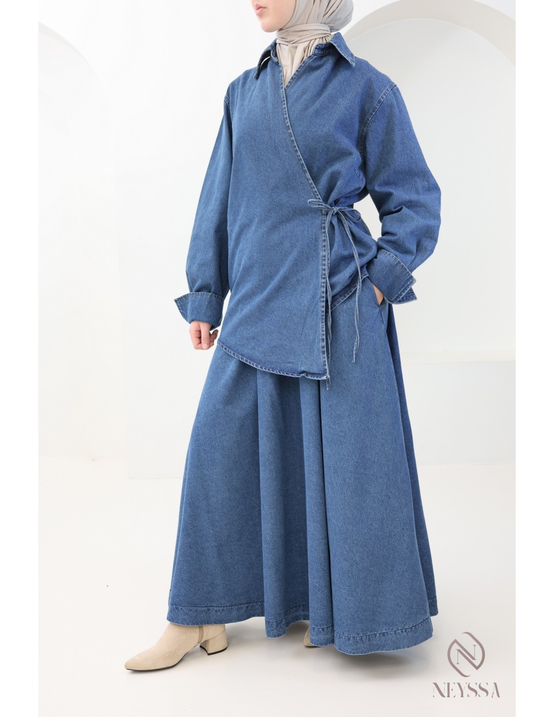 Voici cet ensemble jupe en jean pour femme pudique qui incarne l'élégance et le raffinement de la mode pudique.