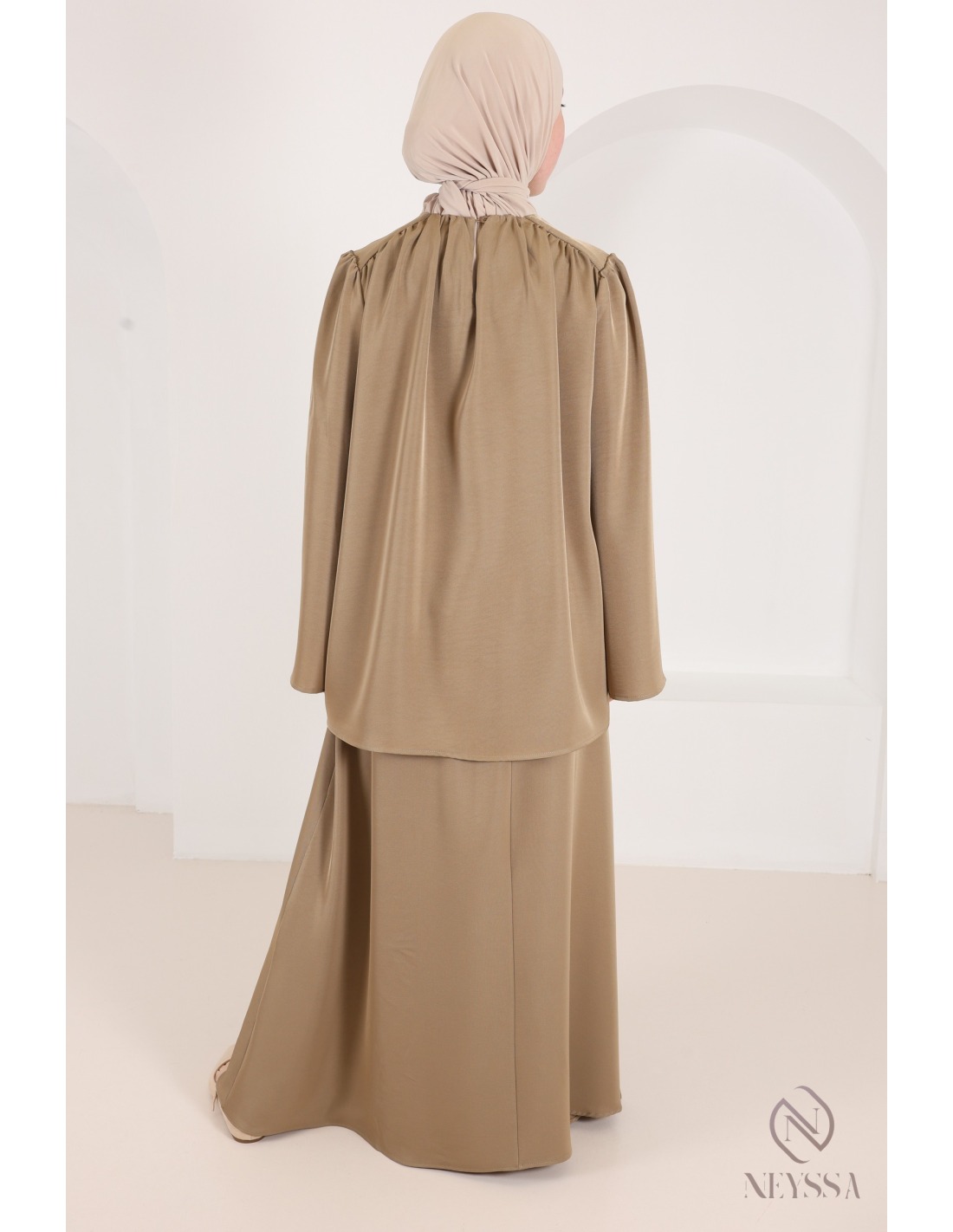 Cet ensemble jupe + blouse taupe à la coupe moderne pudique va sans aucun doute vous plaire :