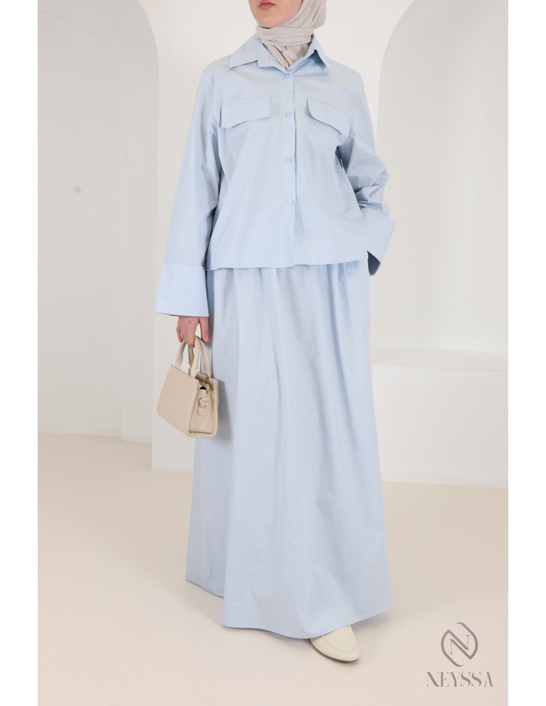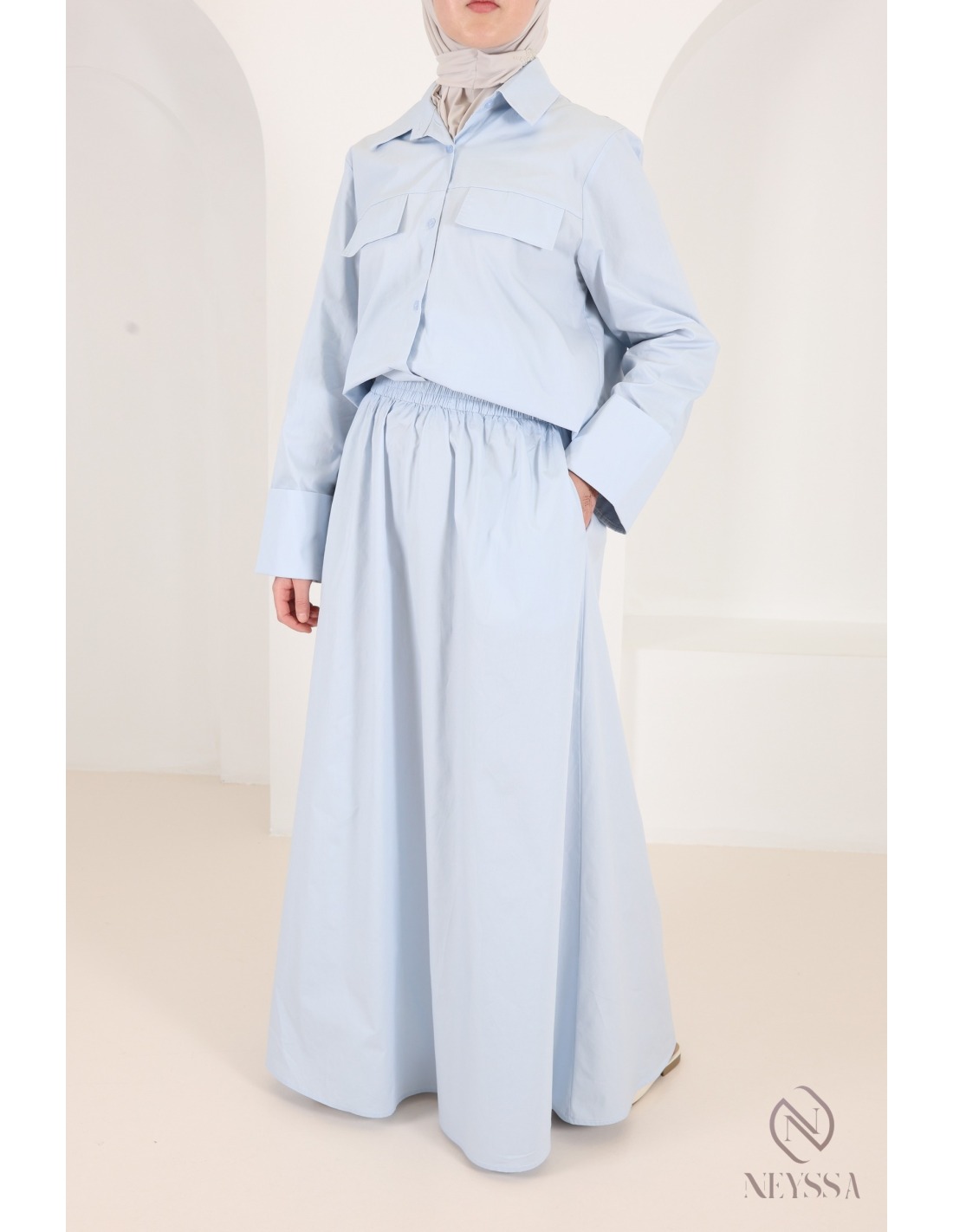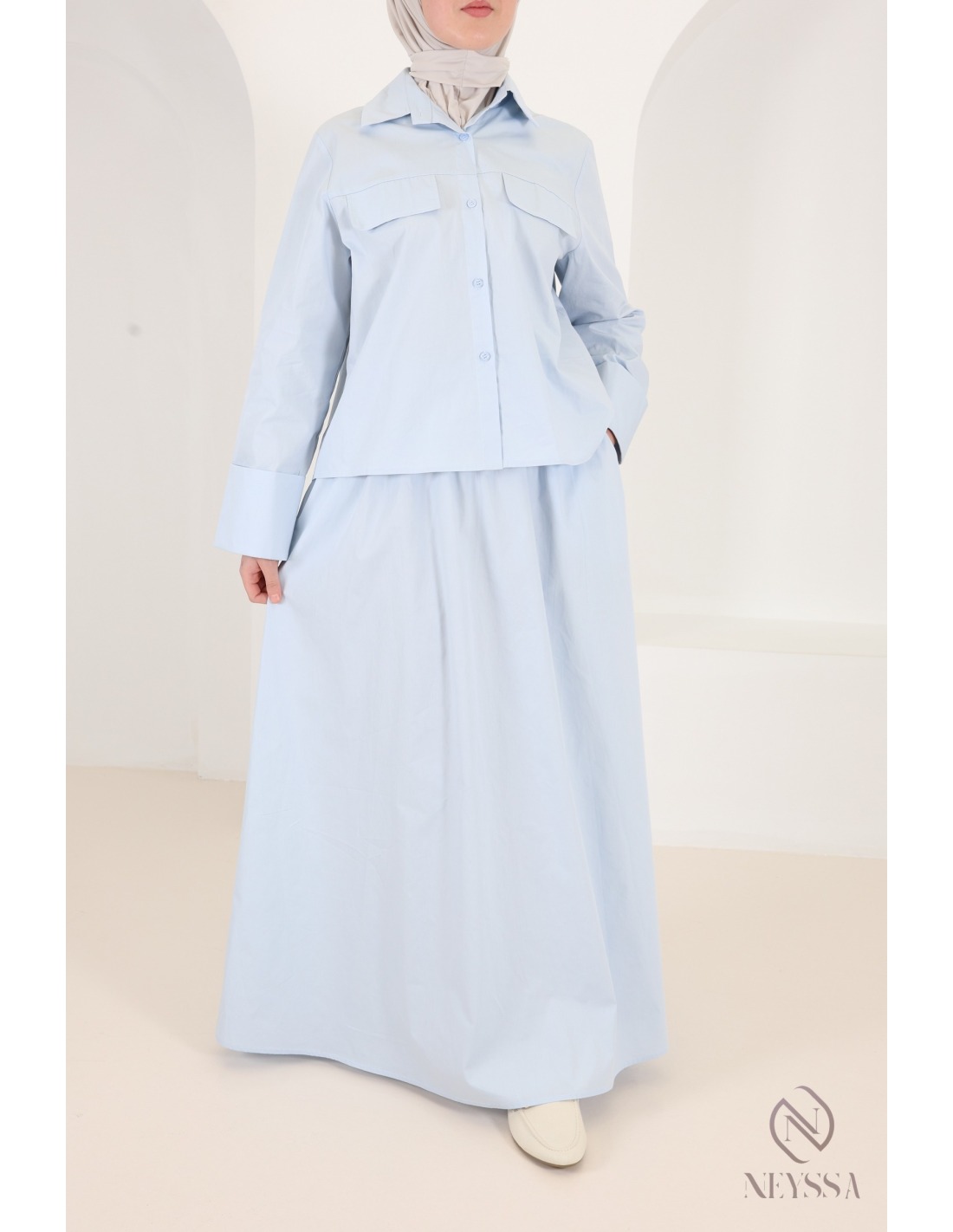 Ensemble 2 pièces jupe évasée et chemise manches longues baby blue