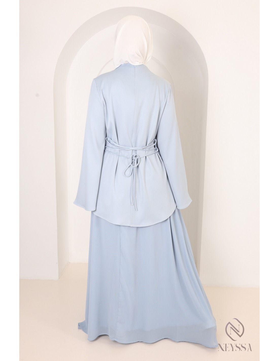 Ensemble baby blue blouse + jupe longue évasée bi matière