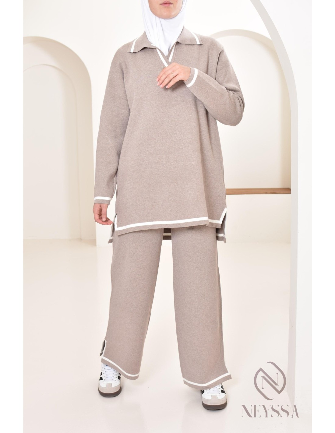 Ensemble en maille femme 2 pièces haut style polo avec son pantalon ample