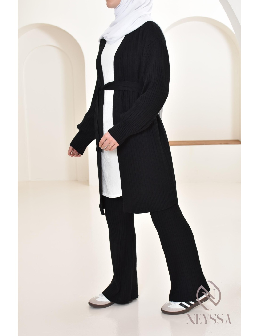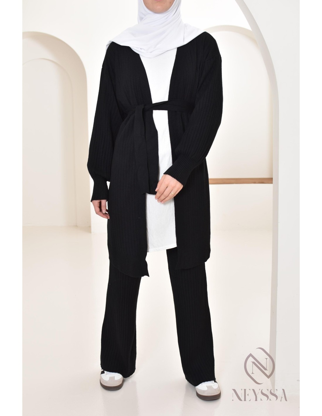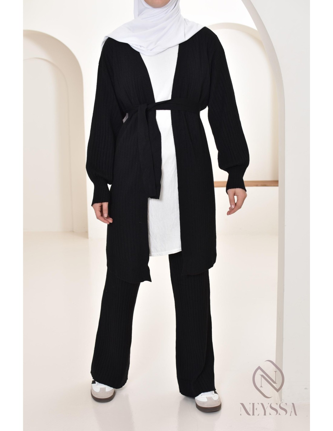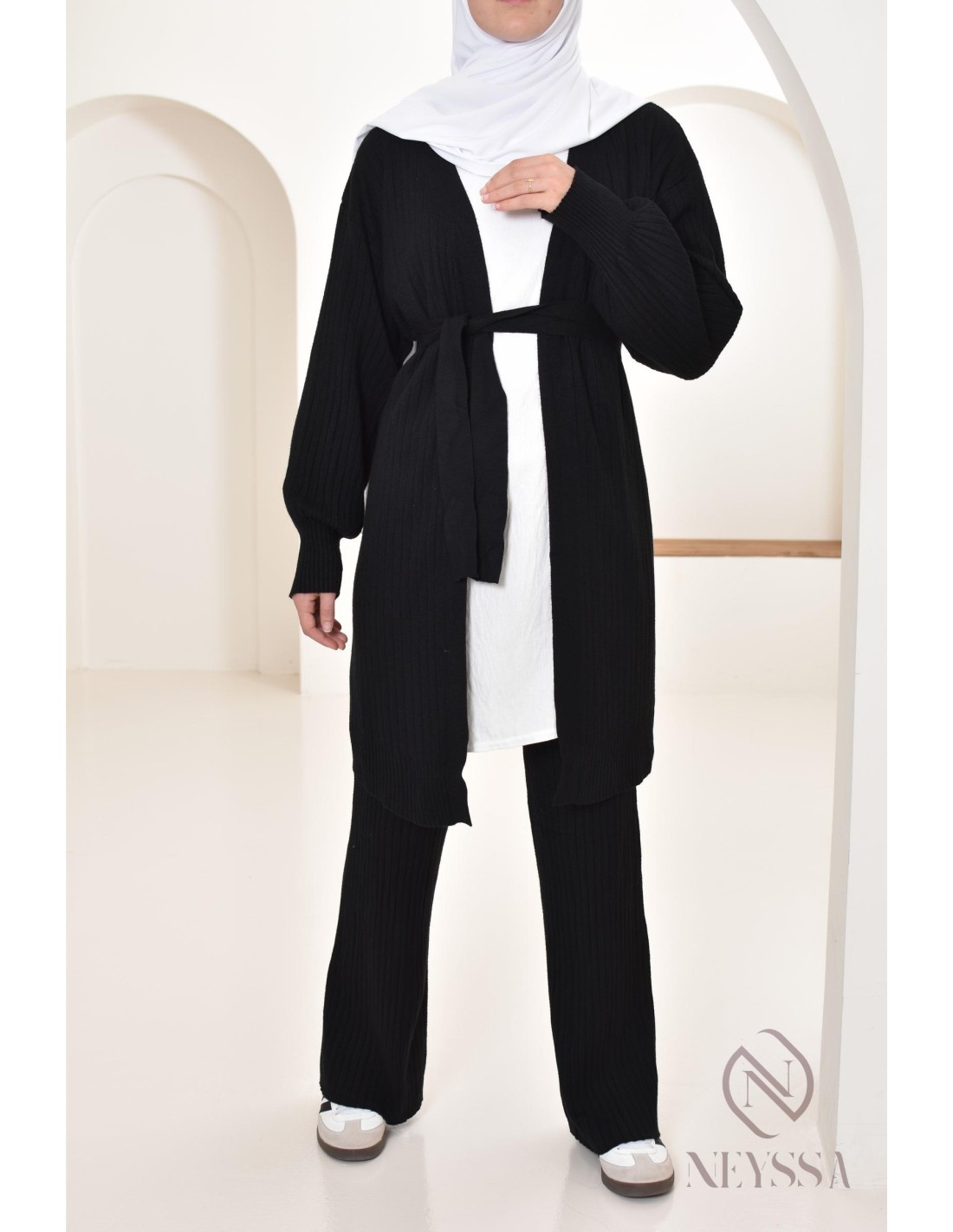 Ensemble femme voilée gilet long + pantalon en maille Une fois porté, vous l'adopterez tout l'hiver !