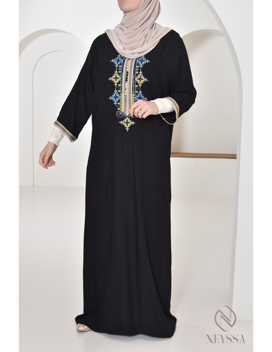 Cette robe orientale typiquement marocaine brodée d'une sfifa le long du buste est un must have dans le dressing de la femme.