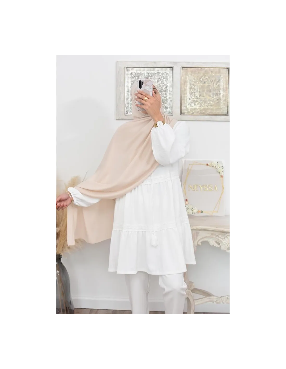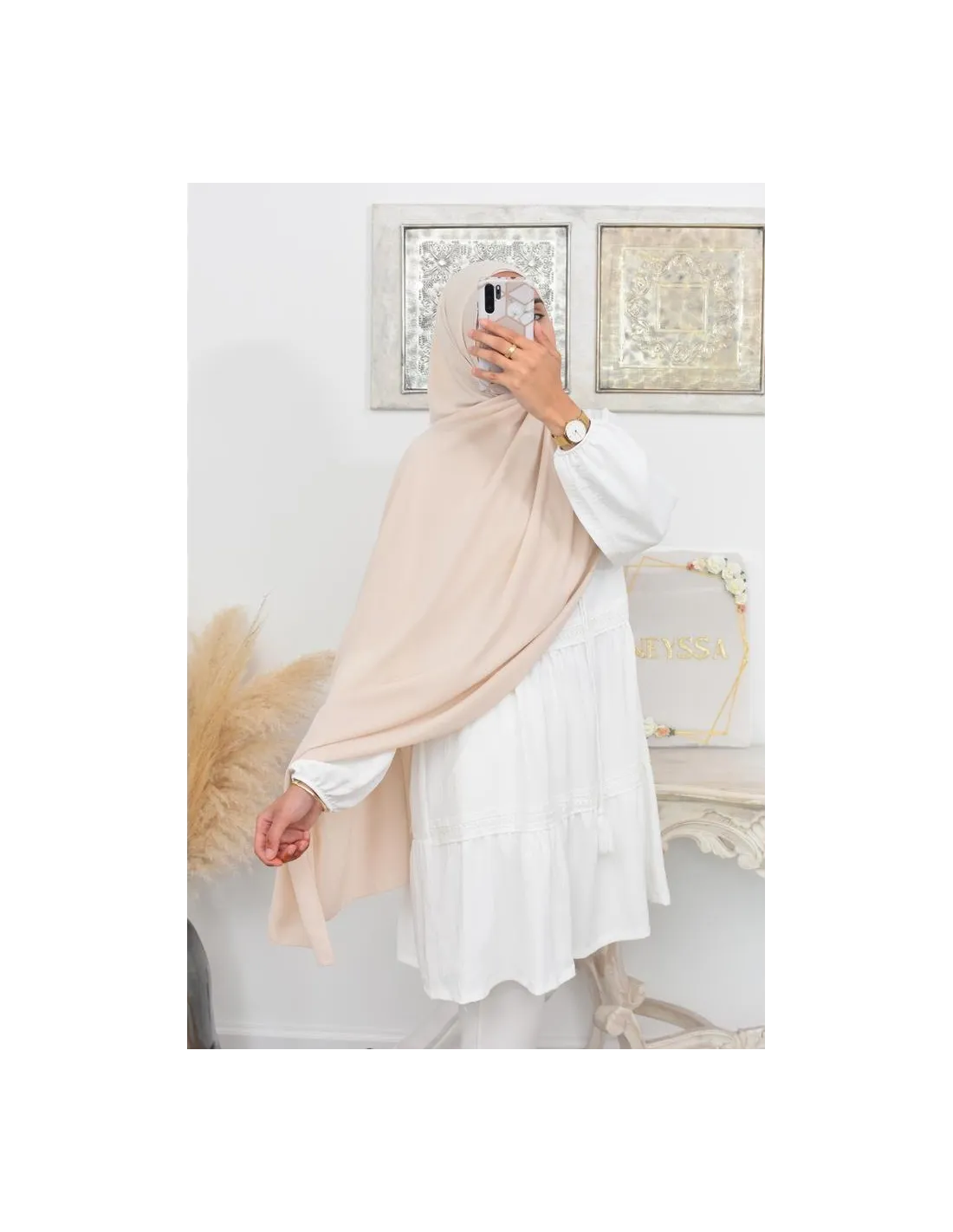 Magnifique matière, le tissu est doux, léger et fluide à la fois. Son principal atout est d'être INFROISSABLE. Fini le temps passé à repasser votre hijab ... enfilez votre châle et passez une merveilleuse journée ! Opaque, fluide et léger, ne vous souciez plus de porter un bonnet en dessous, ce hijab ne glisse pas.