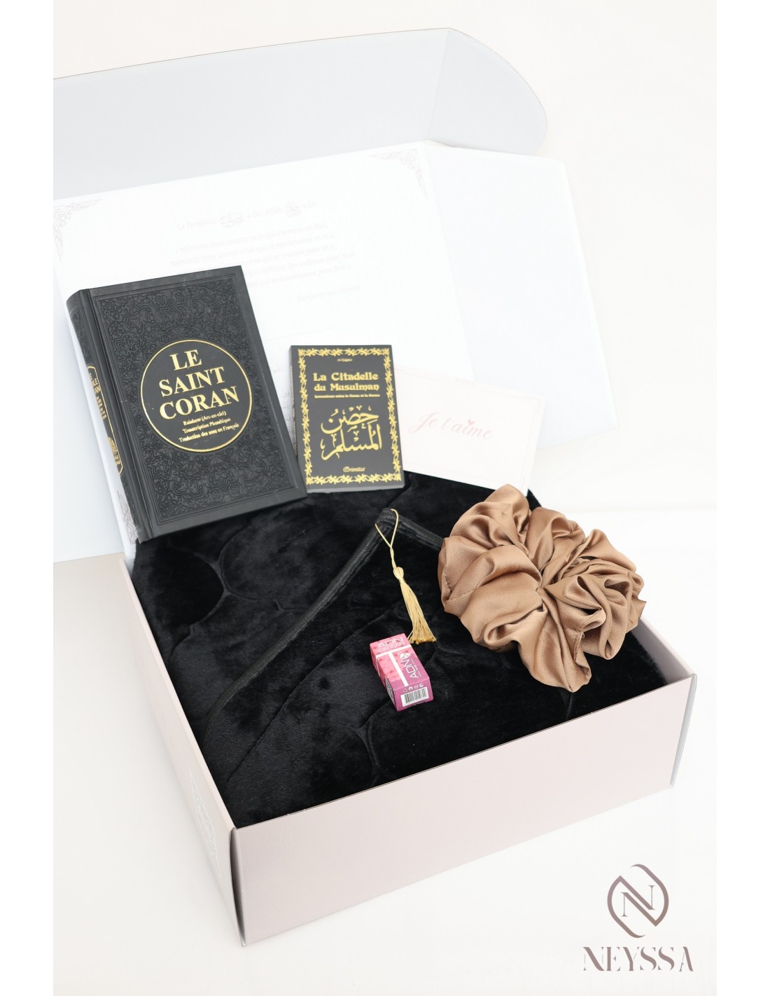 De quoi est composé la box cadeau tapis de prière + Coran Noir pour femme ?