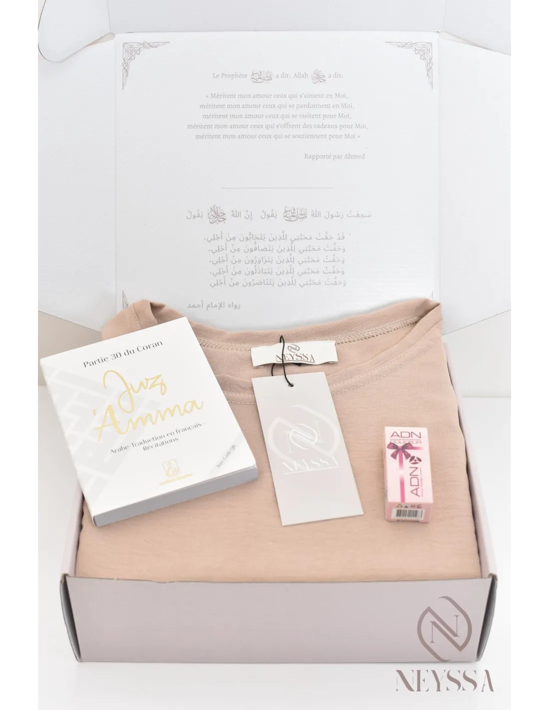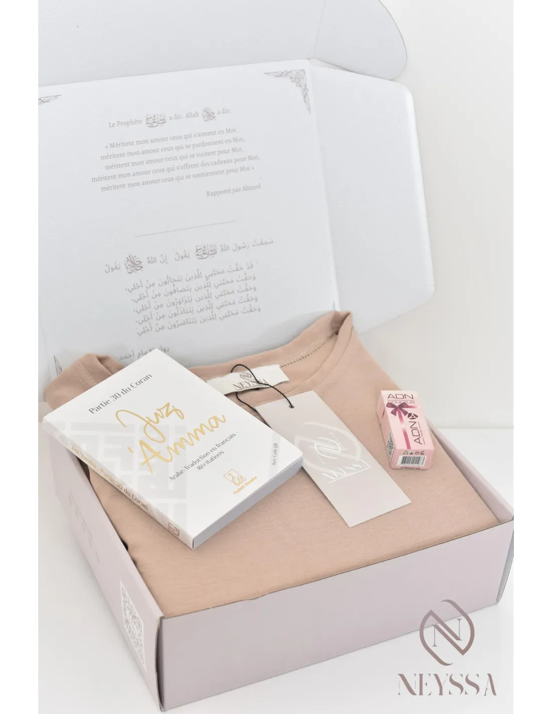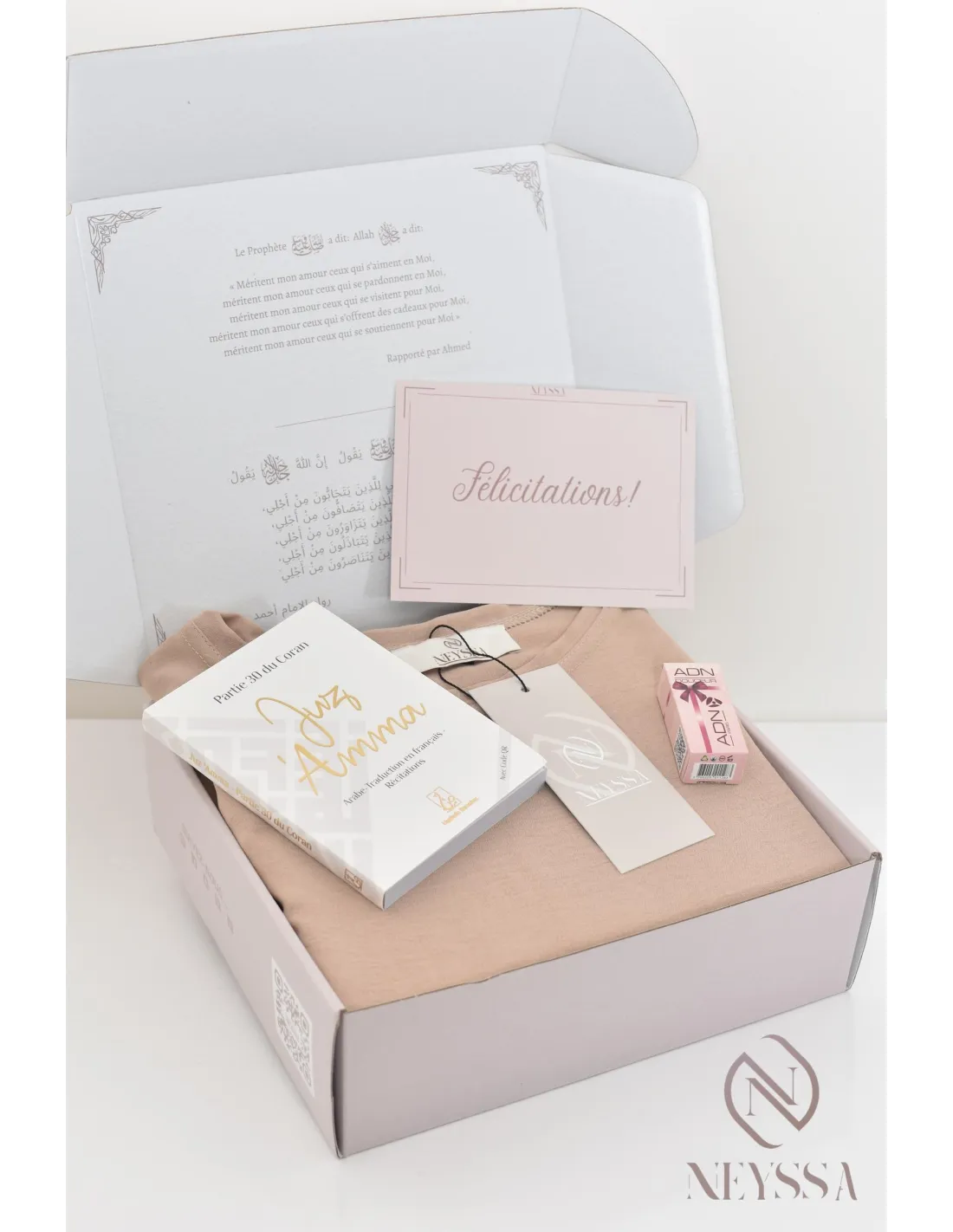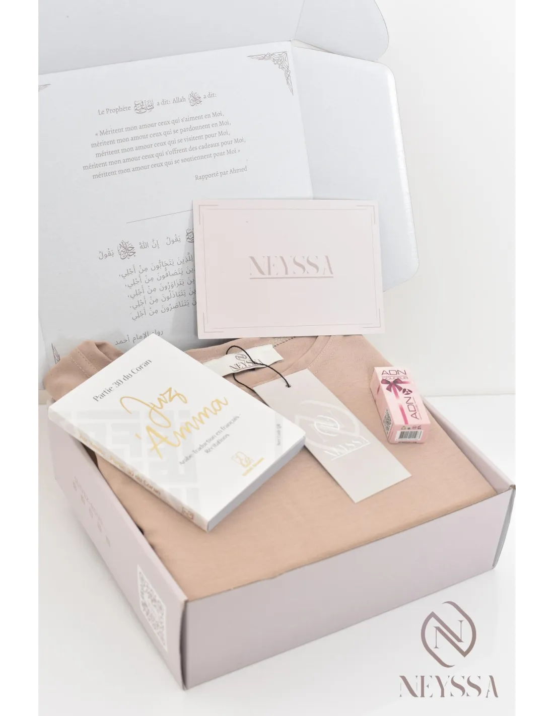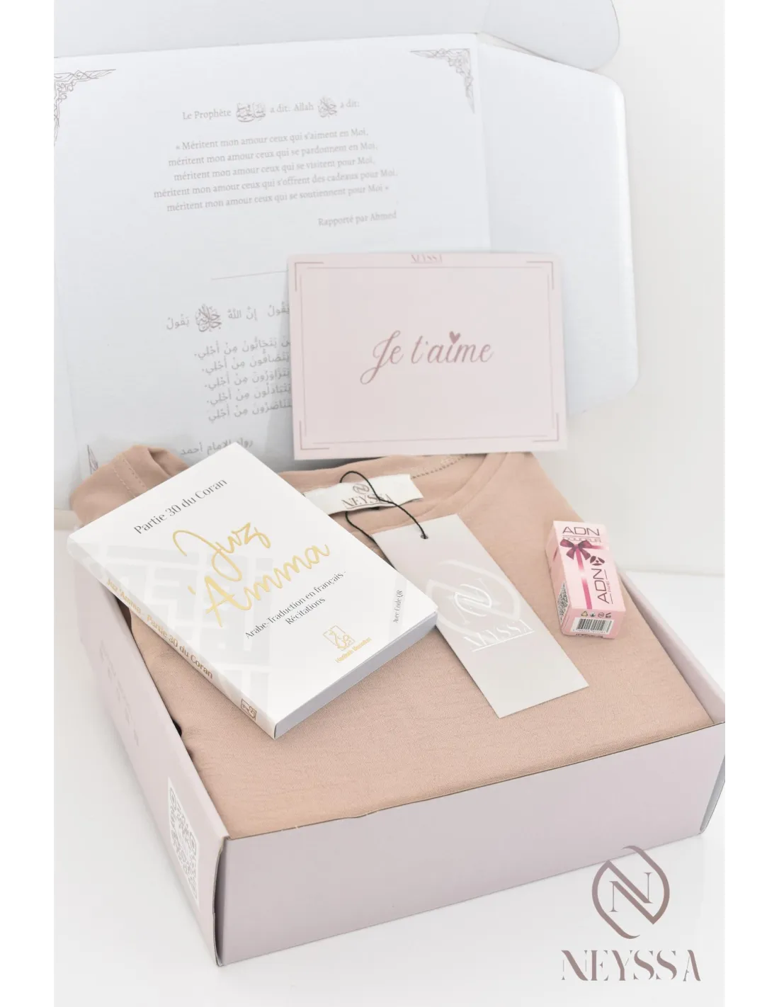 - Un coffret griffé Neyssa haut de gamme avec une carte personnalisable : je t'aime, ou Ramadan Mubarak, ou Eid Mubarak, ou félicitations... : il vous suffira simplement de remplir l'onglet personnalisation, nous écrirons le mot sur la carte avec grand plaisir !