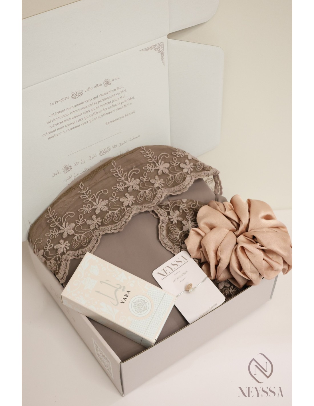 Box cadeau pour femme : abaya de prière taupe avec parfum yara femme hijabi