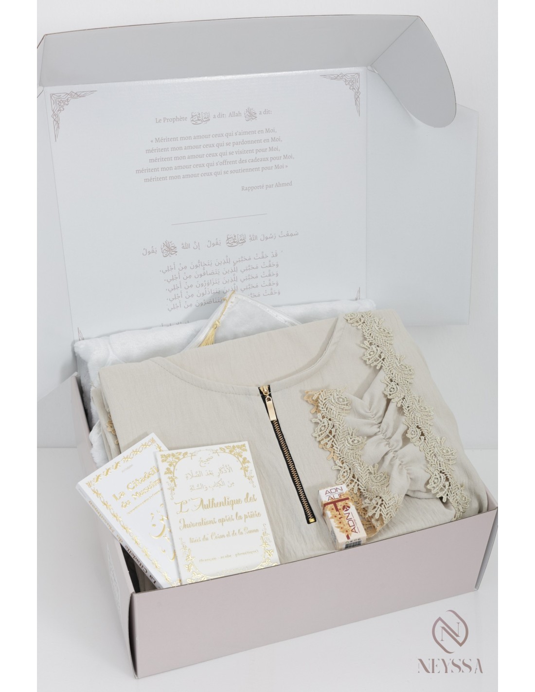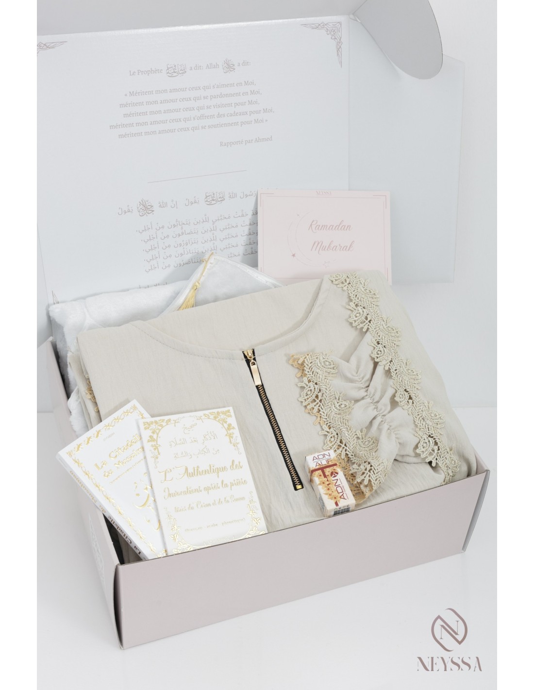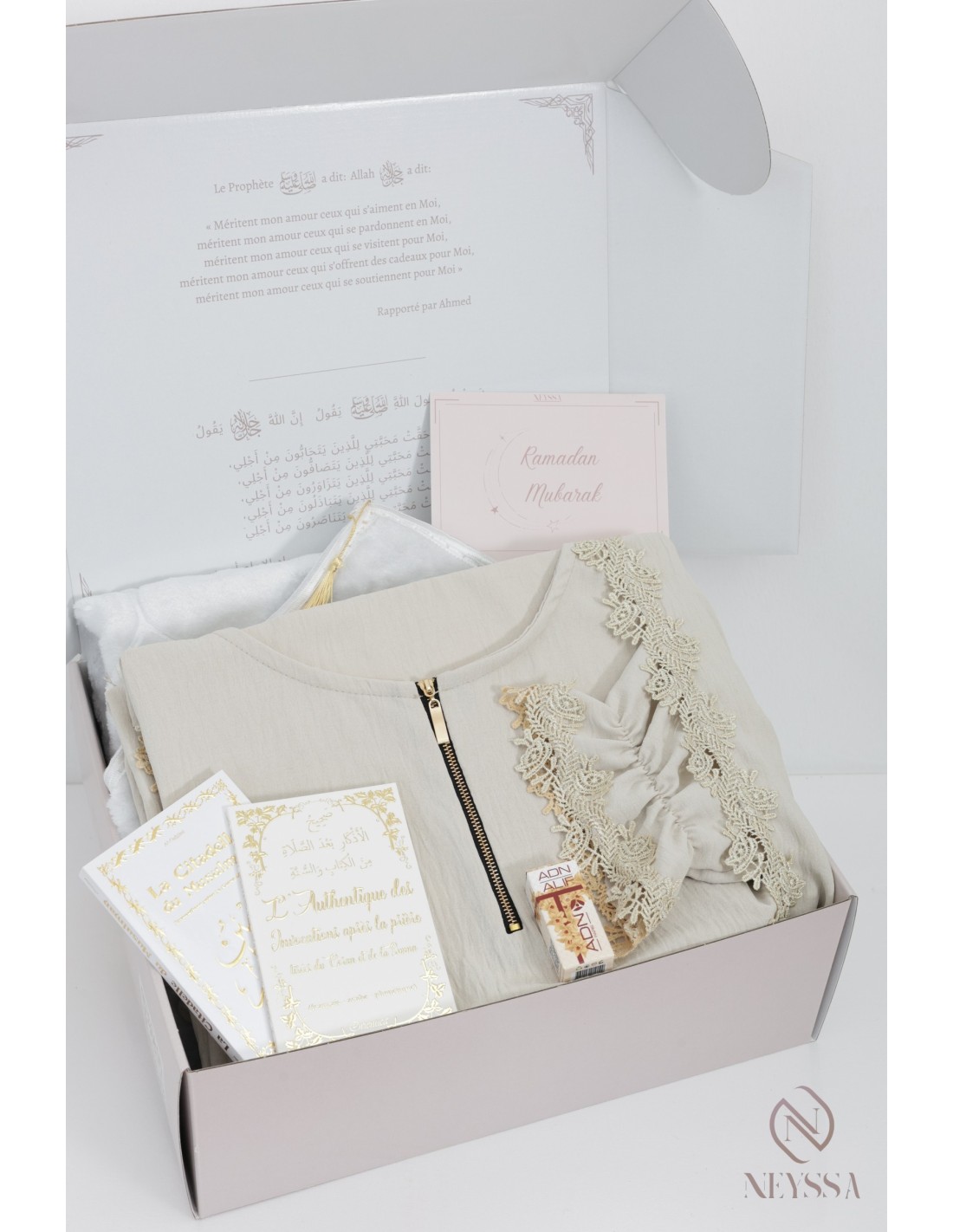 Livret d’invocations après la prière en arabe, phonétique et français. - Un coffret griffé Neyssa haut de gamme avec une carte personnalisable : je t'aime, ou Ramadan Mubarak, ou Eid Mubarak, ou félicitations... : il vous suffira simplement de remplir l'onglet personnalisation, nous écrirons le mot sur la carte avec grand plaisir !