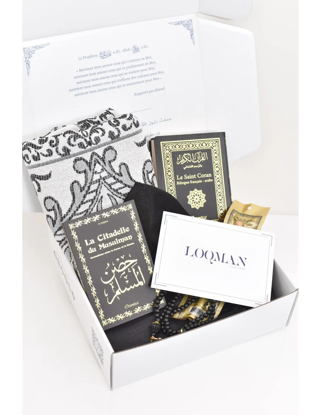 Un coffret griffé Loqman avec de jolies inscriptions : Le prophète Muhamad aleyi salat wa salam a dit : Allah a dit : " Méritent mon amour ceux qui s'aiment en Moi, méritent mon amour ceux qui se pardonnent en Moi, méritent mon amour ceux qui se visitent pour Moi, méritent mon amour ceux qui s'offrent des cadeaux pour Moi, méritent mon amour ceux qui se soutiennent pour Moi. " Rapporté par Ahmed