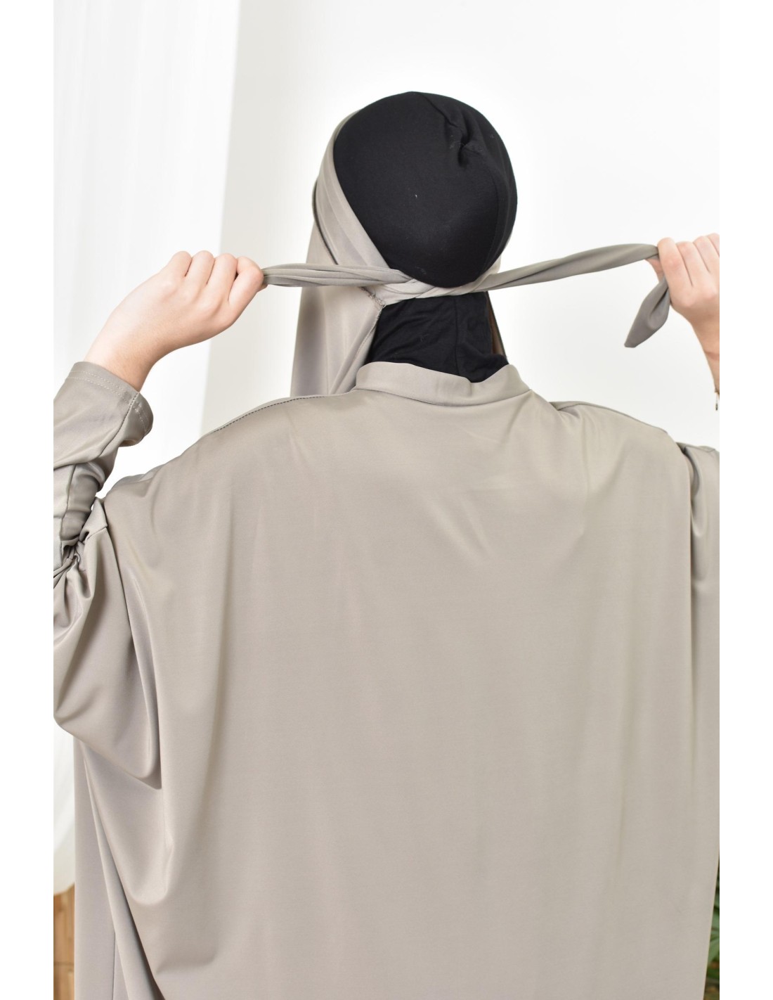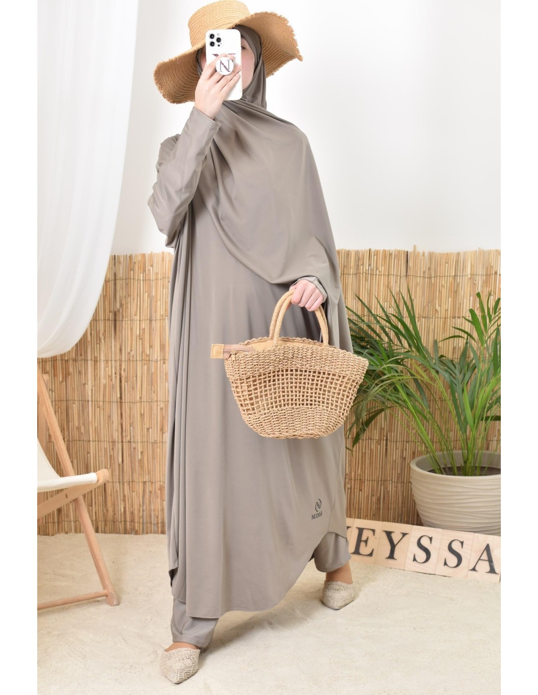 Jilbab de bain burkini taupe tendance pour femme avec hijab à nouer