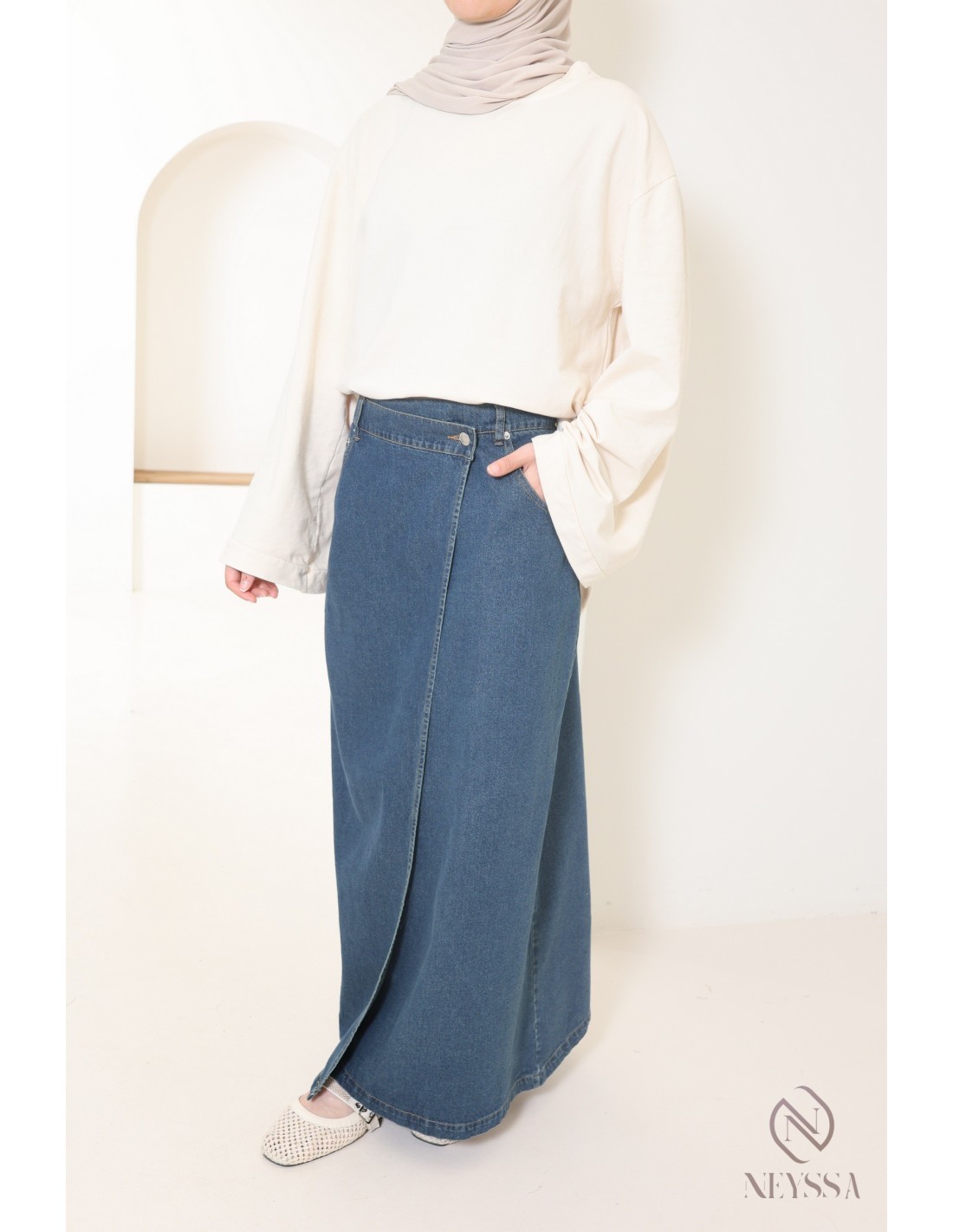 Jupe longue en jean style portefeuille idéale femme voilée