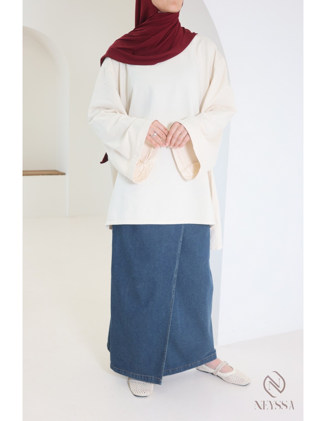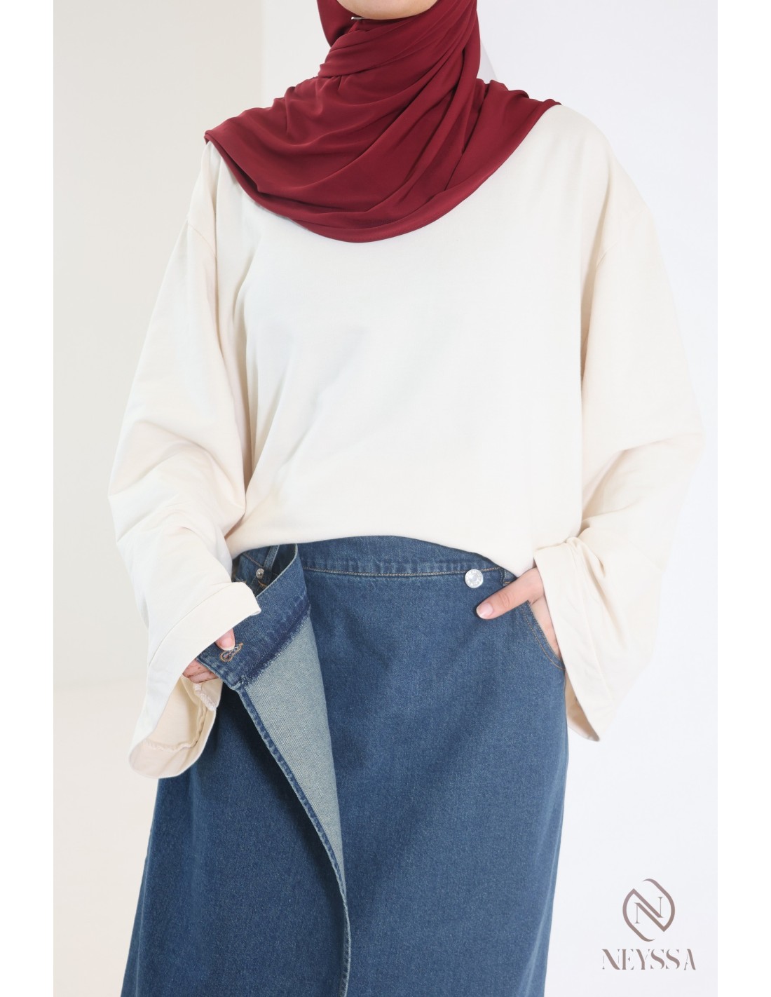 Nous avons celle qui vous faut ! Optez pour cette jupe longue portefeuille jean brut droite dans notre catégorie vêtement hijabi tendance.