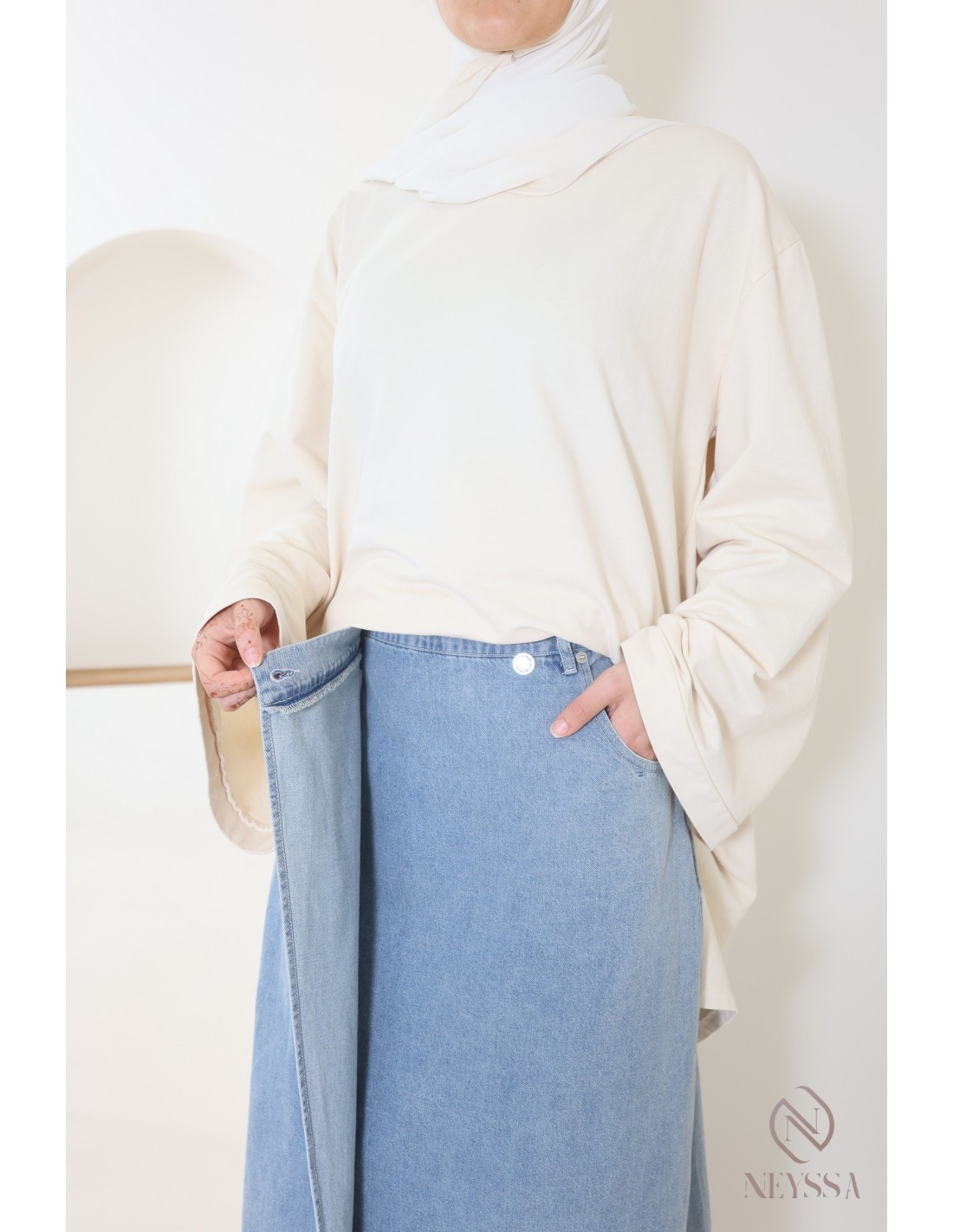 Nous avons celle qui vous faut ! Optez pour cette jupe longue portefeuille jean brut droite dans notre catégorie prêt à porter hijabi tendance.
